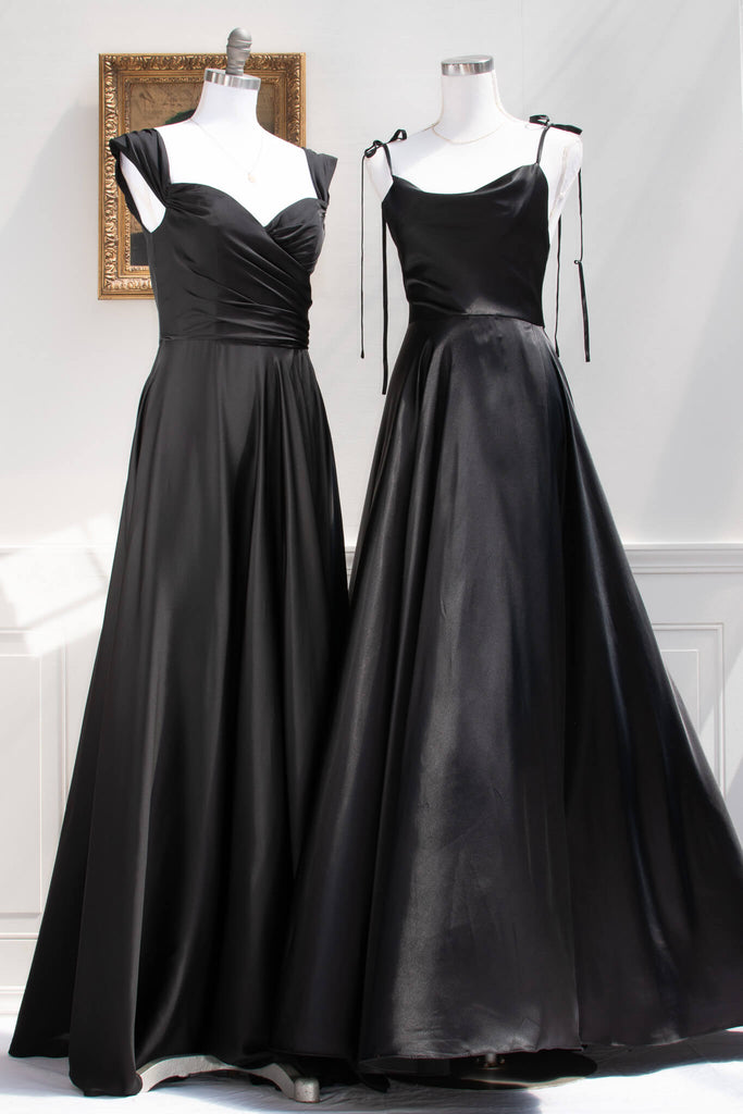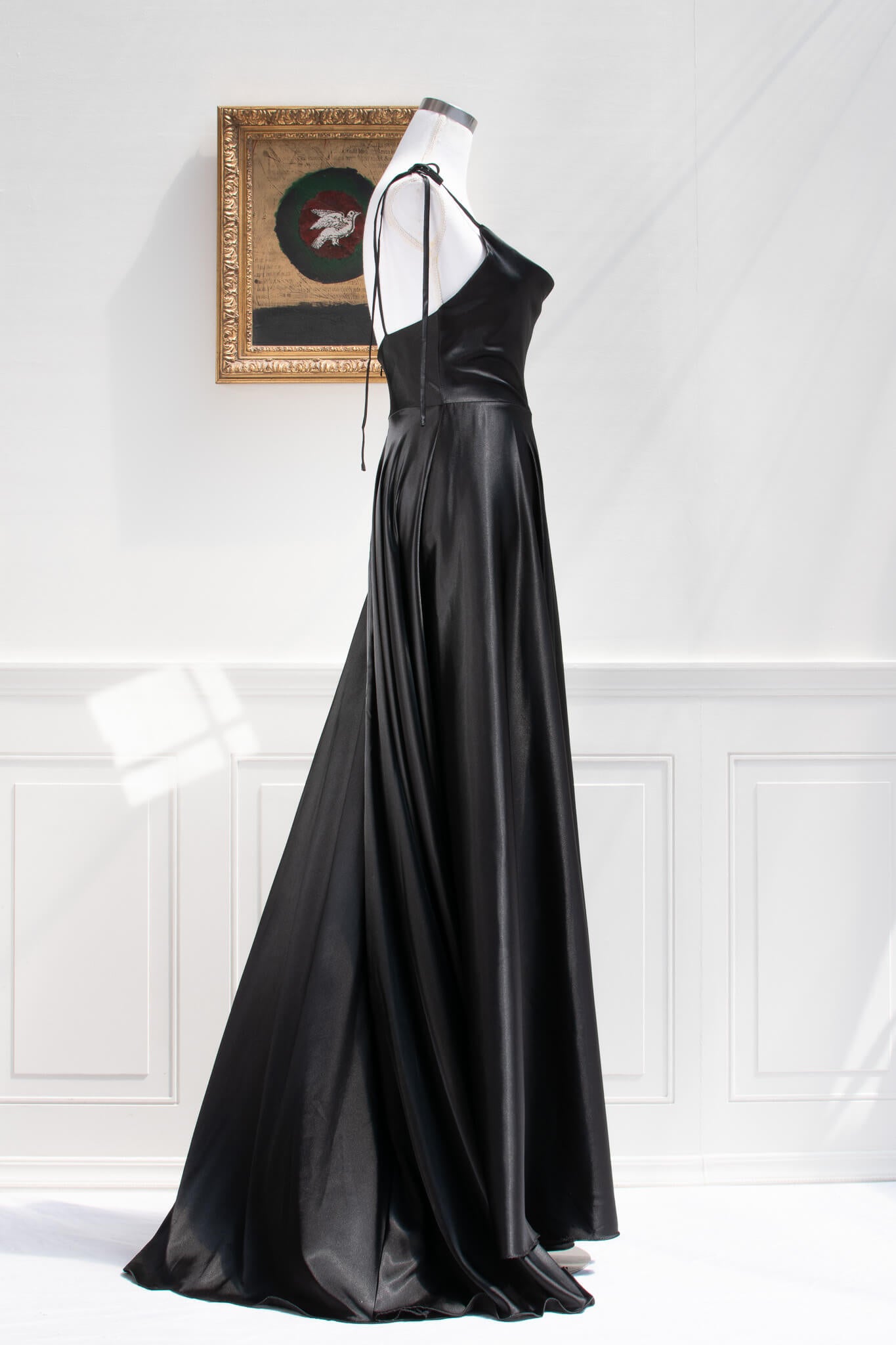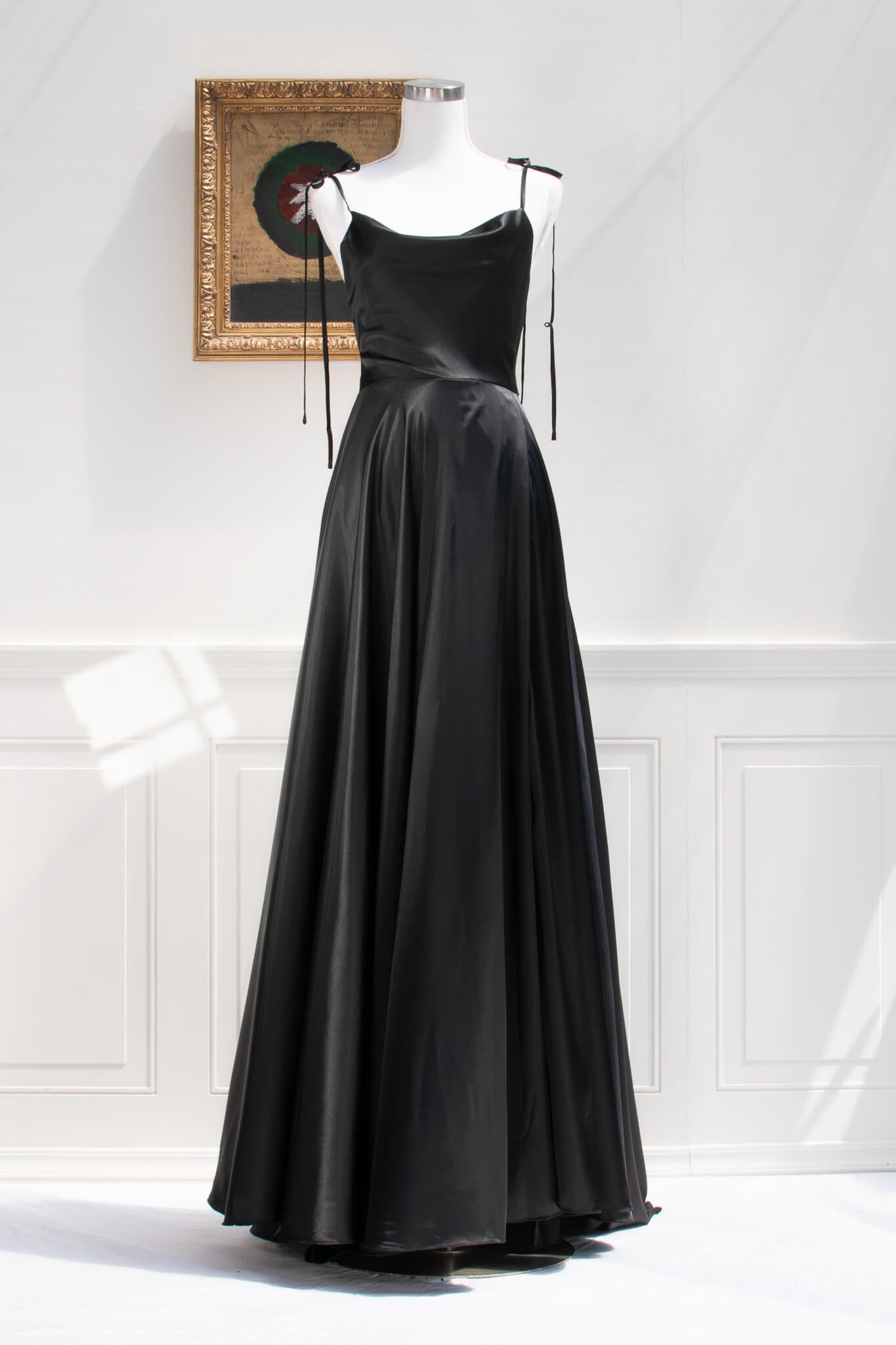 Channel Old-Hollywood glamour at your next soirée in the stunning Aphrodite Dress. Featuring a sweeping full, black satin skirt, flattering cowl-neckline, and delicate tie shoulders, the Aphrodite will turn heads with its dramatic side slit. Paired with a clutch and heels, this dress will be the look of your dreams!  Final Sale Only- not eligible for return or exchange.
