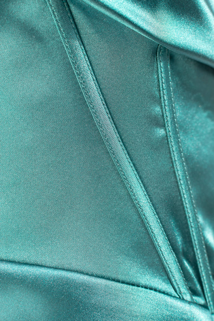 An off-the-shoulder stunner for prom and formal season, the statuesque Venus de Milo Dress in emerald green satin features a cinched corset waist, a flattering cowl neckline, figure-hugging bias-cut skirt, and a dramatic side slit. As this dress is fitted with a corset waist, please check measurements carefully prior to purchase. Pictured with the Aphrodite Emerald Green Satin Dress. Please Note- This item is final sale only.