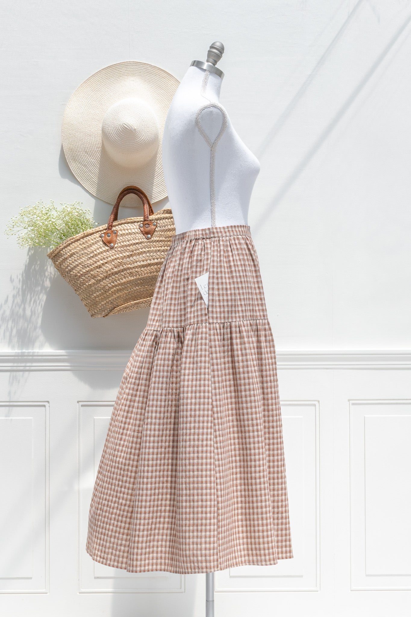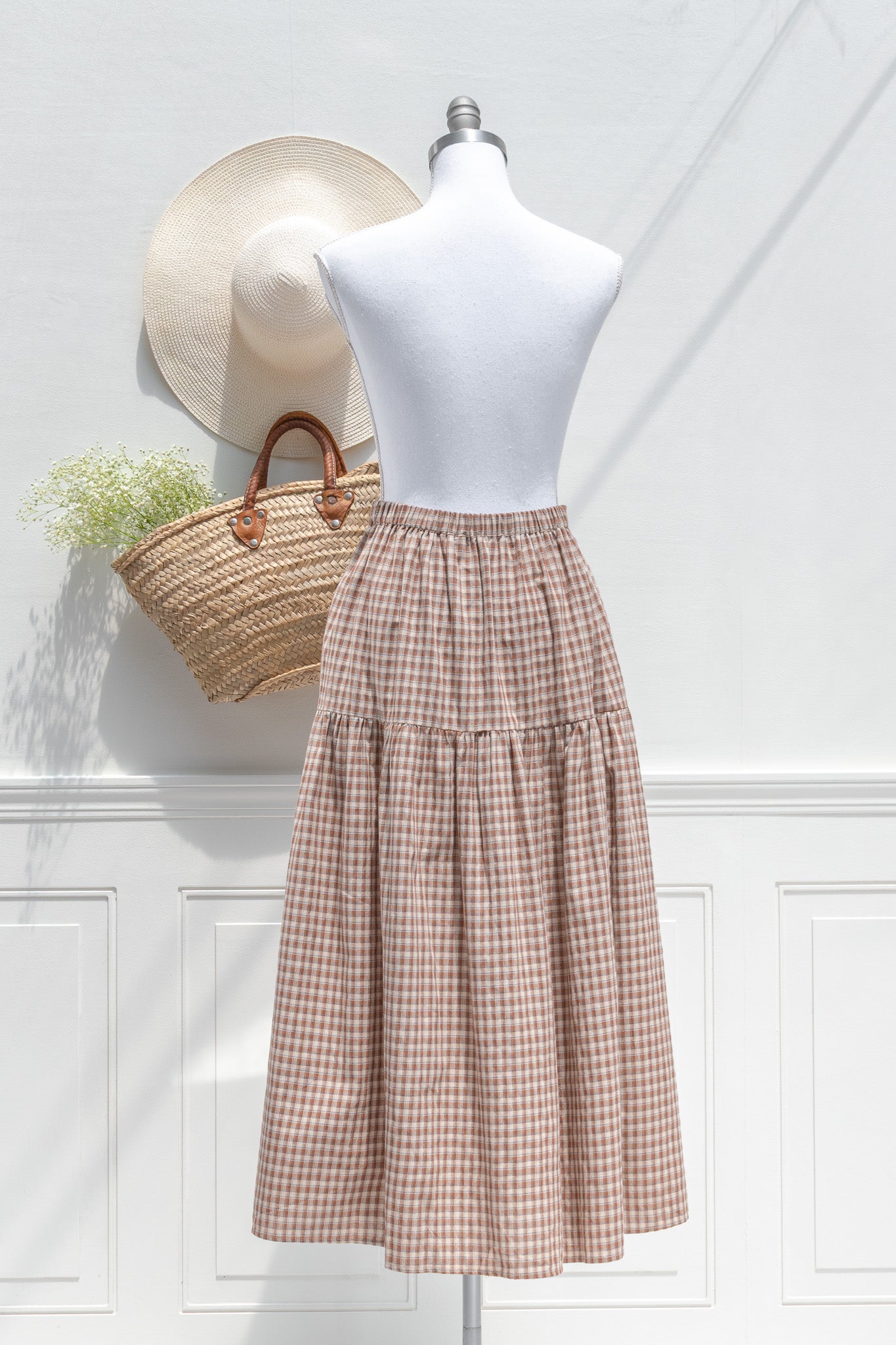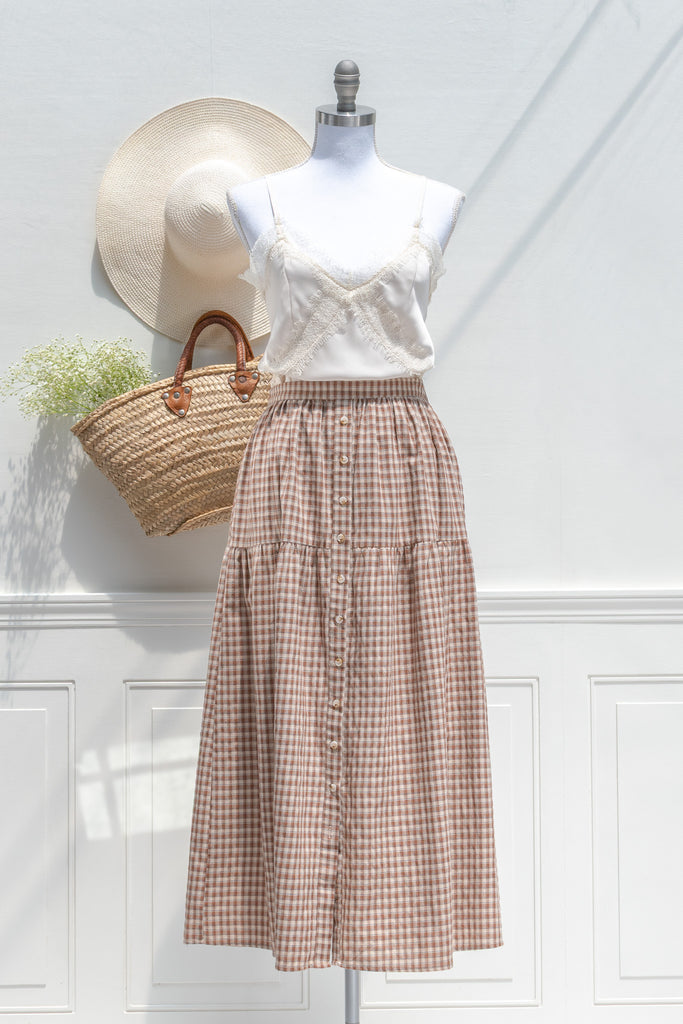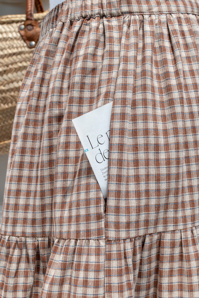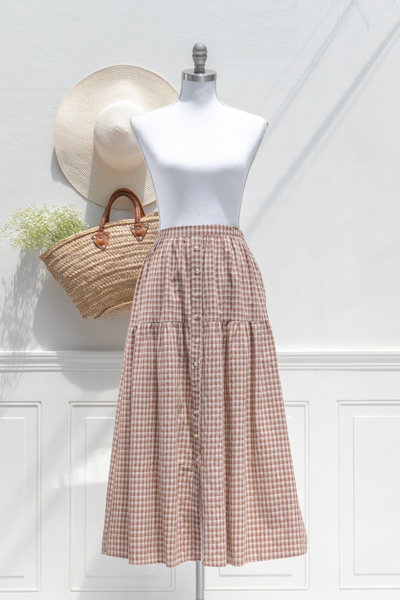 Perfectly autumnal, the Rowan skirt in a plaid cotton-blend features a button-up front, side-seam pockets, and a half-elastic waistband for a comfortable fit.