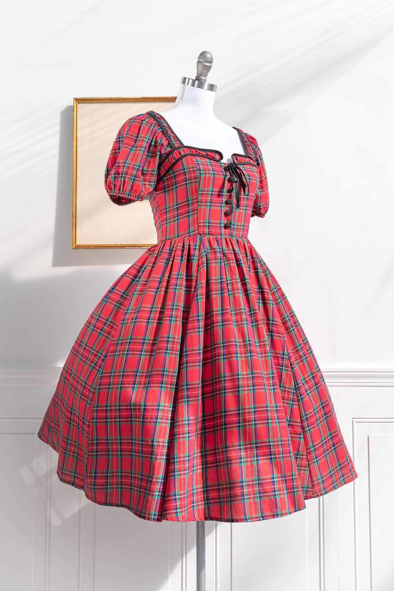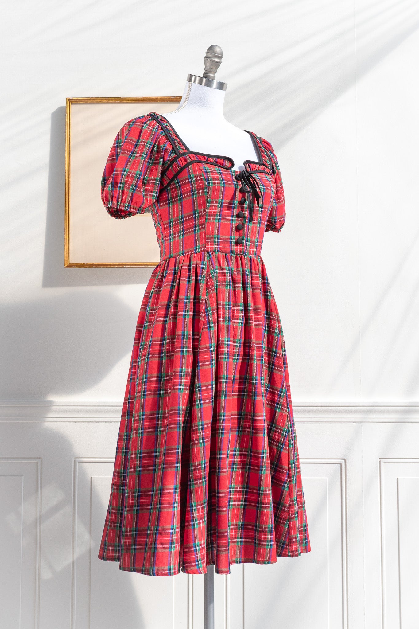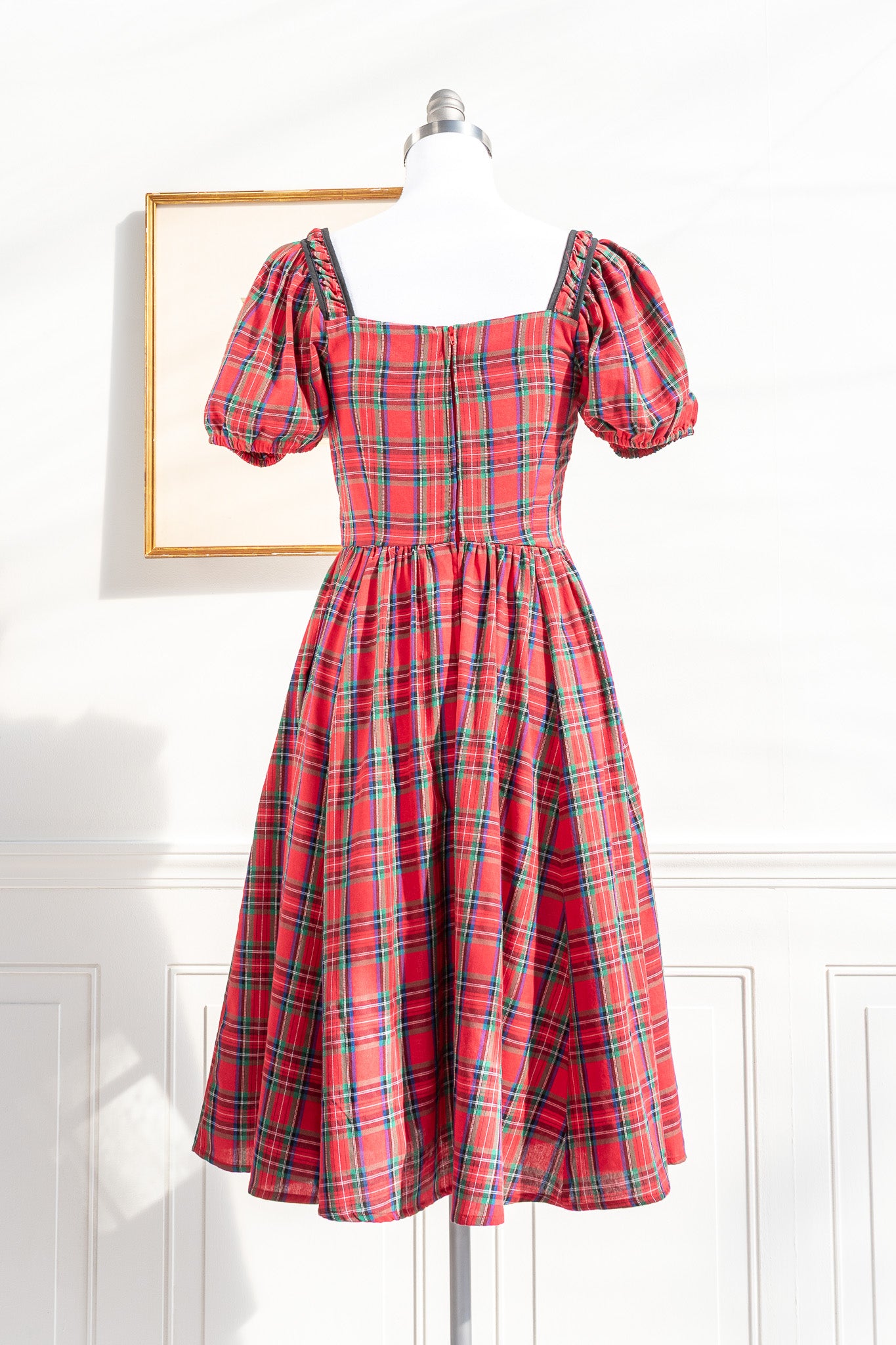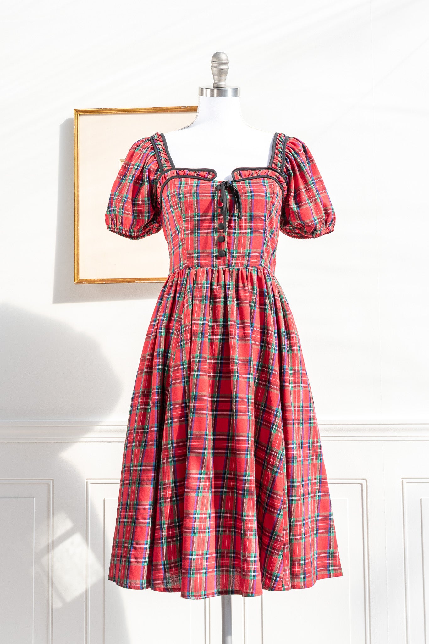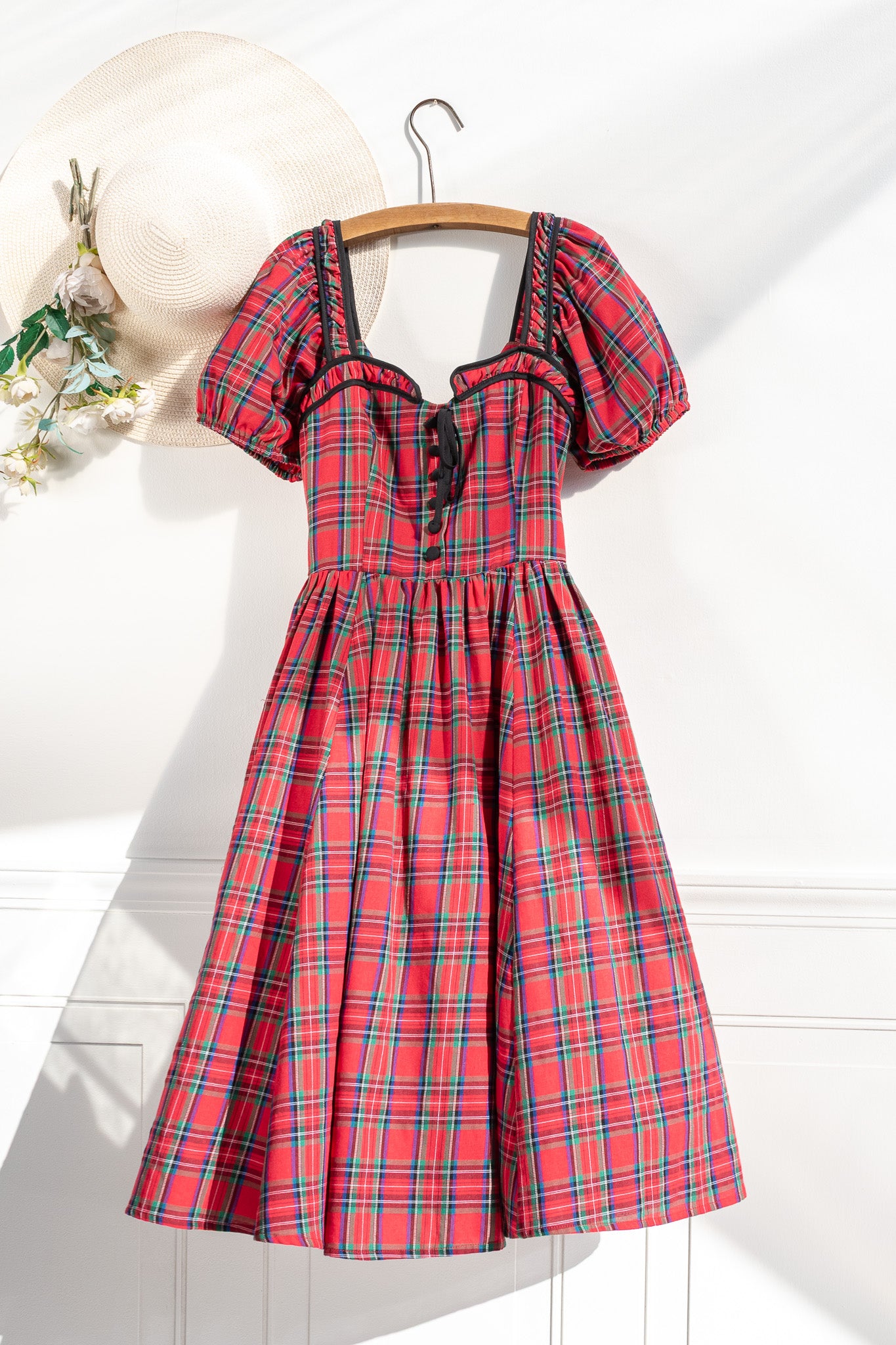 A festive classic with a romantic twist. The Holly plaid midi dress features a softly structured bodice with contrast piping and covered buttons, a sweetheart-square neckline with petite tie, and puff sleeves.