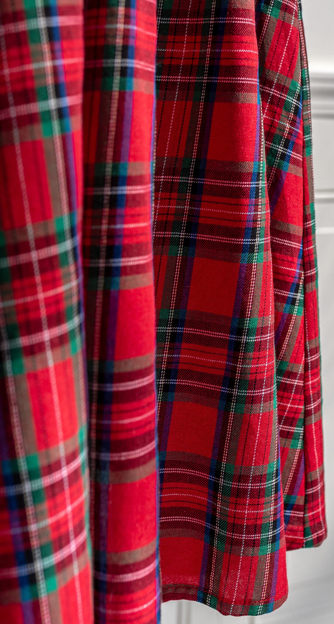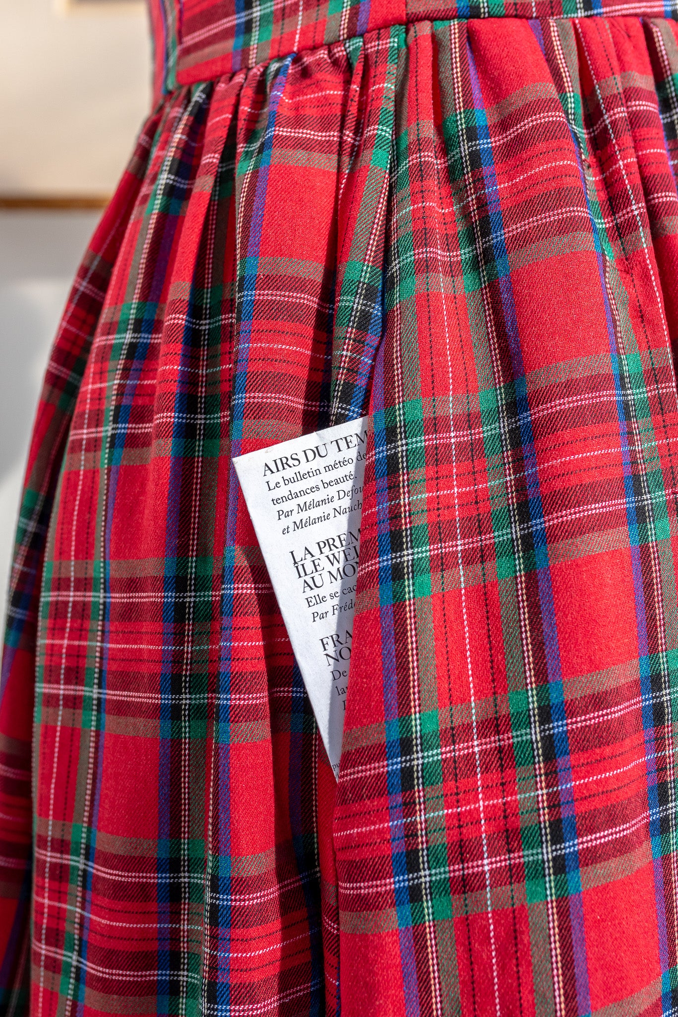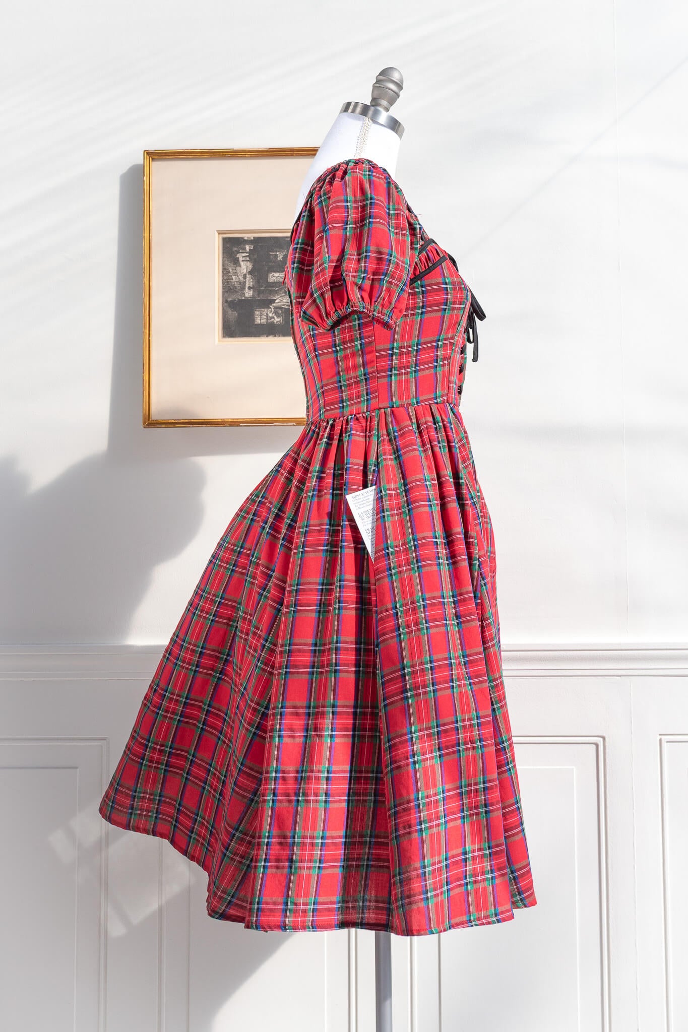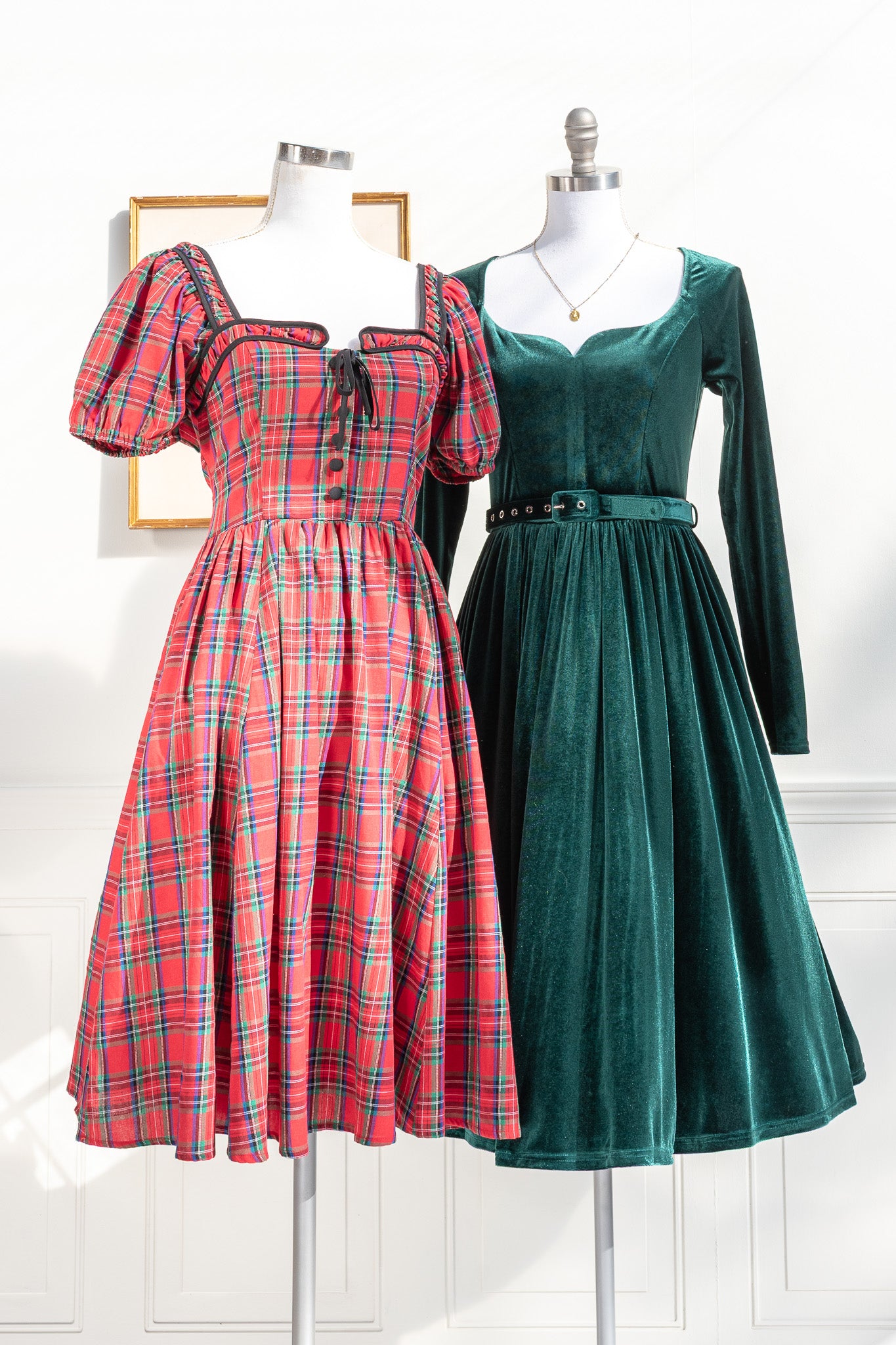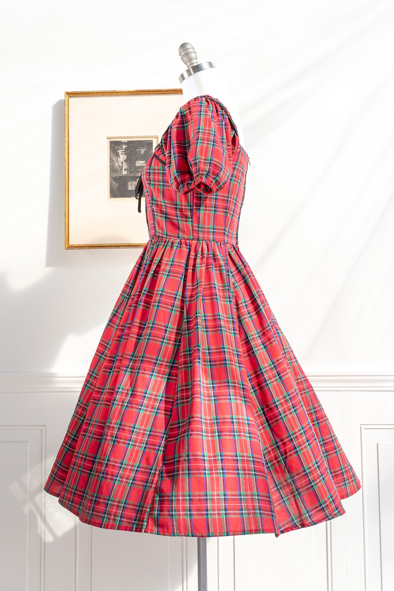 A festive classic with a romantic twist. The Holly plaid midi dress features a softly structured bodice with contrast piping and covered buttons, a sweetheart-square neckline with petite tie, and puff sleeves.