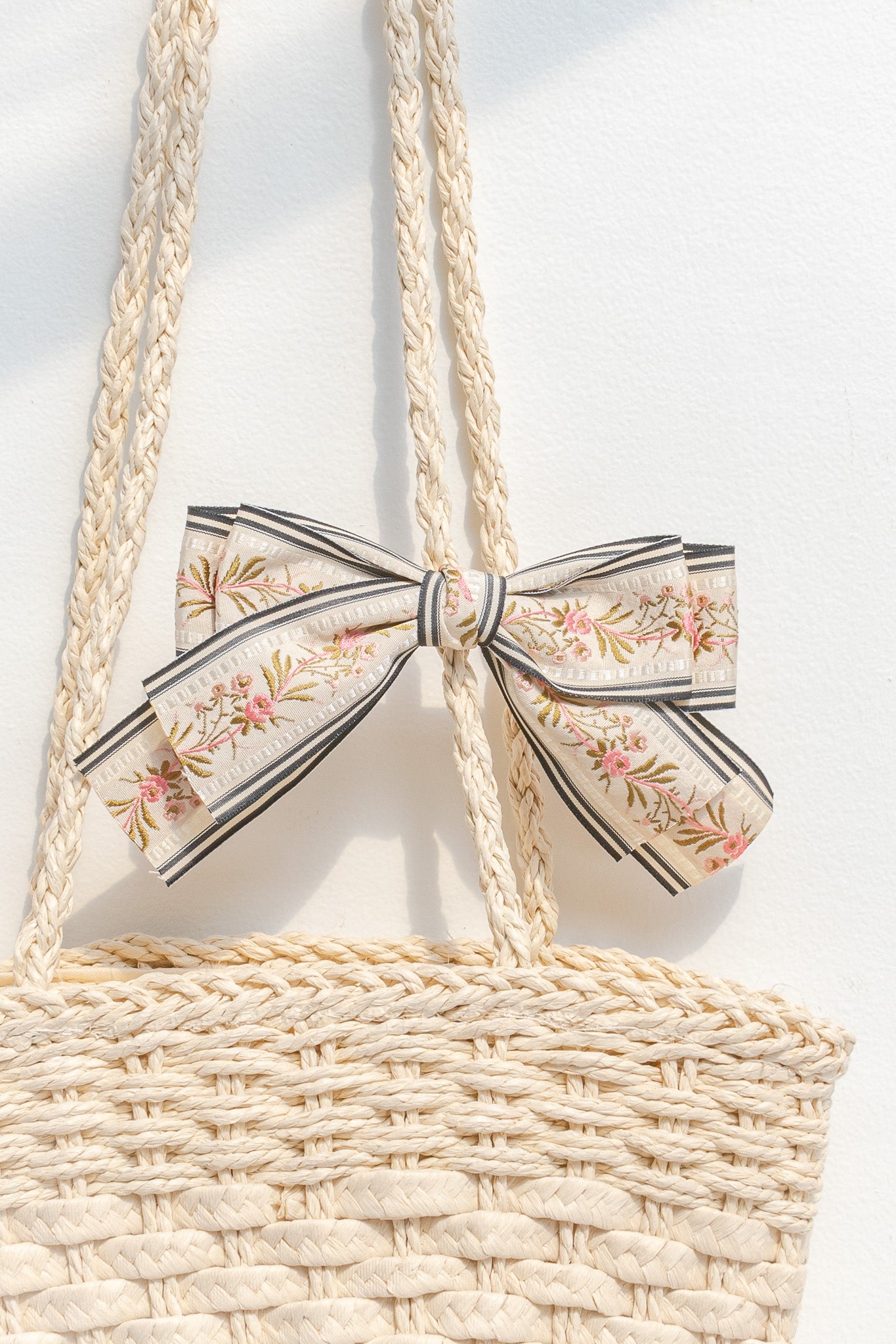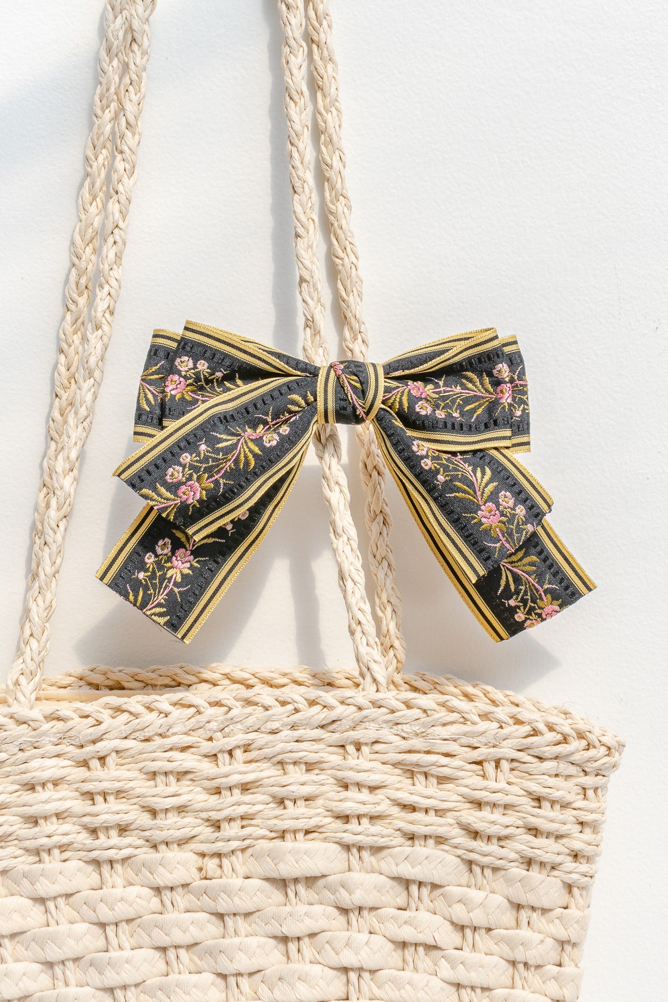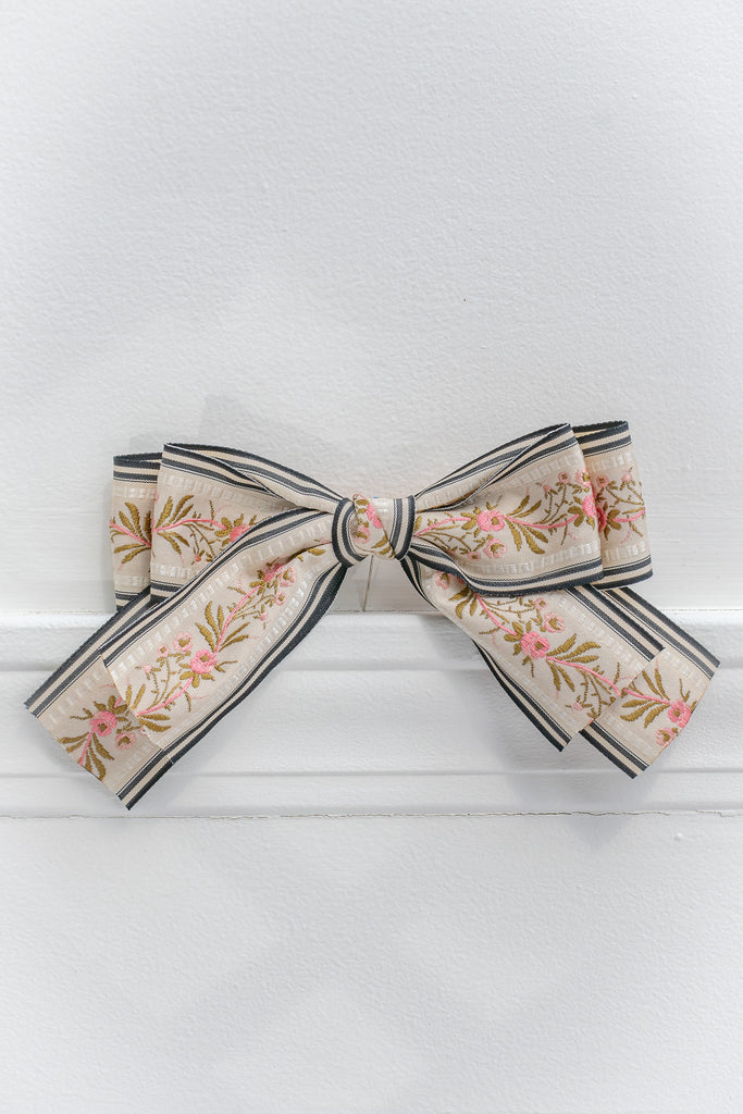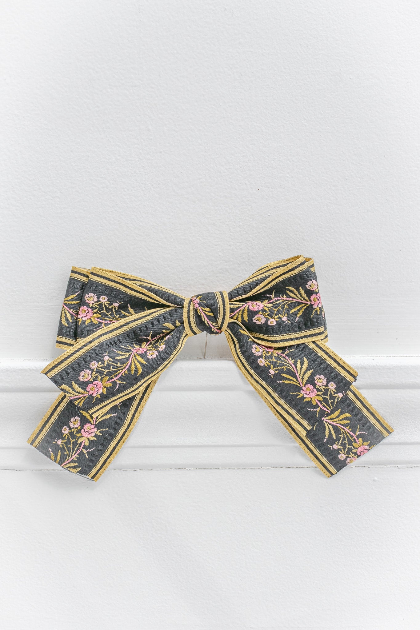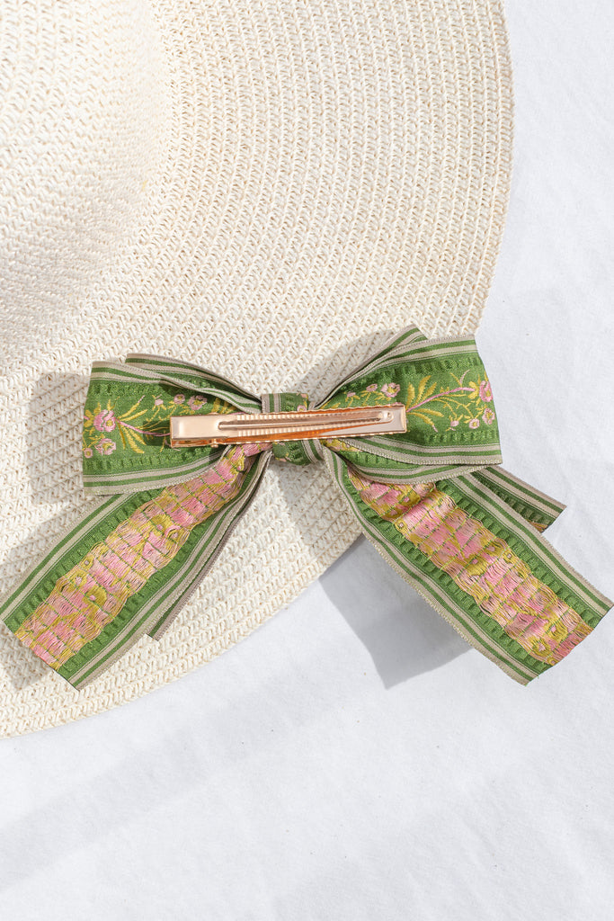 This sweet ribbon hair bow features a folk-inspired floral motif and a clip for a secure hold. Available in Ivory, Green, and Black. Please Note- This item is final sale only.