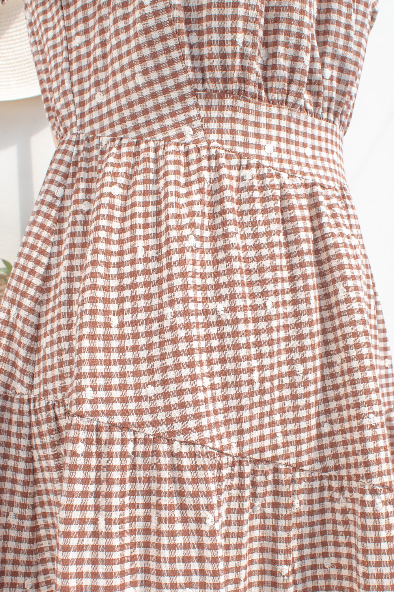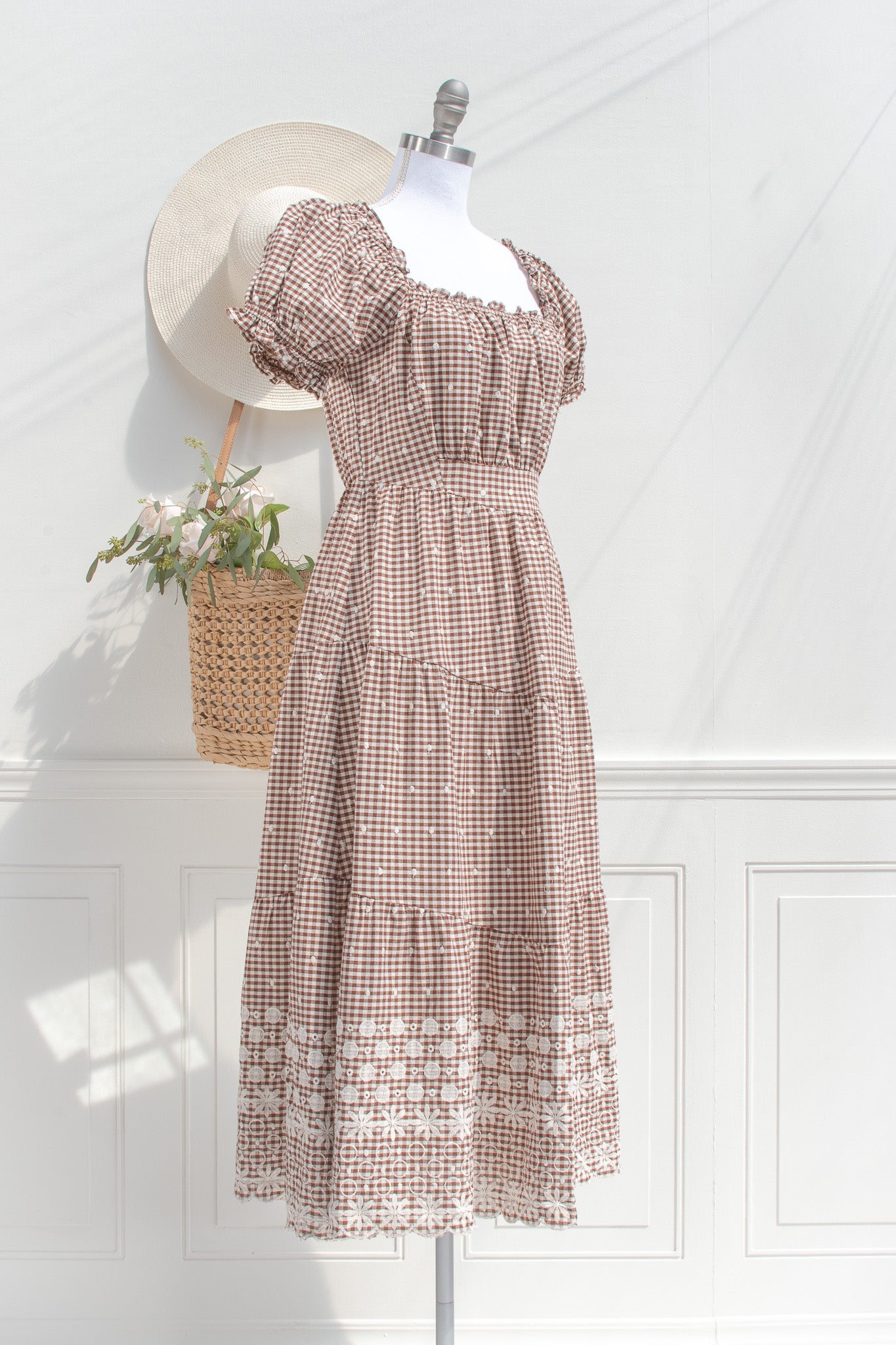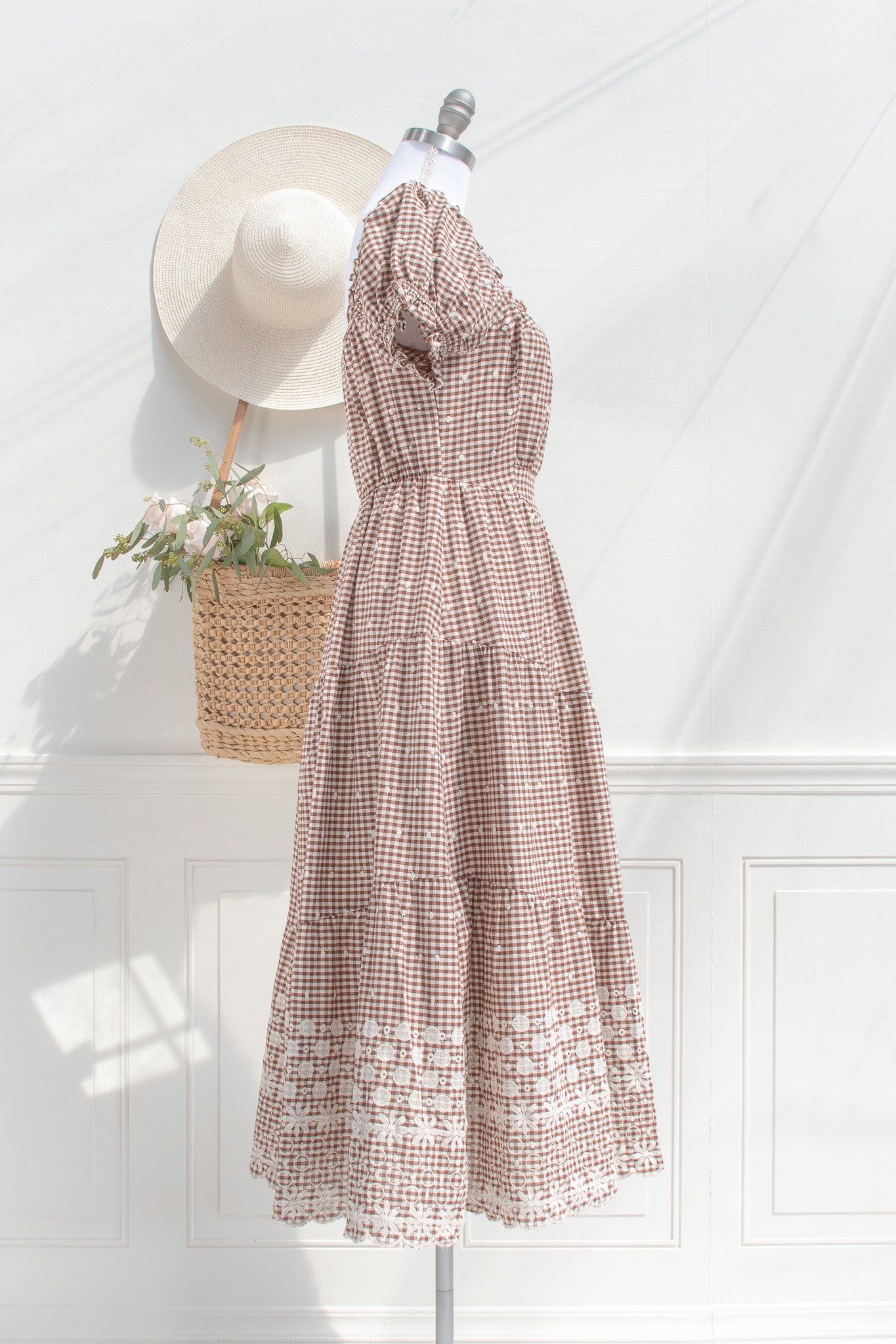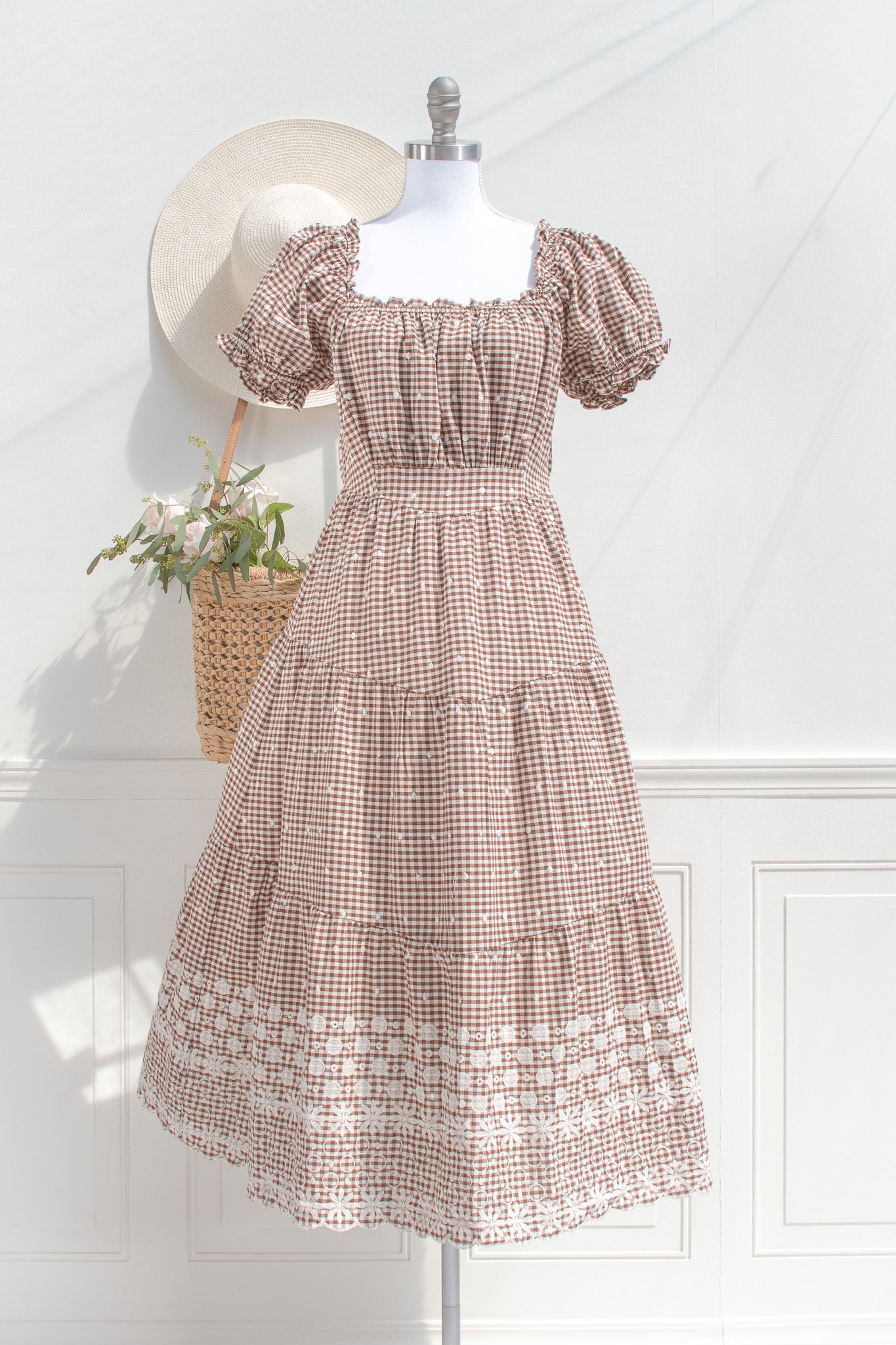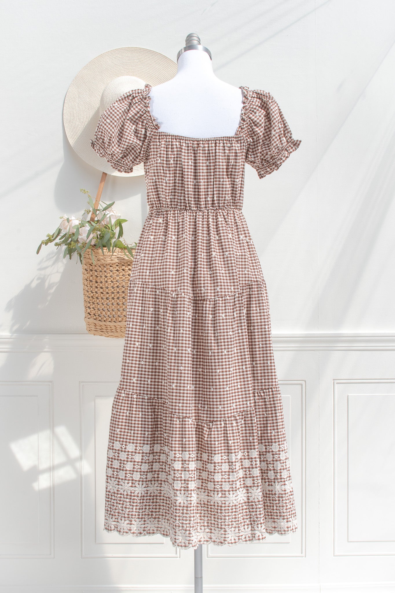 The Penelope Gingham Midi Dress carries a soft sense of nostalgia, rendered in a warm brown and white gingham that feels both timeless and quietly distinctive. Crafted from a breathable cotton blend, it holds a gentle structure while remaining light and easy to wear throughout the day. Penelope feels at home in sunlit cottages, weekend markets, and slow afternoons outdoors.
