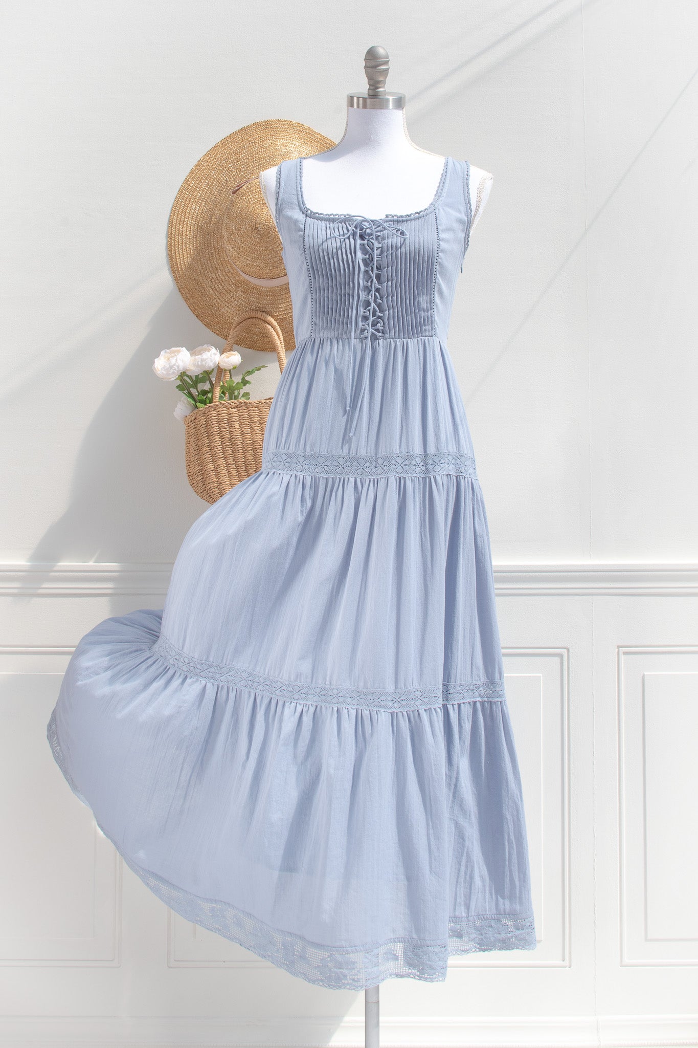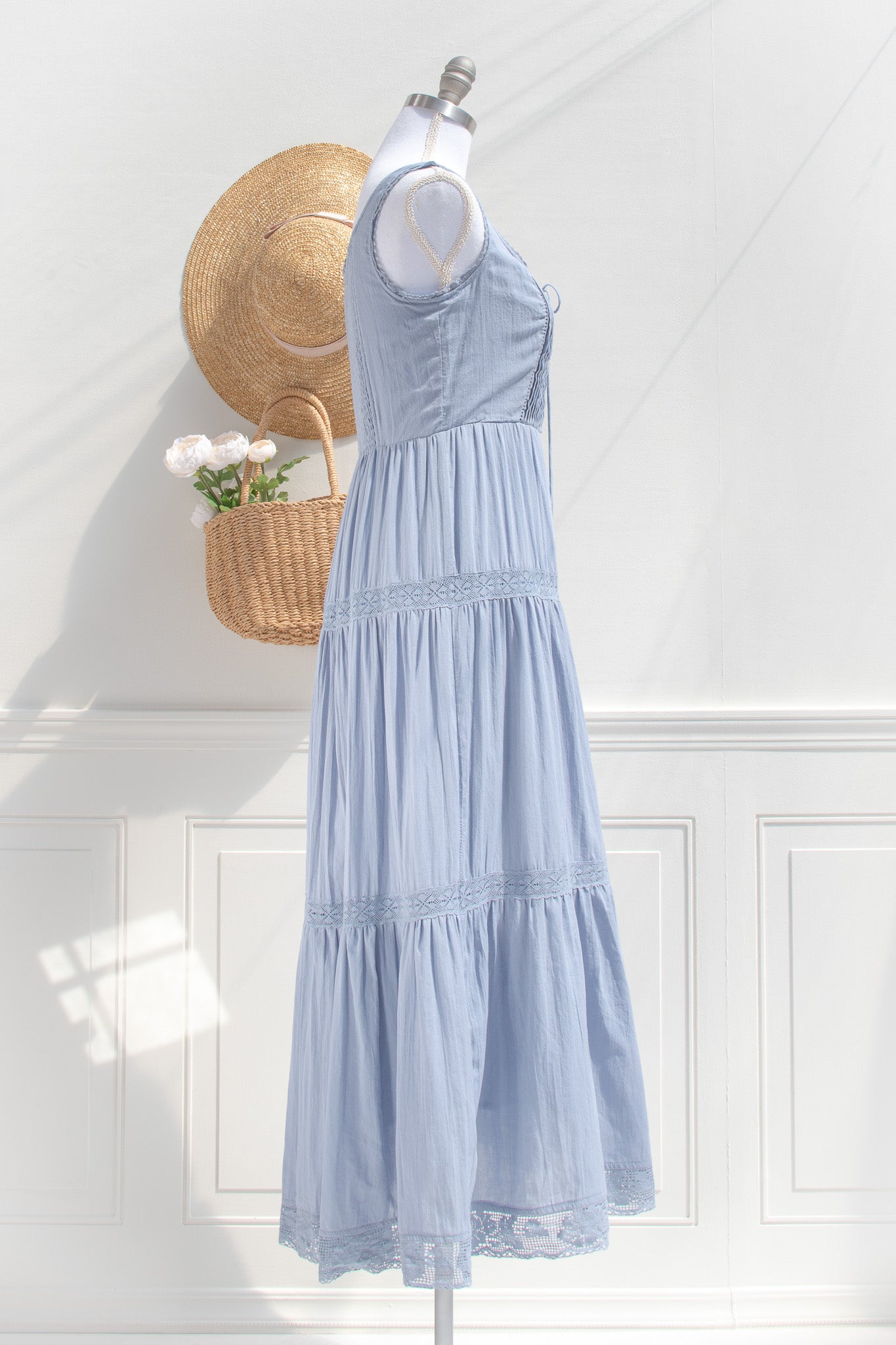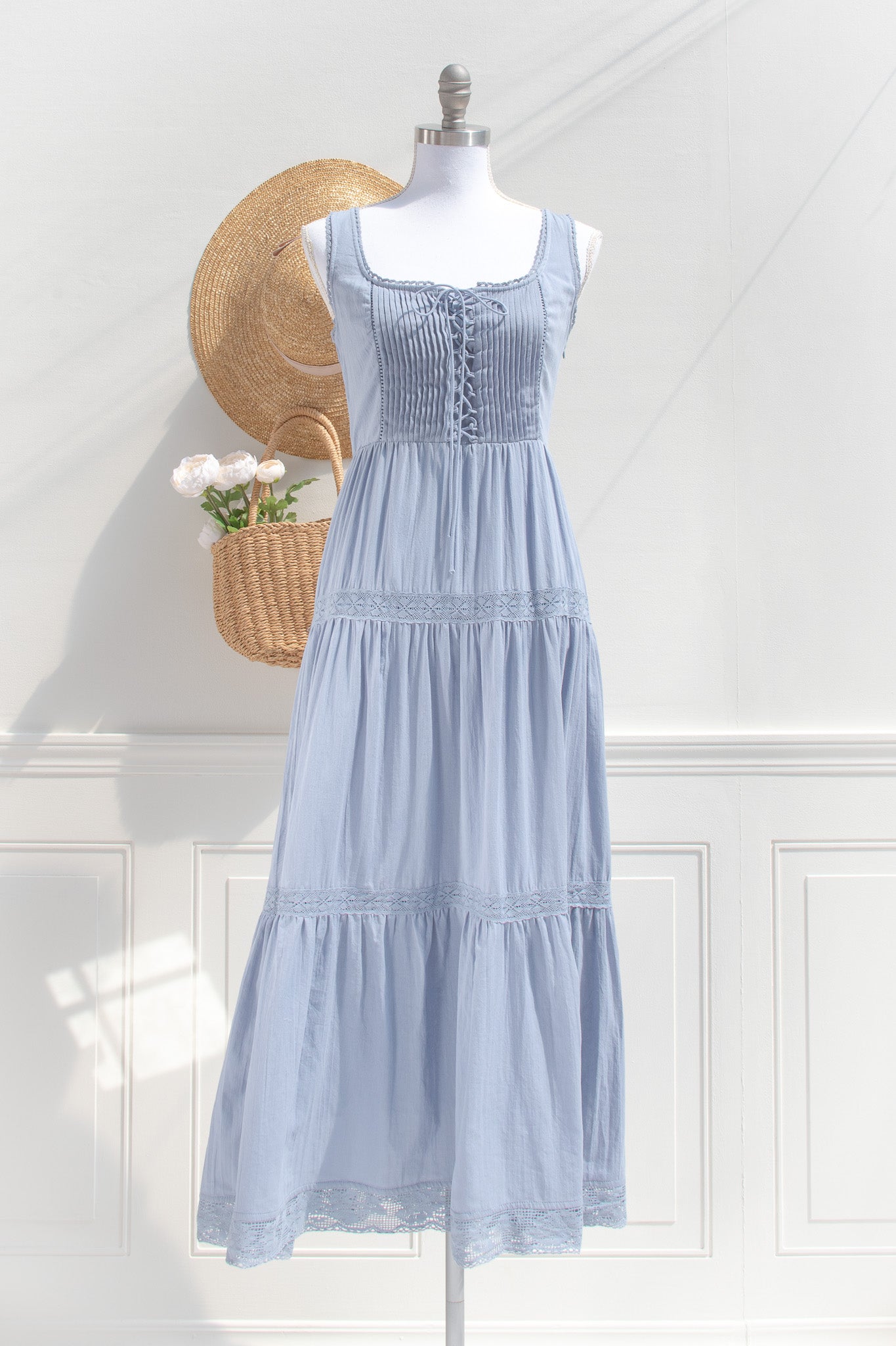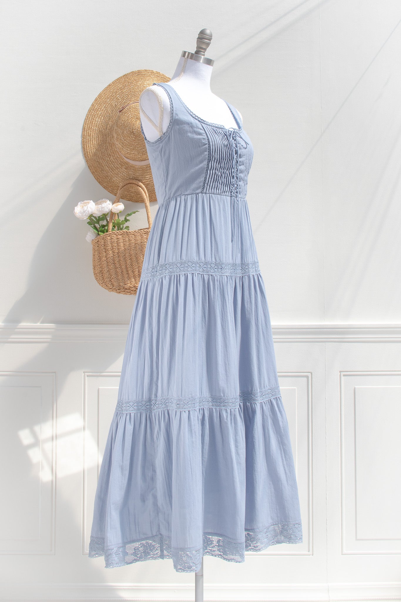 Crafted from soft cotton in a dusty blue hue, the Iris Maxi features a gently structured corset-style bodice with delicate lace trim and a lace-up front that shapes the waist with subtle definition. Fully lined for comfort and made for slow days, countryside walks, and moments that feel softly romantic without trying.