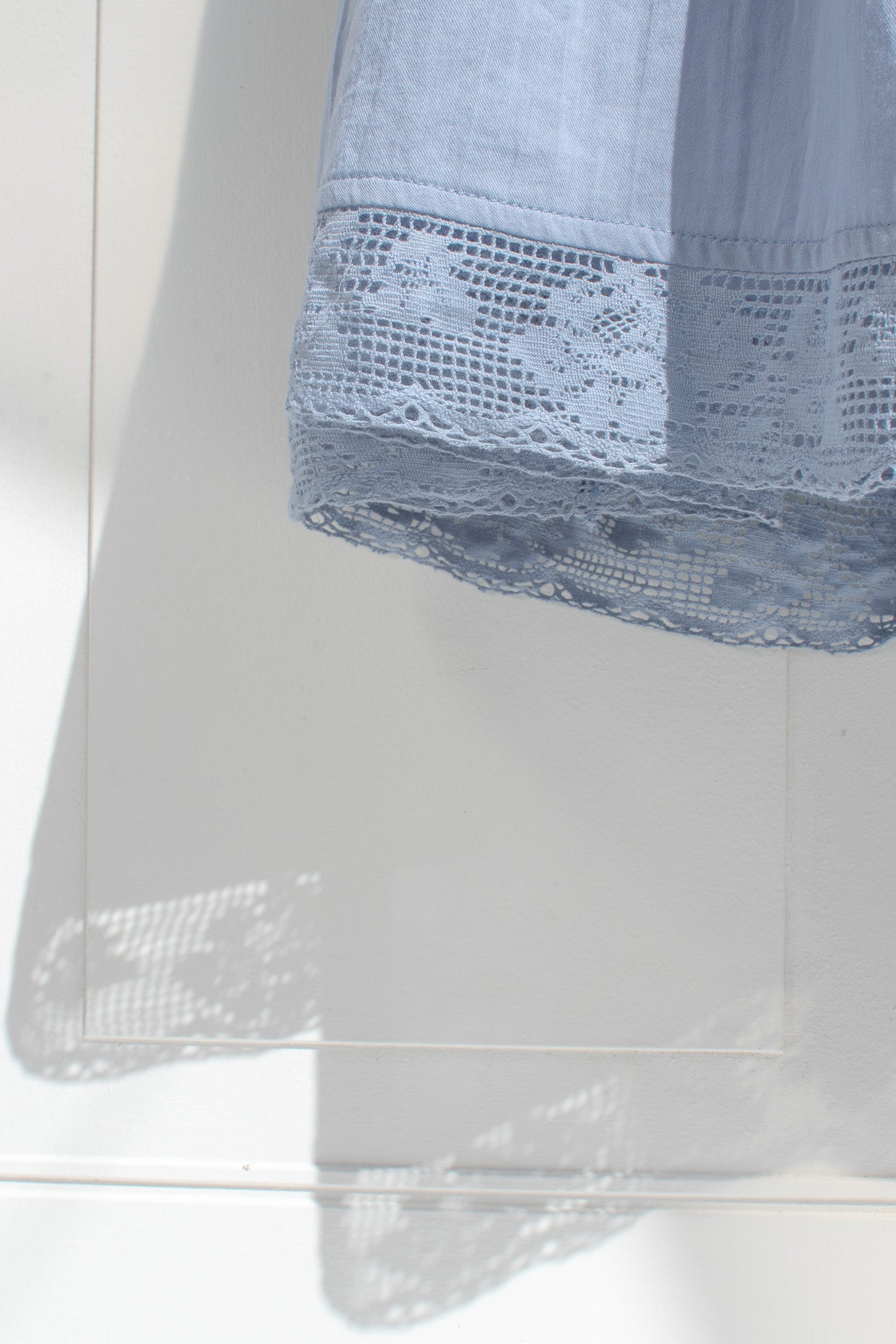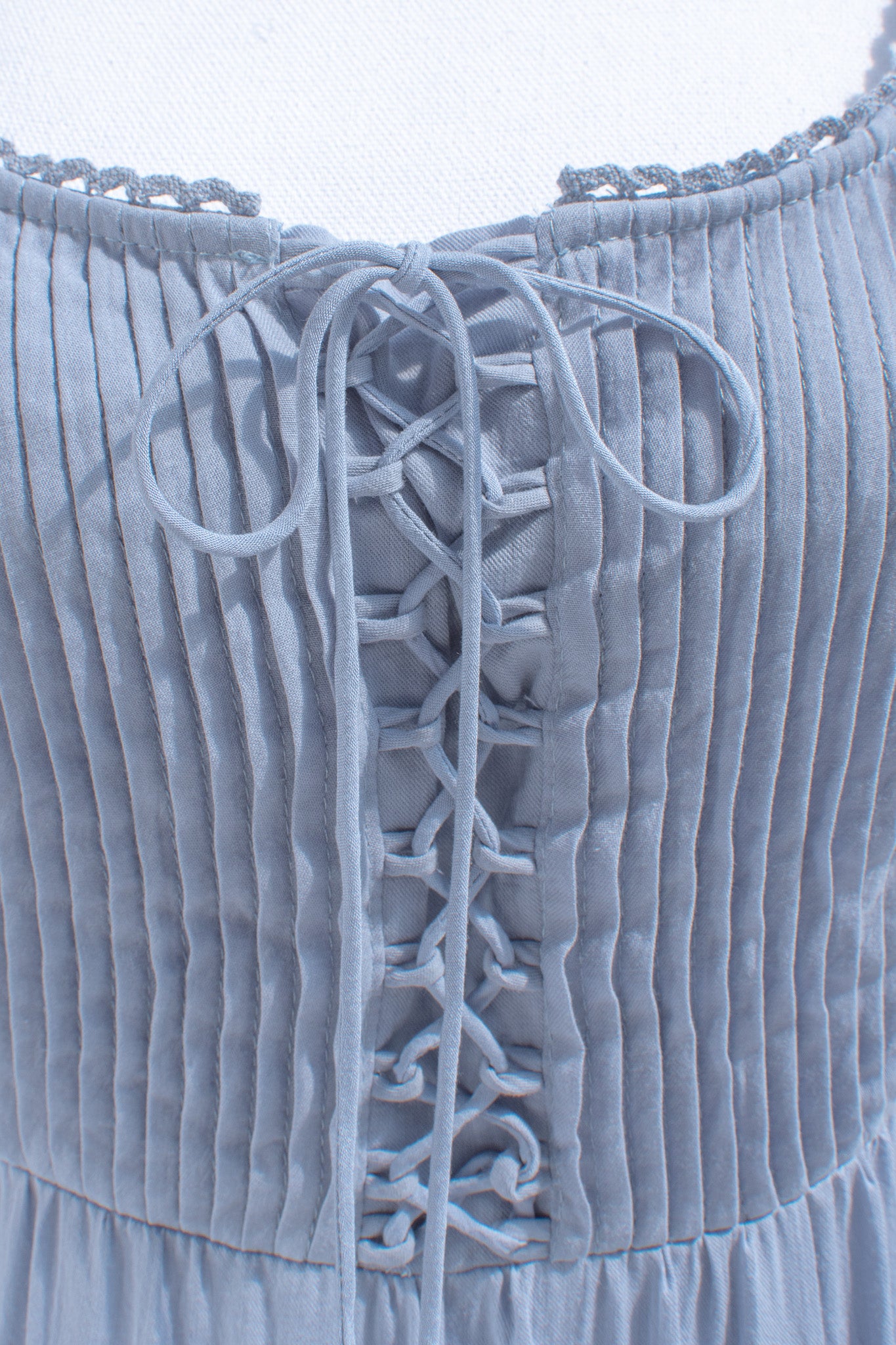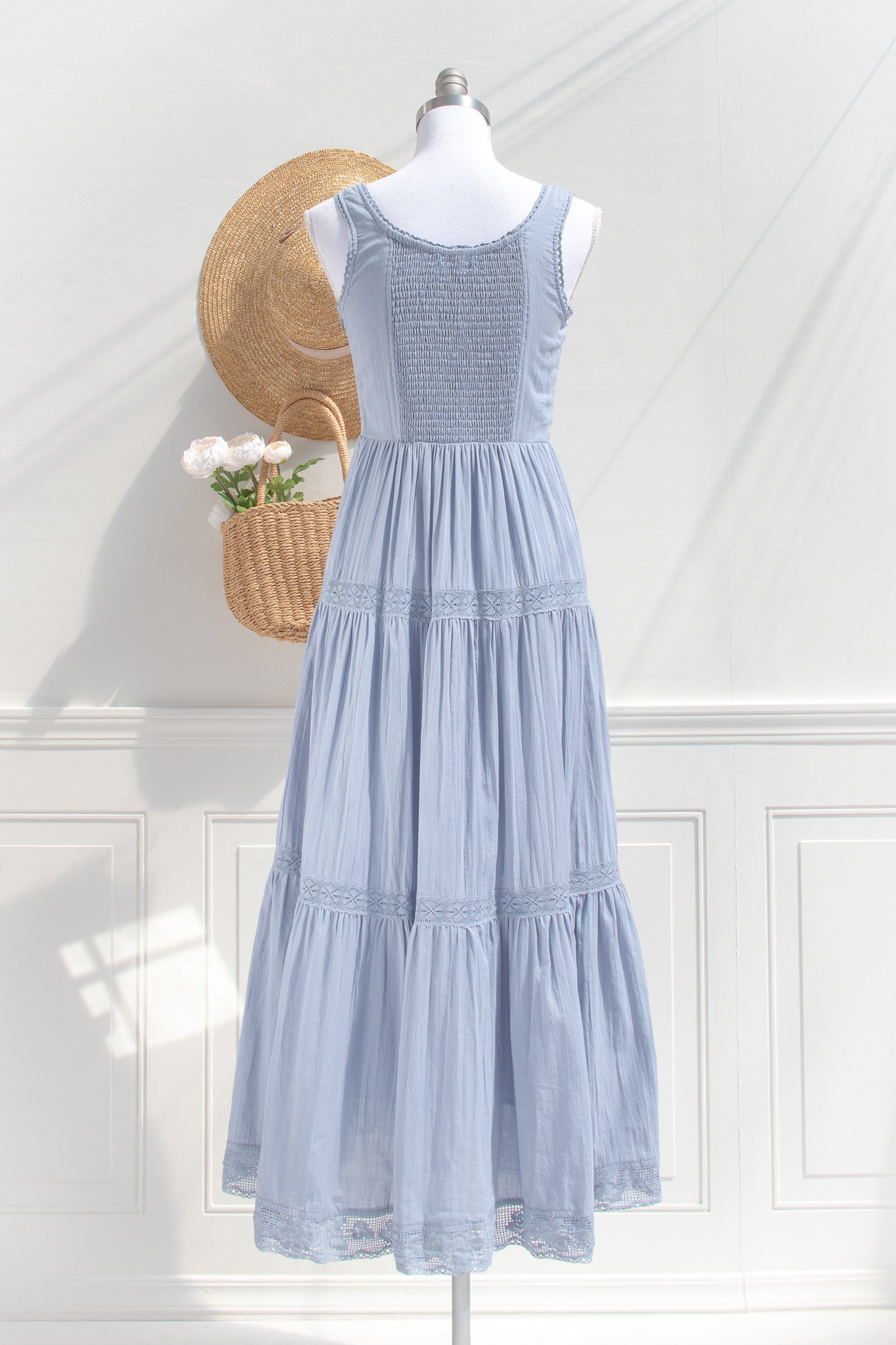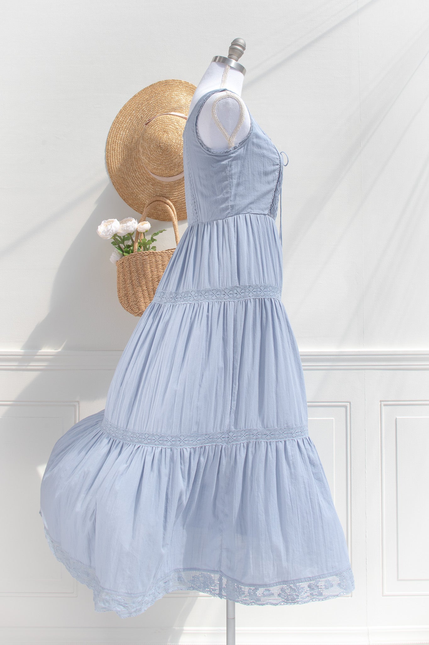 Crafted from soft cotton in a dusty blue hue, the Iris Maxi features a gently structured corset-style bodice with delicate lace trim and a lace-up front that shapes the waist with subtle definition. Fully lined for comfort and made for slow days, countryside walks, and moments that feel softly romantic without trying.