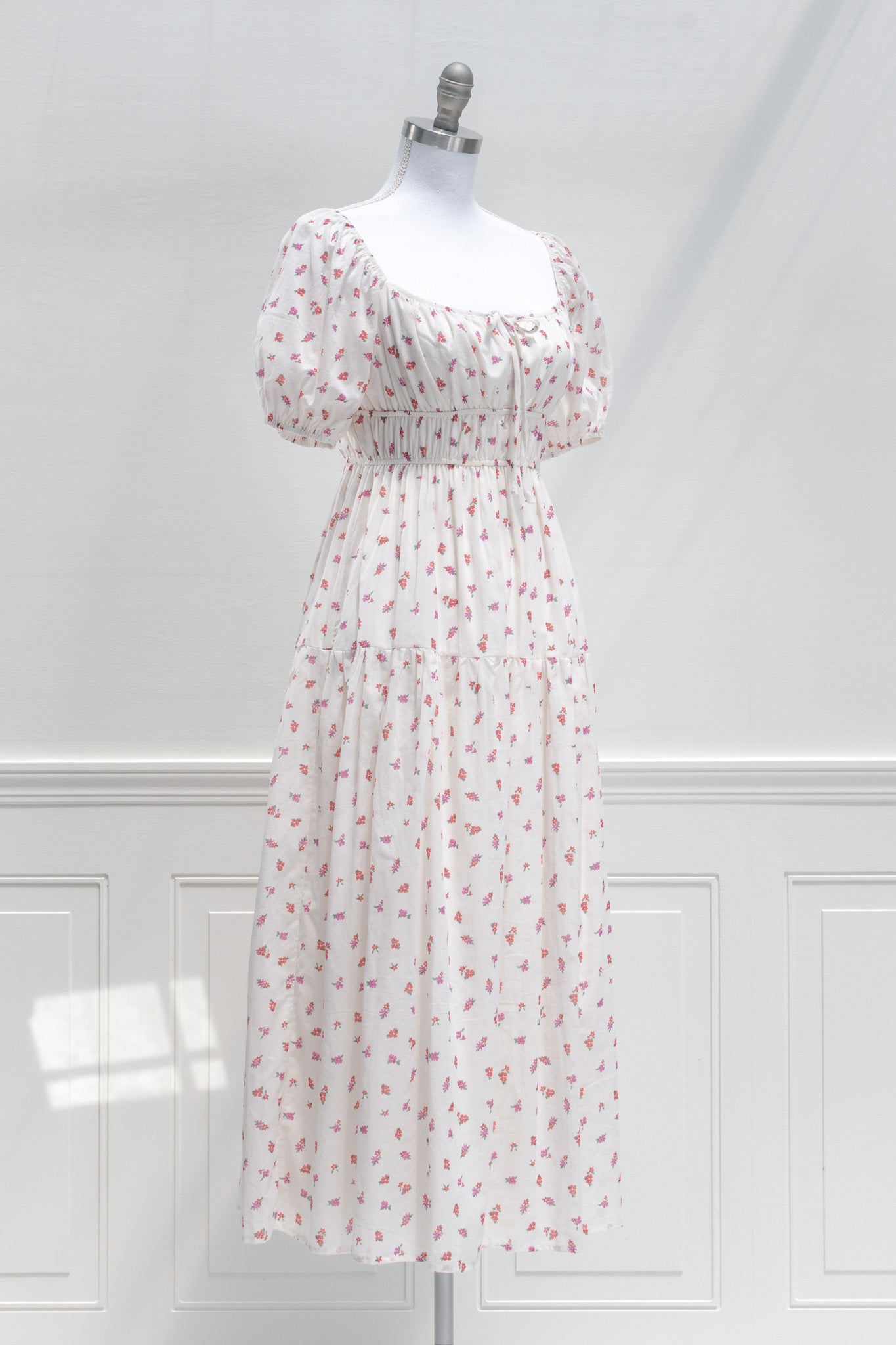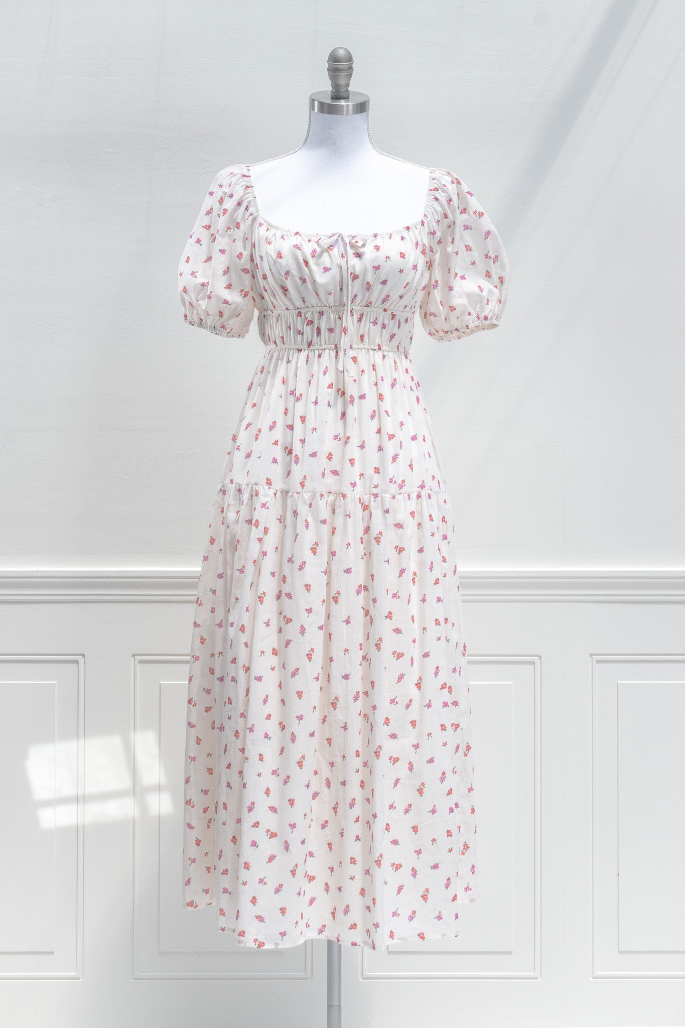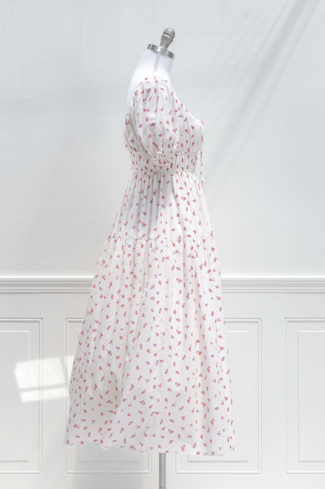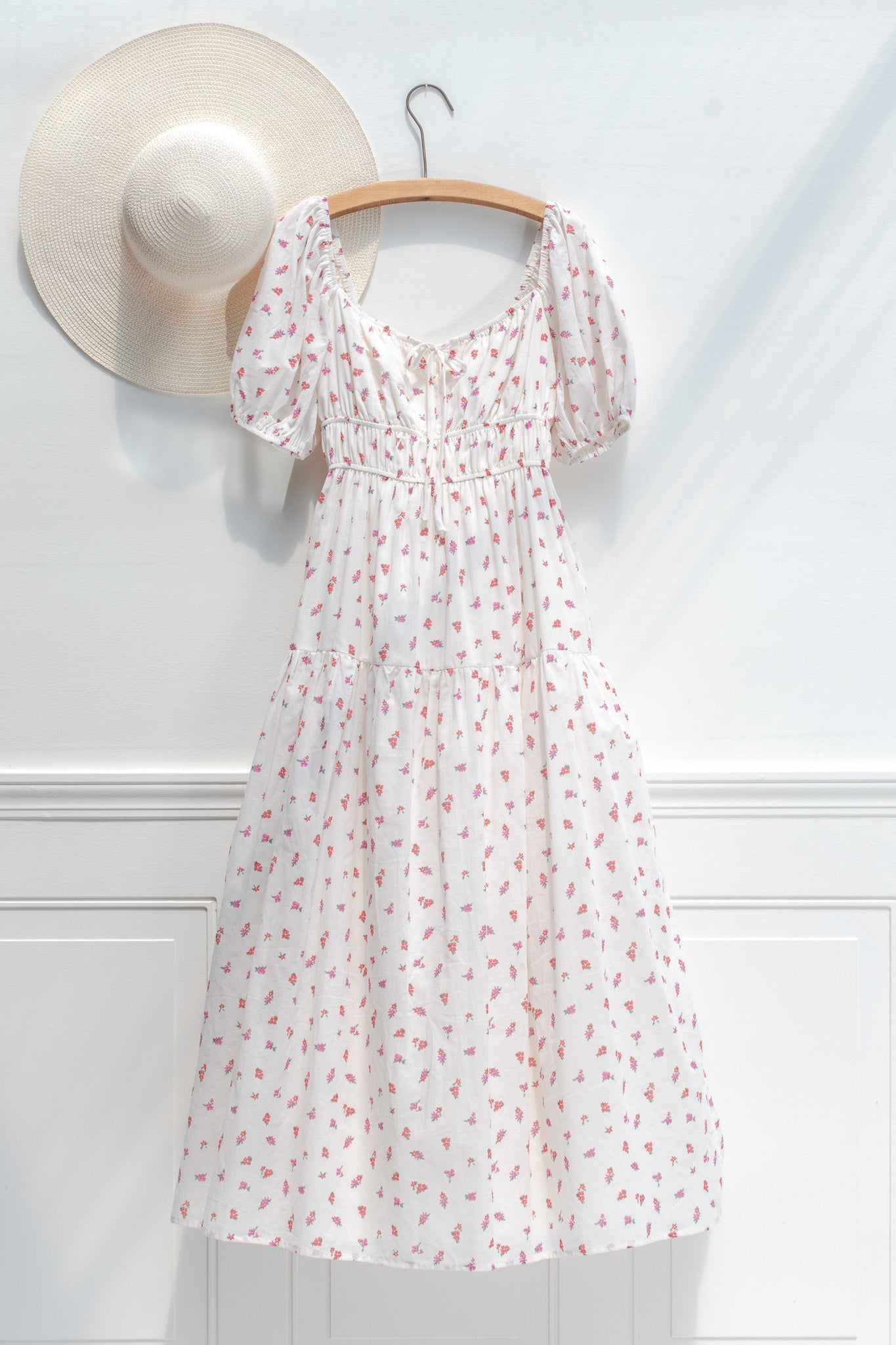 Romantic & feminine, the Simple Sonnet dress features a delicate pink and red floral print on cream cotton, short puffed sleeves, a square neckline with romantic tie details, a lined midi length skirt, and a smocked elastic waistline for a comfortable fit.