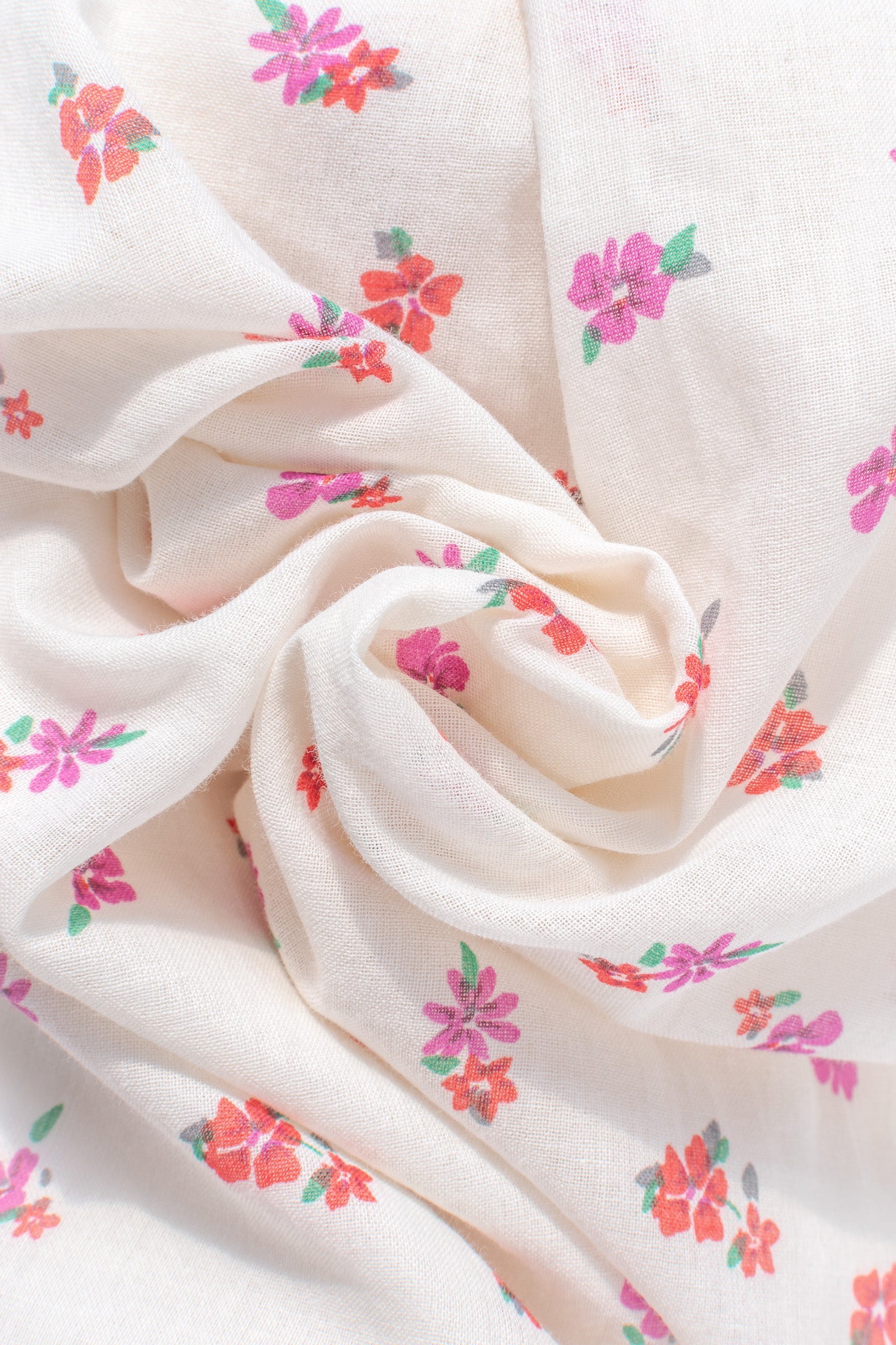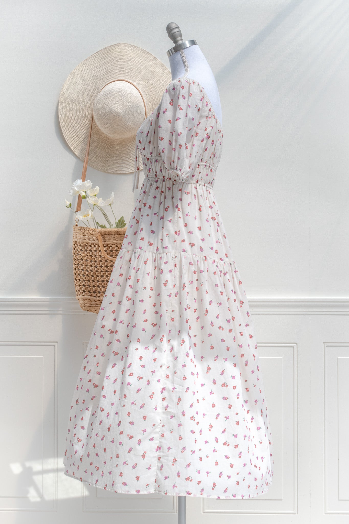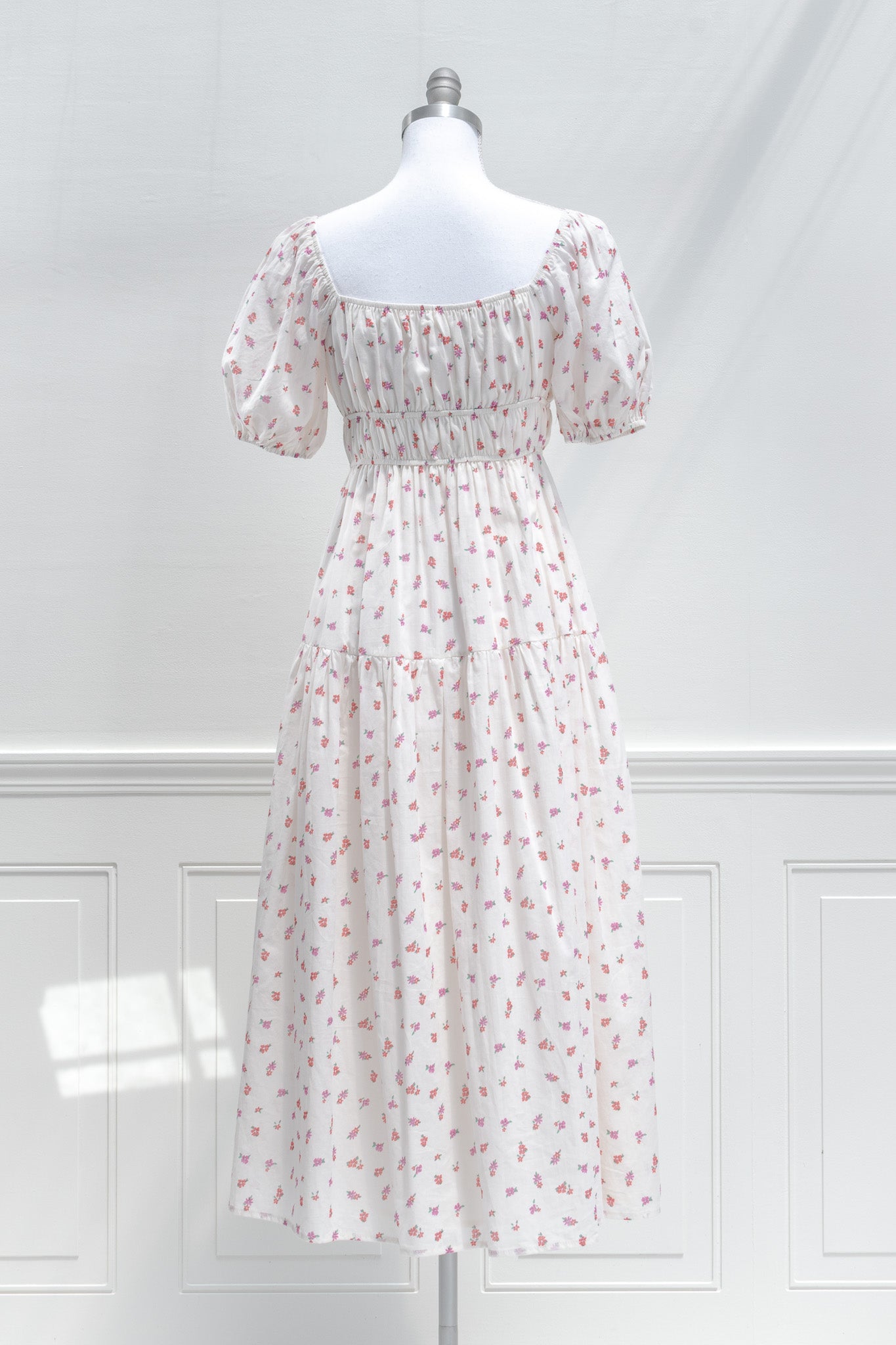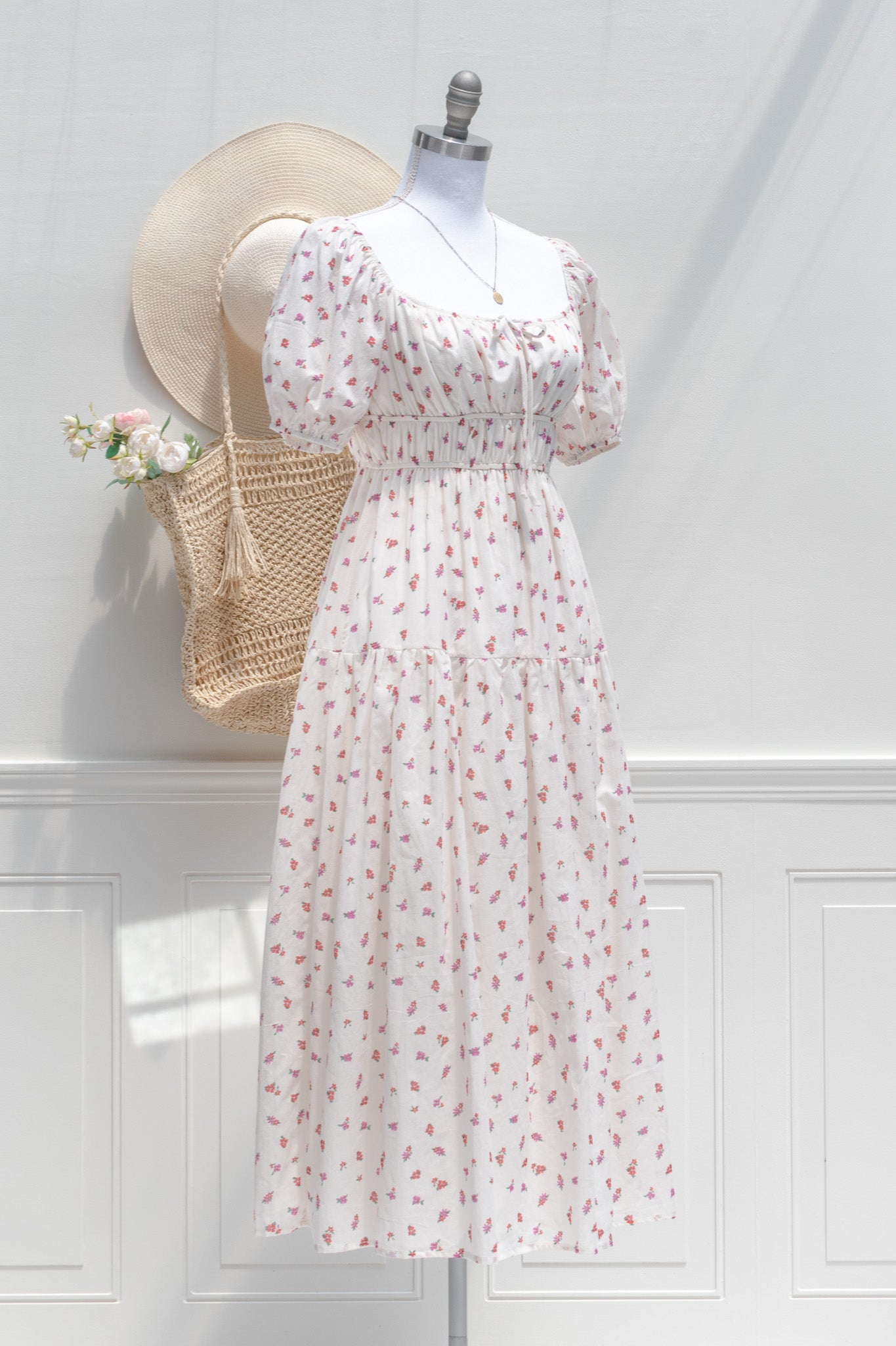 Romantic & feminine, the Simple Sonnet dress features a delicate pink and red floral print on cream cotton, short puffed sleeves, a square neckline with romantic tie details, a lined midi length skirt, and a smocked elastic waistline for a comfortable fit.