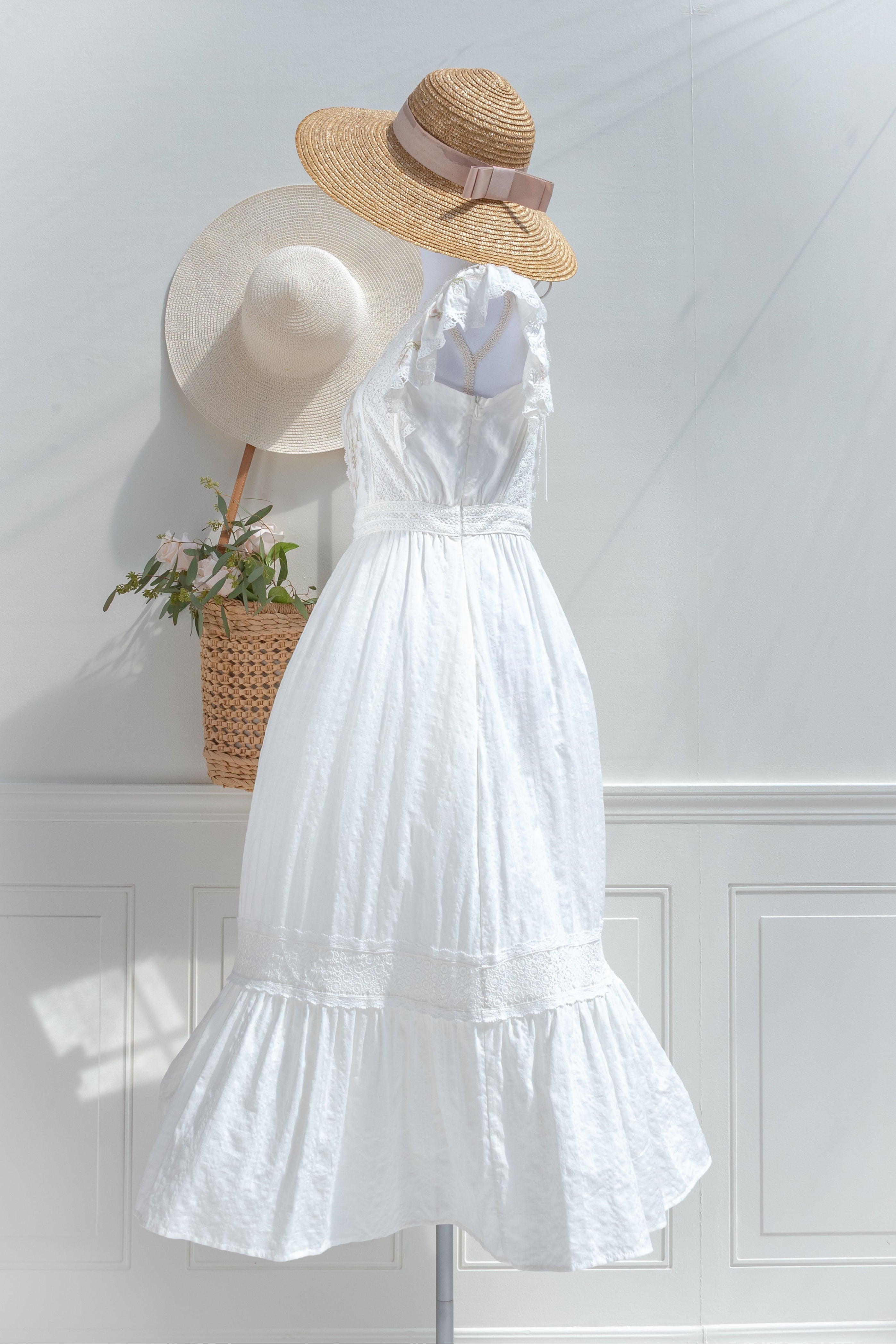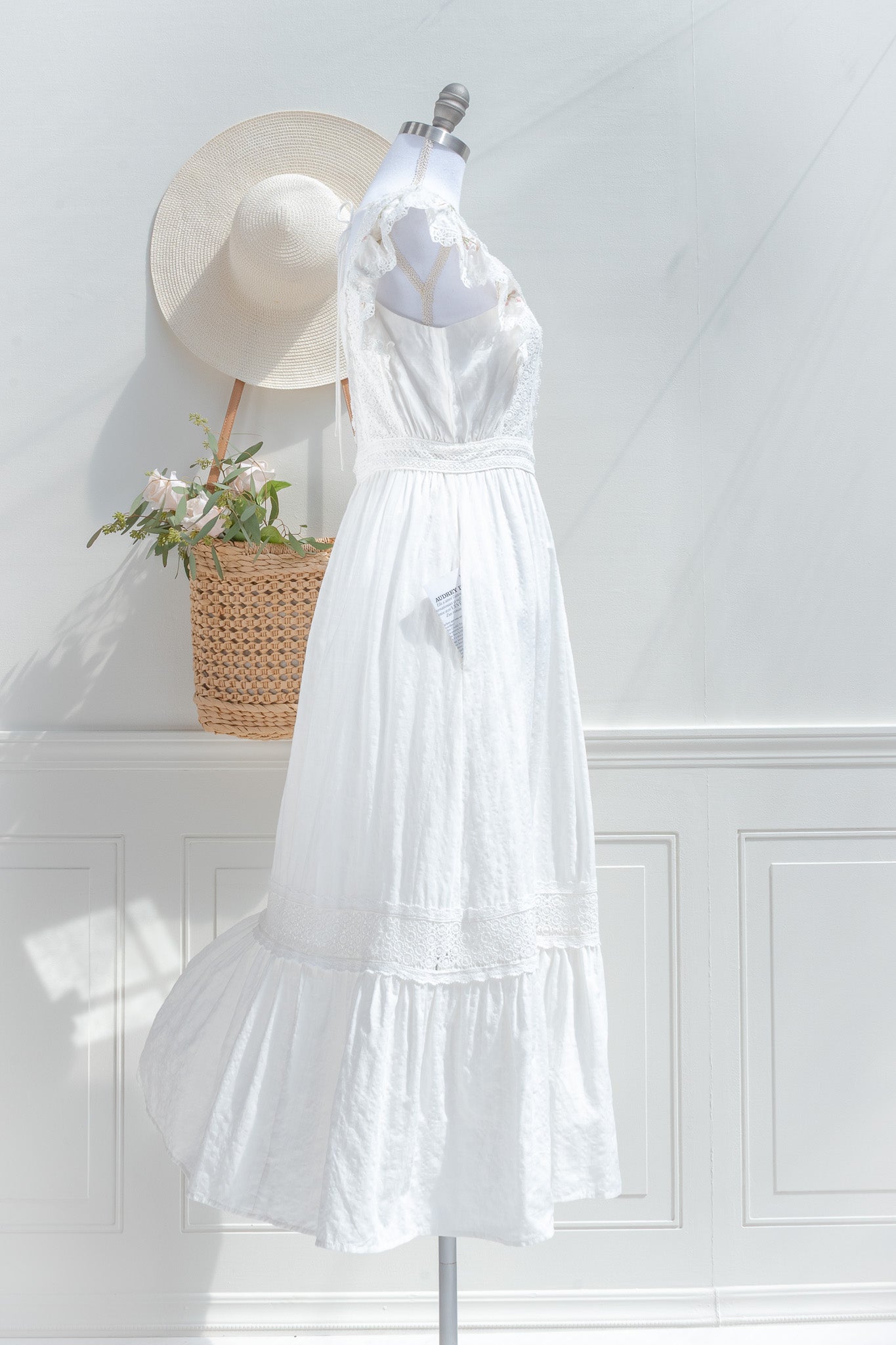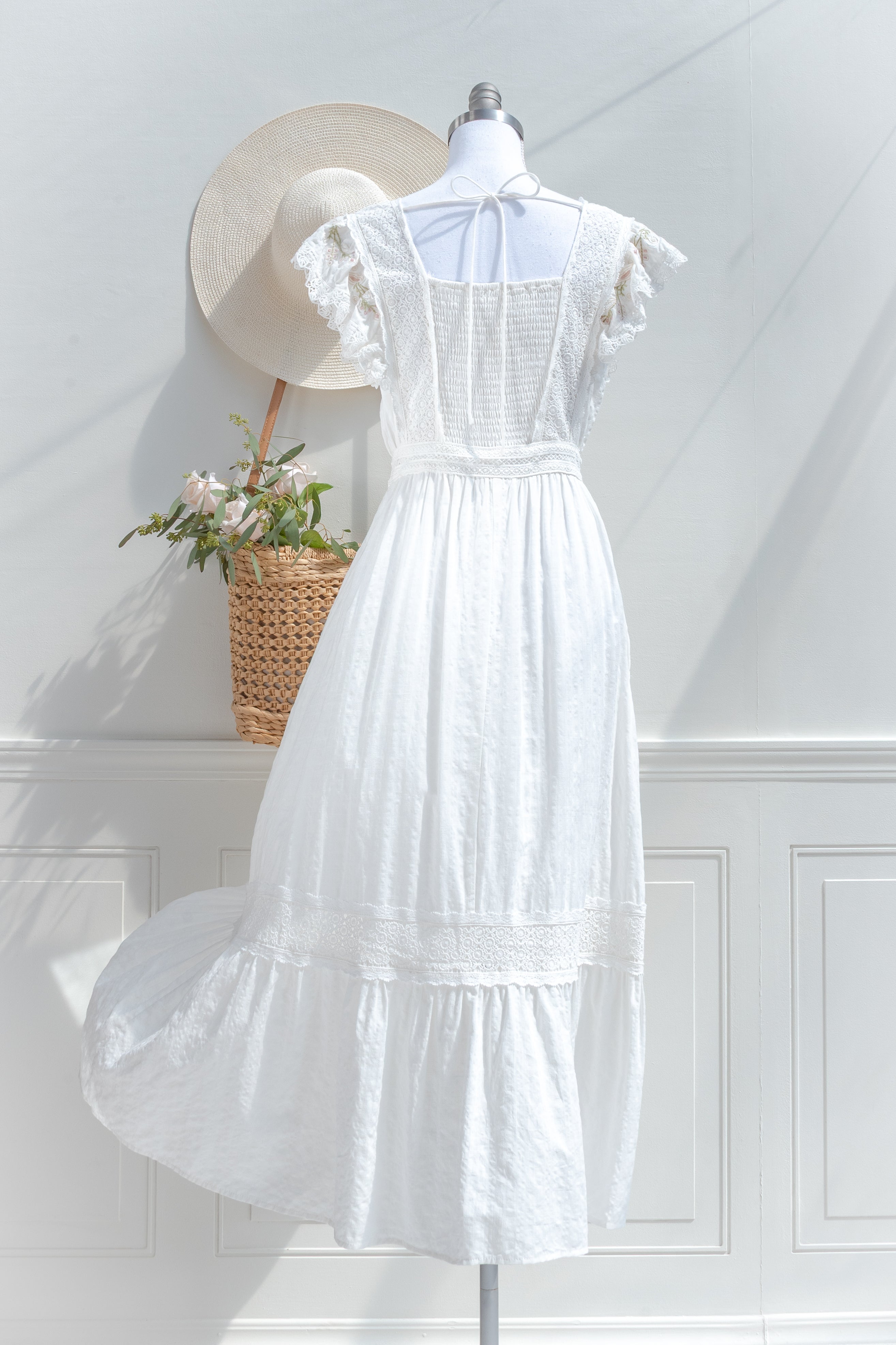 Light, feminine, and quietly refined, the Victoria maxi is designed for days that unfold with ease. Crafted from a soft cotton blend with a hint of stretch and a fully cotton lining. Delicate lace panels frame the bodice and trace the waist, while soft ruffled sleeve details add a gentle, romantic finish. It is the kind of piece that feels natural to wear, yet leaves a lasting impression in its softness and detail.