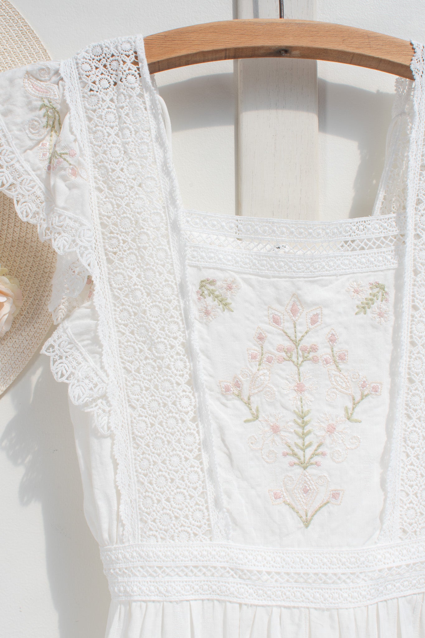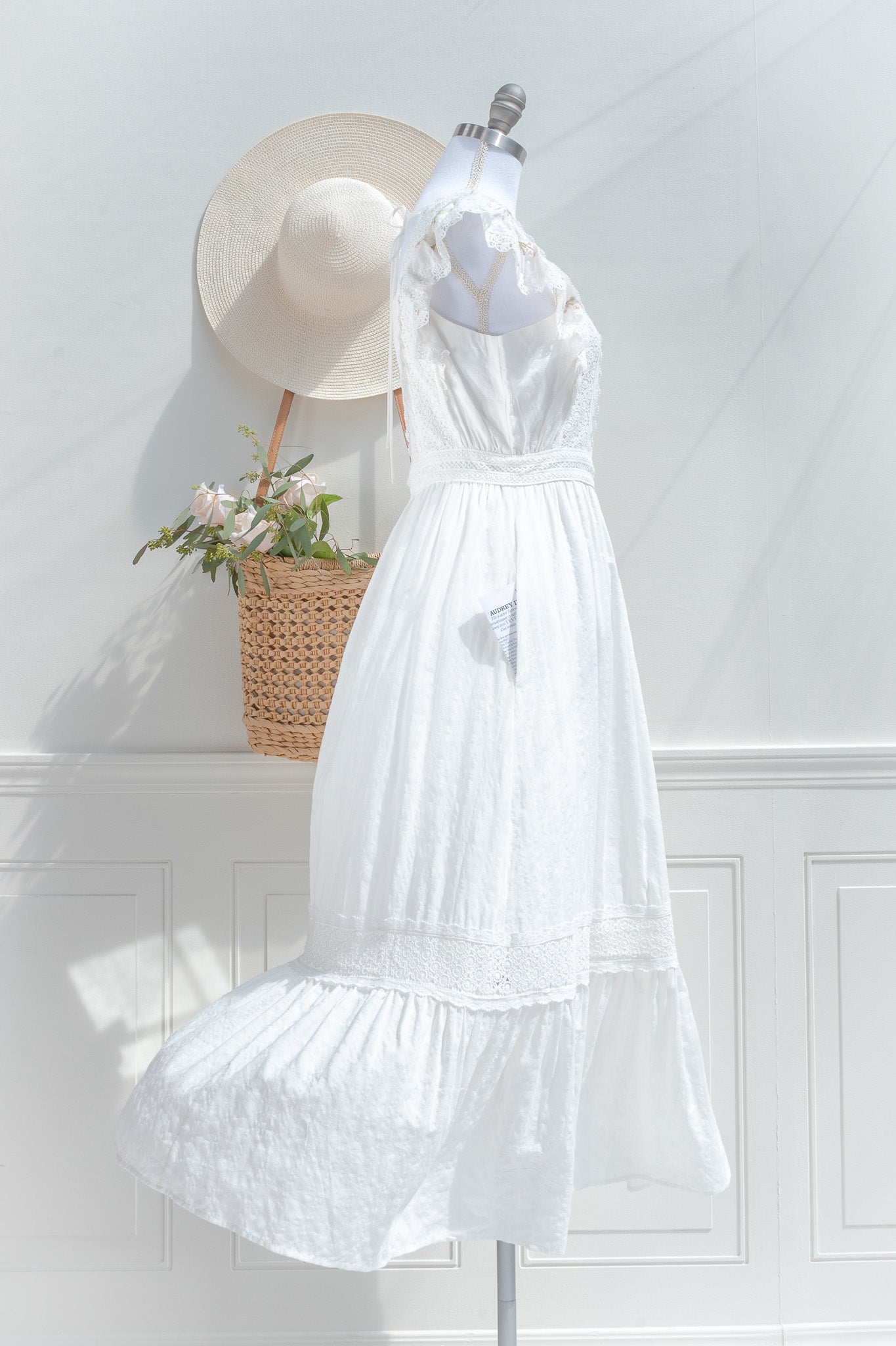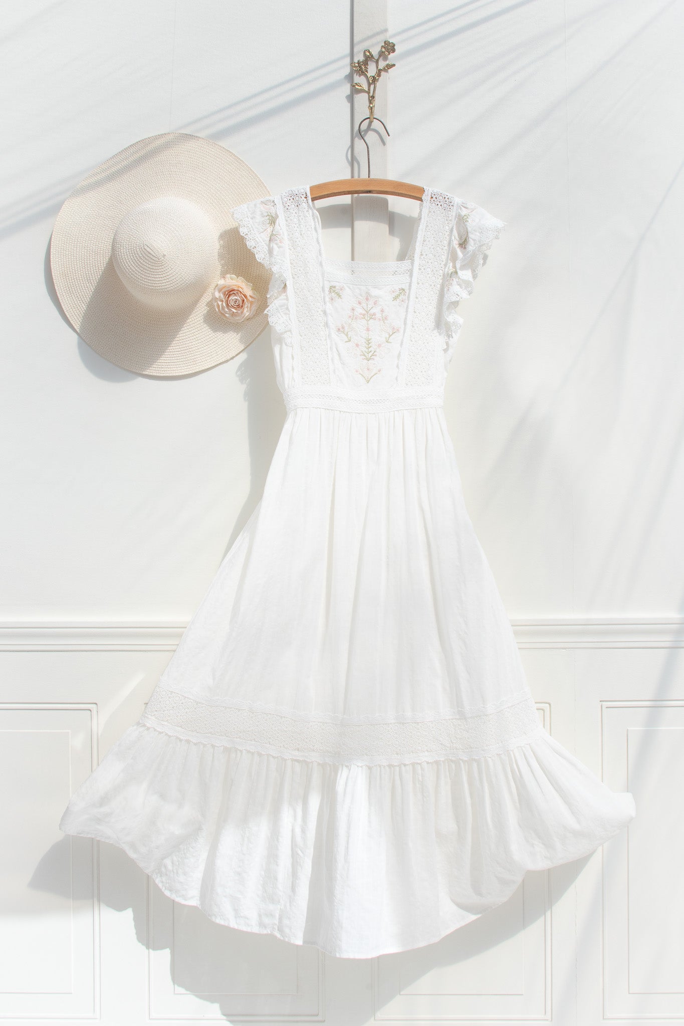 Light, feminine, and quietly refined, the Victoria maxi is designed for days that unfold with ease. Crafted from a soft cotton blend with a hint of stretch and a fully cotton lining. Delicate lace panels frame the bodice and trace the waist, while soft ruffled sleeve details add a gentle, romantic finish. It is the kind of piece that feels natural to wear, yet leaves a lasting impression in its softness and detail.