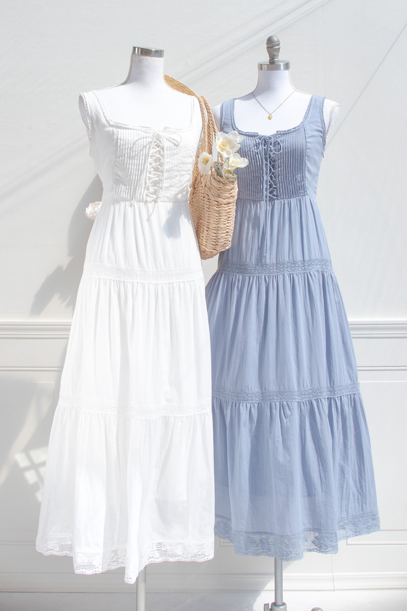 Crafted from soft cotton in a dusty blue hue, the Iris Maxi features a gently structured corset-style bodice with delicate lace trim and a lace-up front that shapes the waist with subtle definition. Fully lined for comfort and made for slow days, countryside walks, and moments that feel softly romantic without trying.