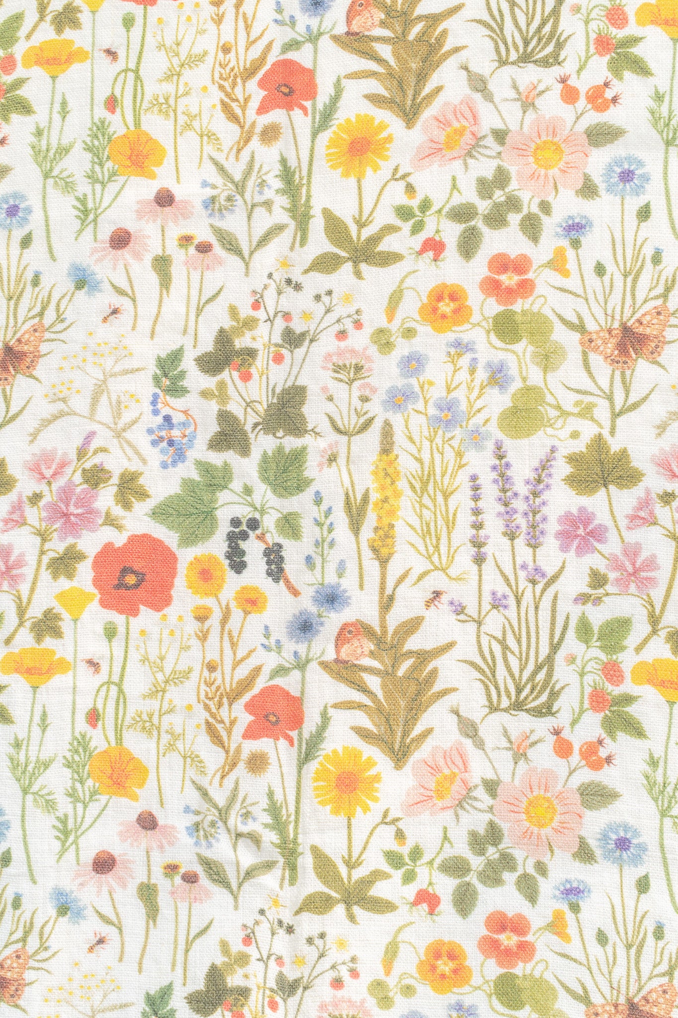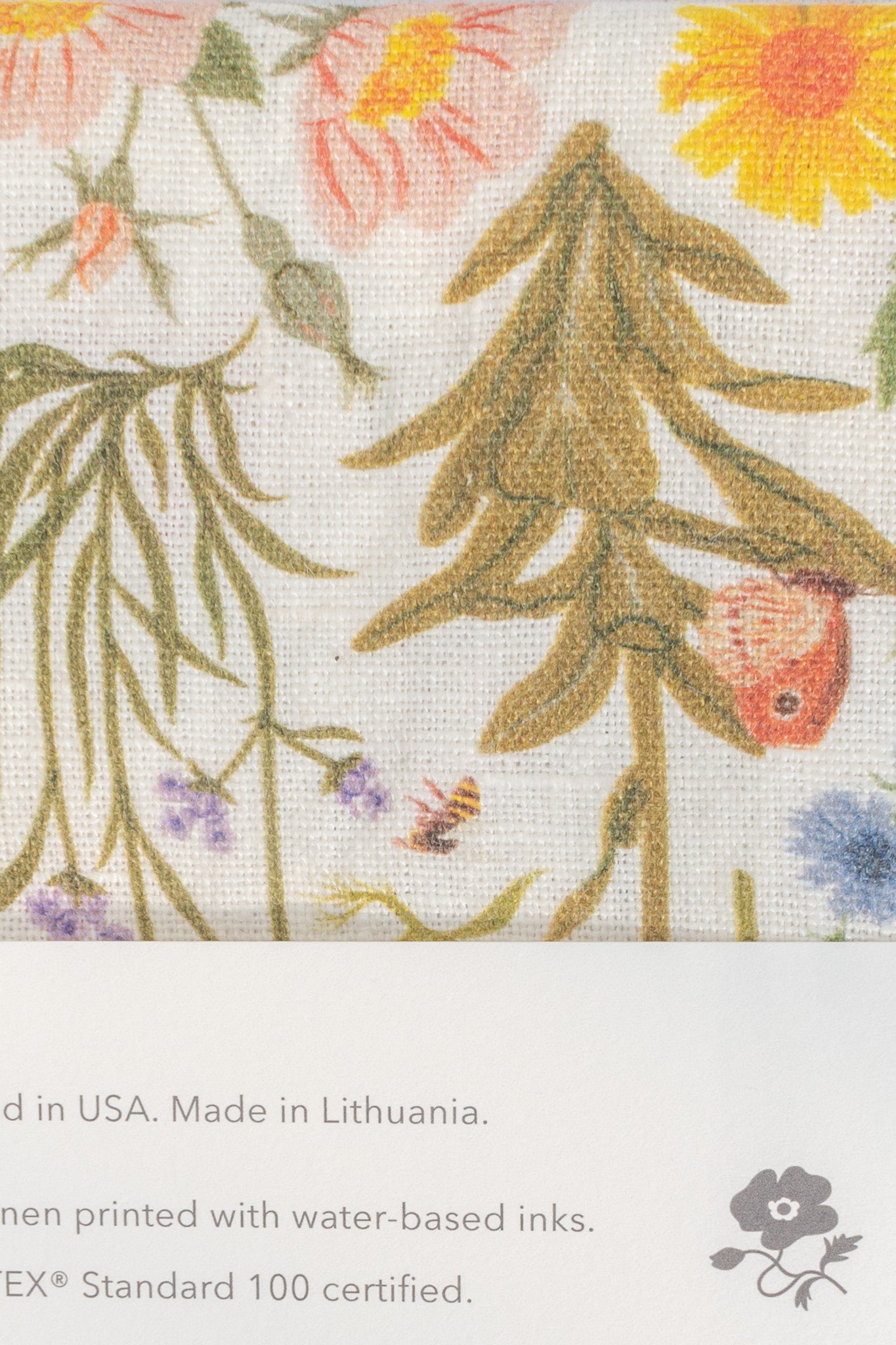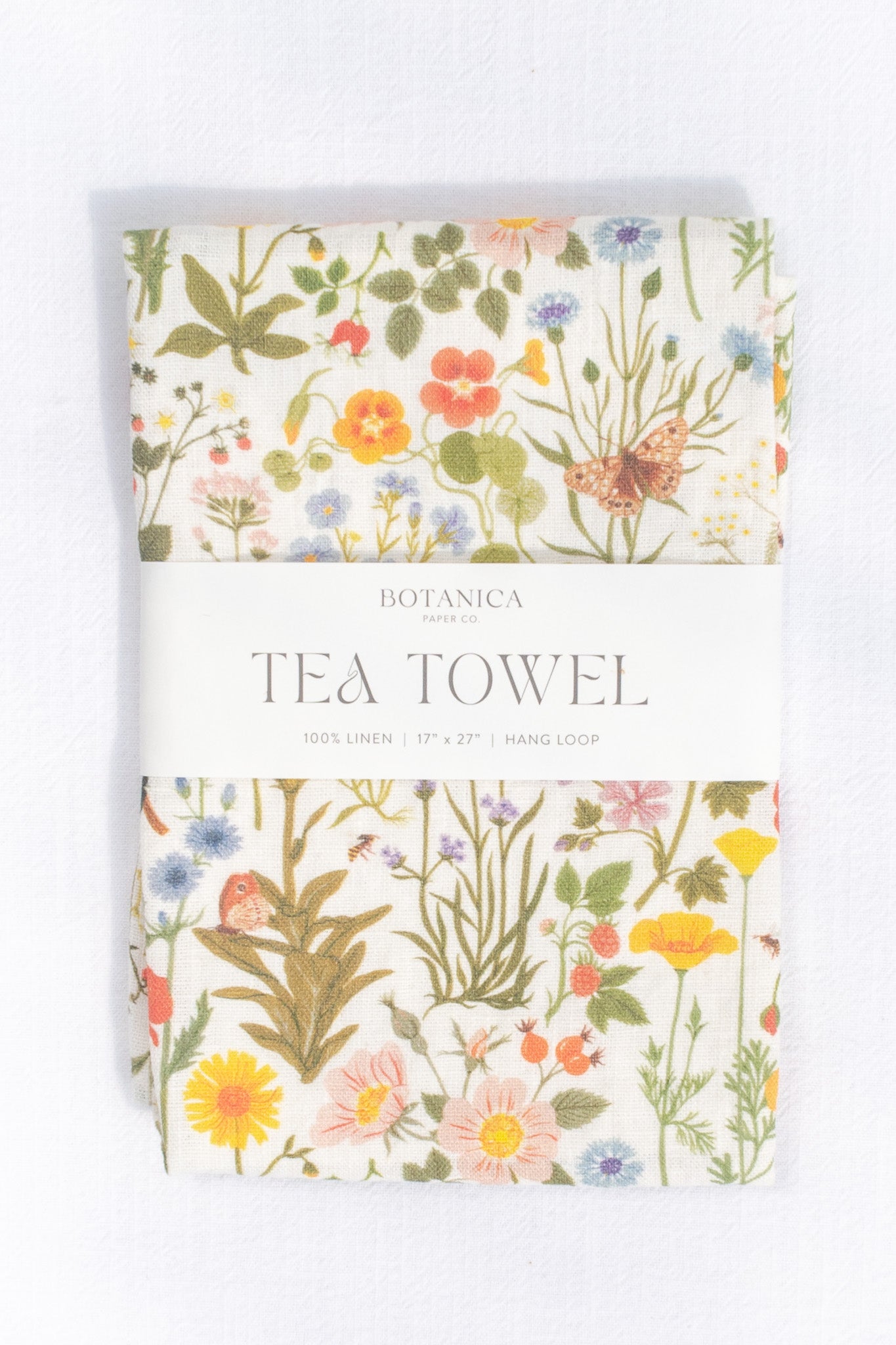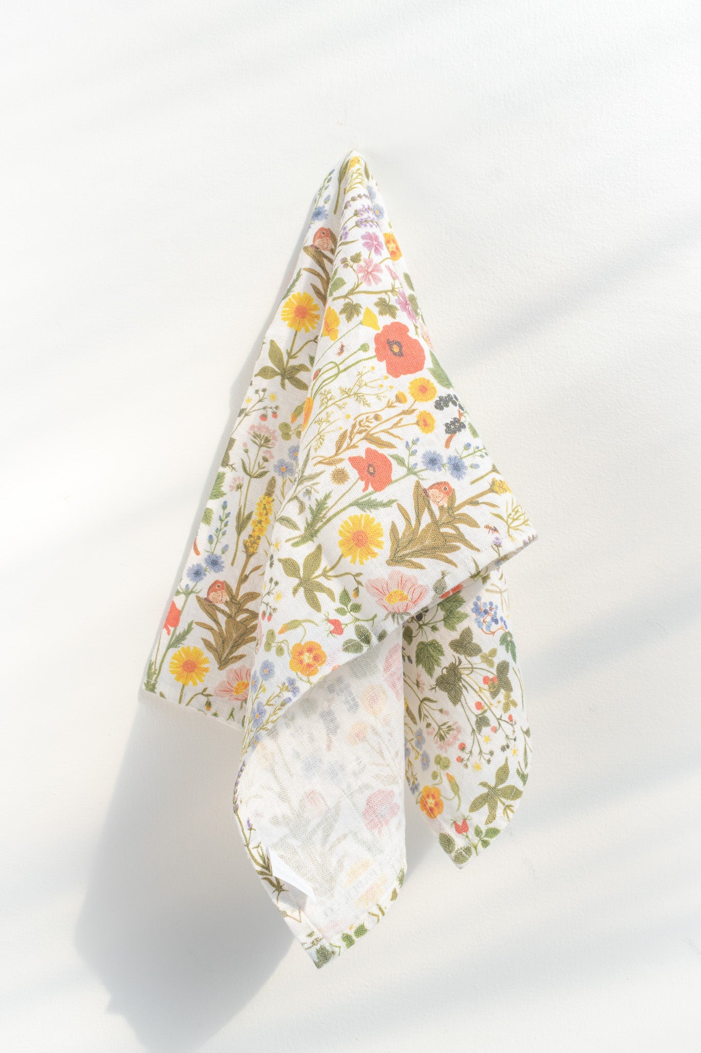The perfect kitchen accent, this 100% European linen tea towel has a lovely cottage garden flower and fruit print on an off-white background. Printed with non-toxic inks. A perfect addition to your French-inspired kitchen.