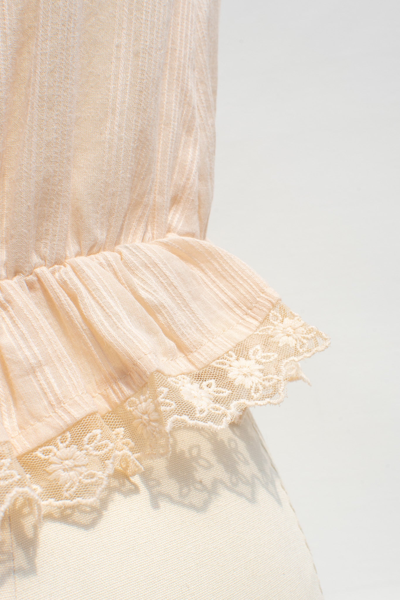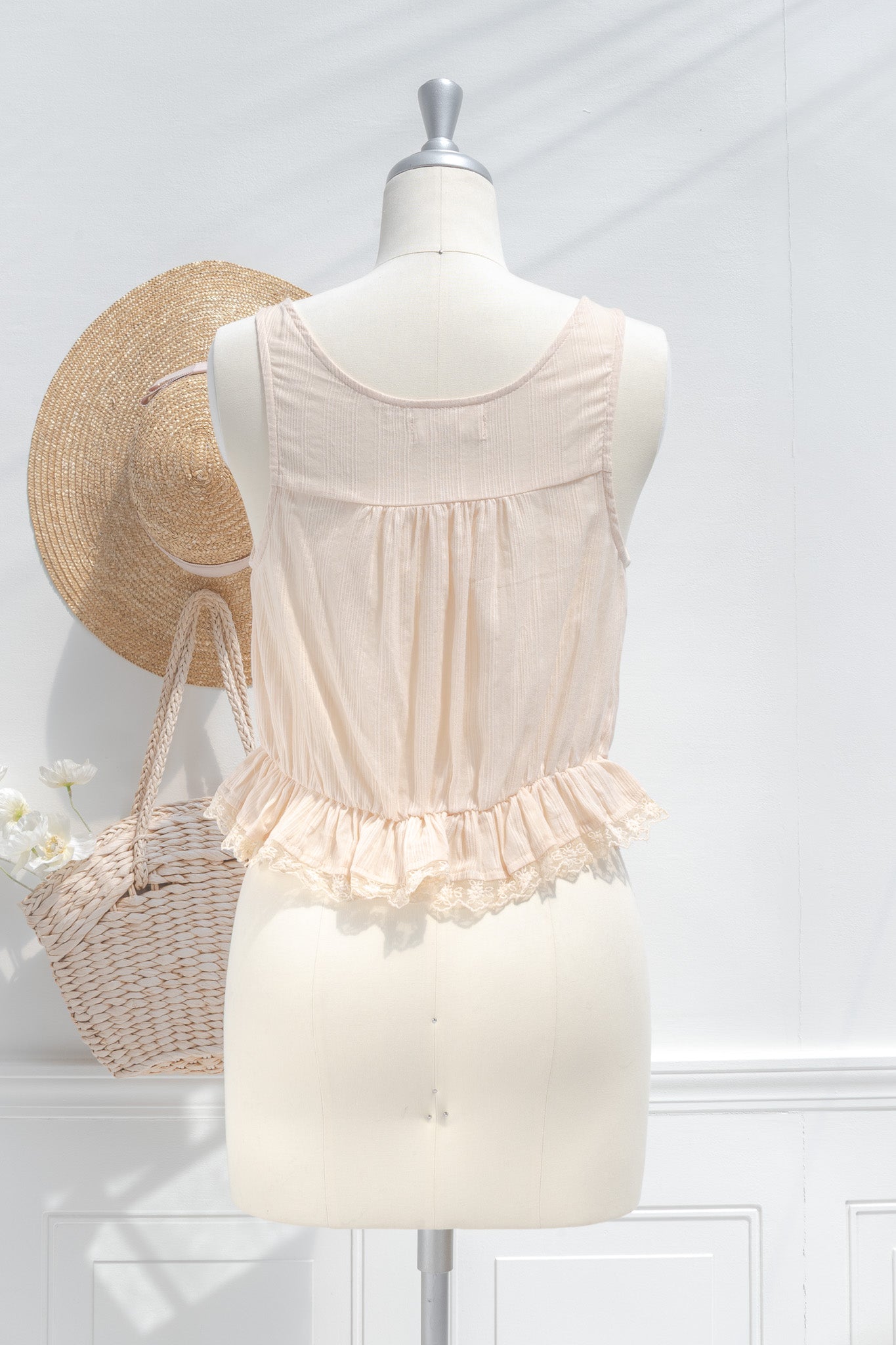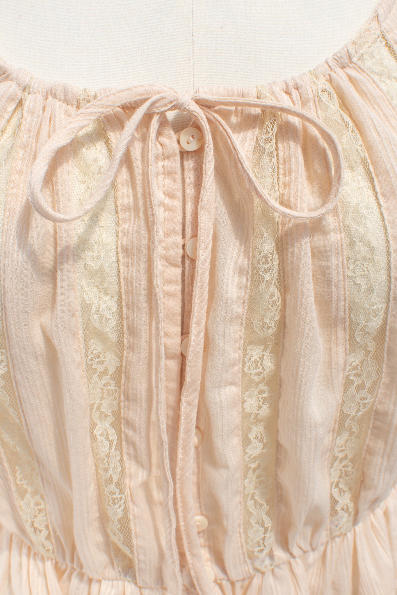 A darling little cropped blouse, the Marie is inspired by Victorian underpinnings and is crafted from 100% cotton. A chemise-style blouse that features a button-up front, elasticated waist, round neckline, sheer lace details, and an adjustable drawstring neckline.