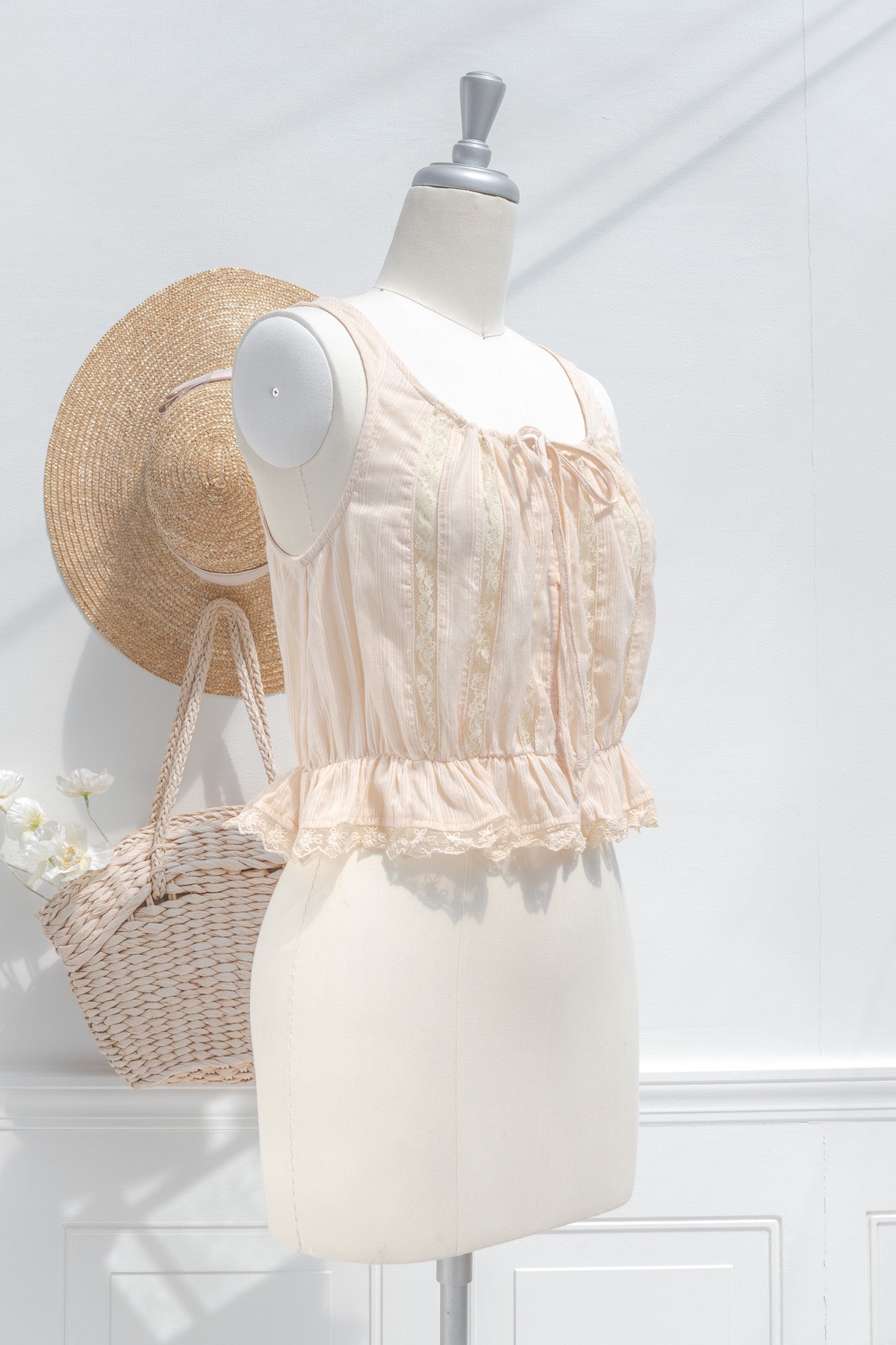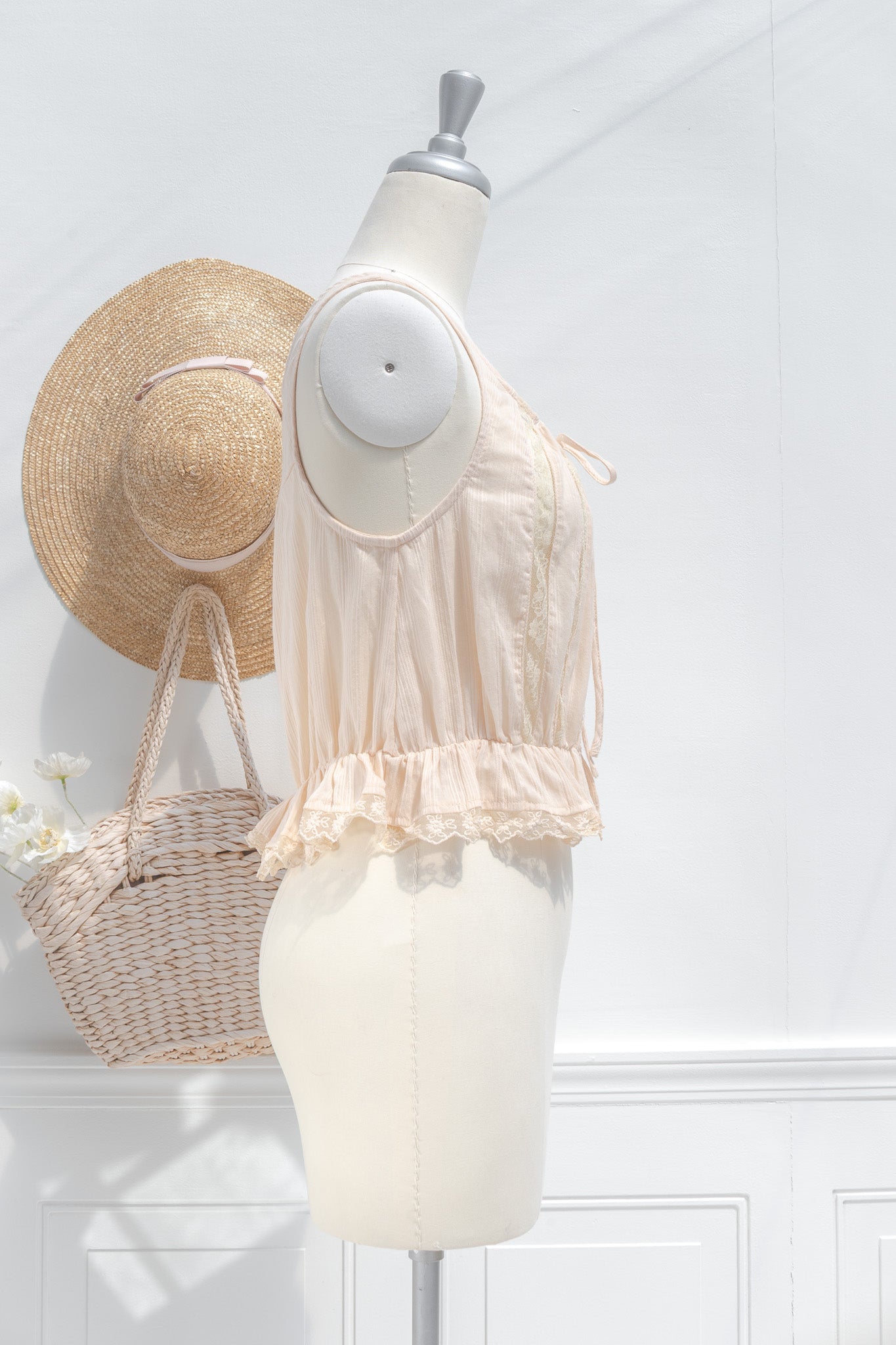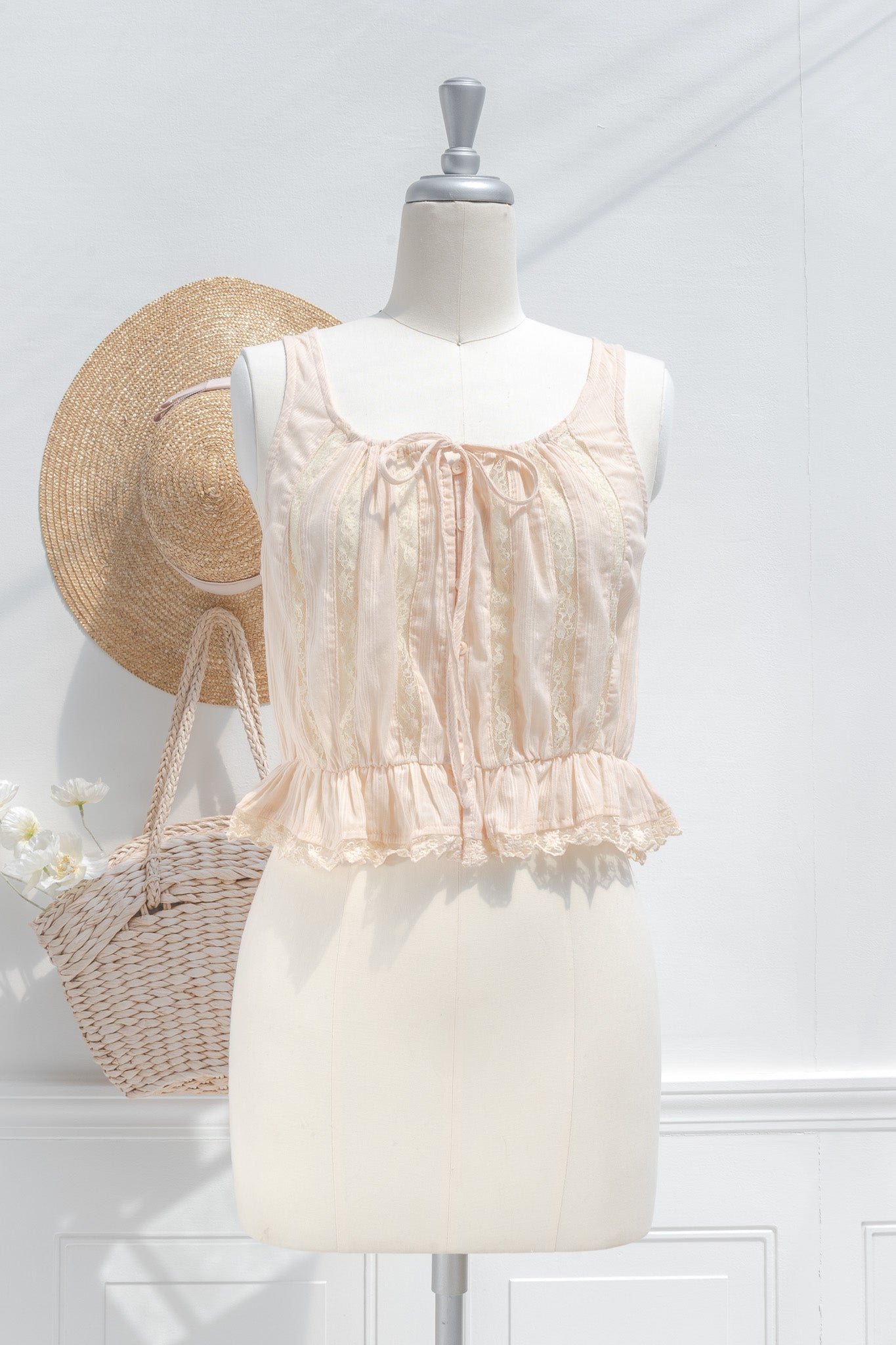 A darling little cropped blouse, the Marie is inspired by Victorian underpinnings and is crafted from 100% cotton. A chemise-style blouse that features a button-up front, elasticated waist, round neckline, sheer lace details, and an adjustable drawstring neckline.