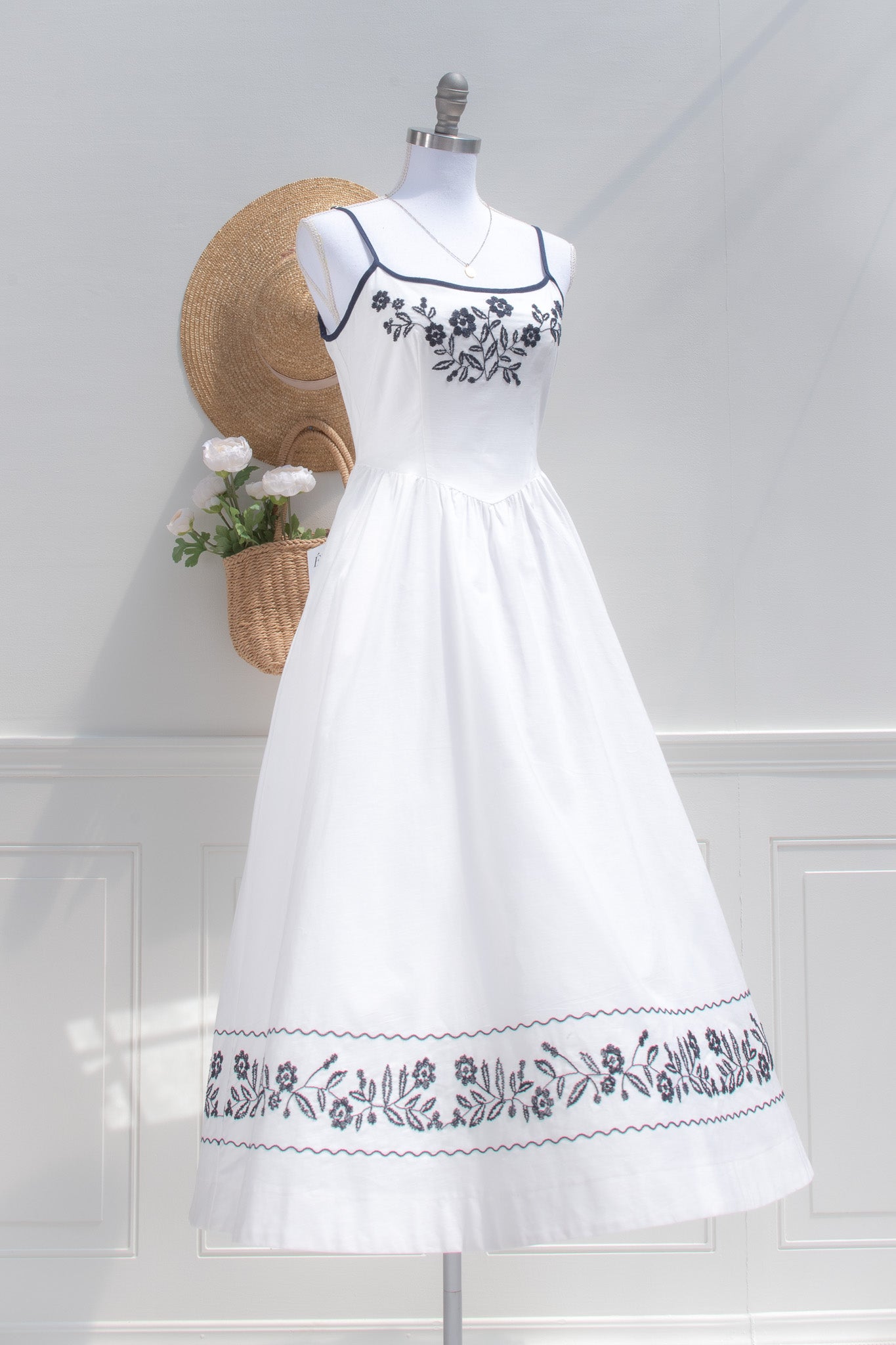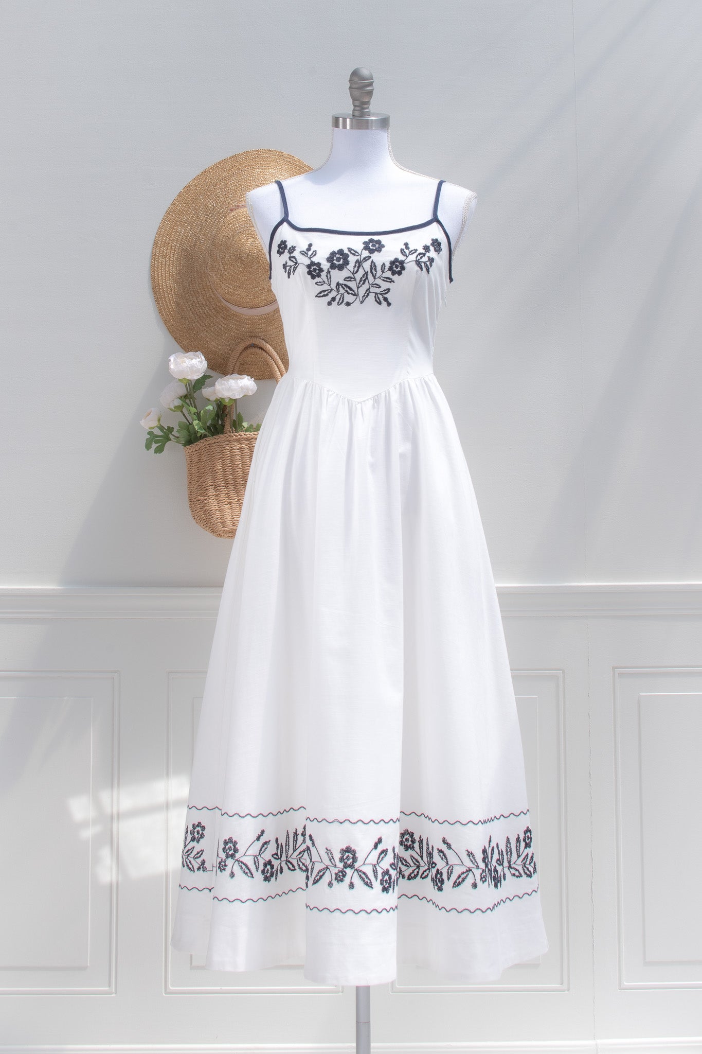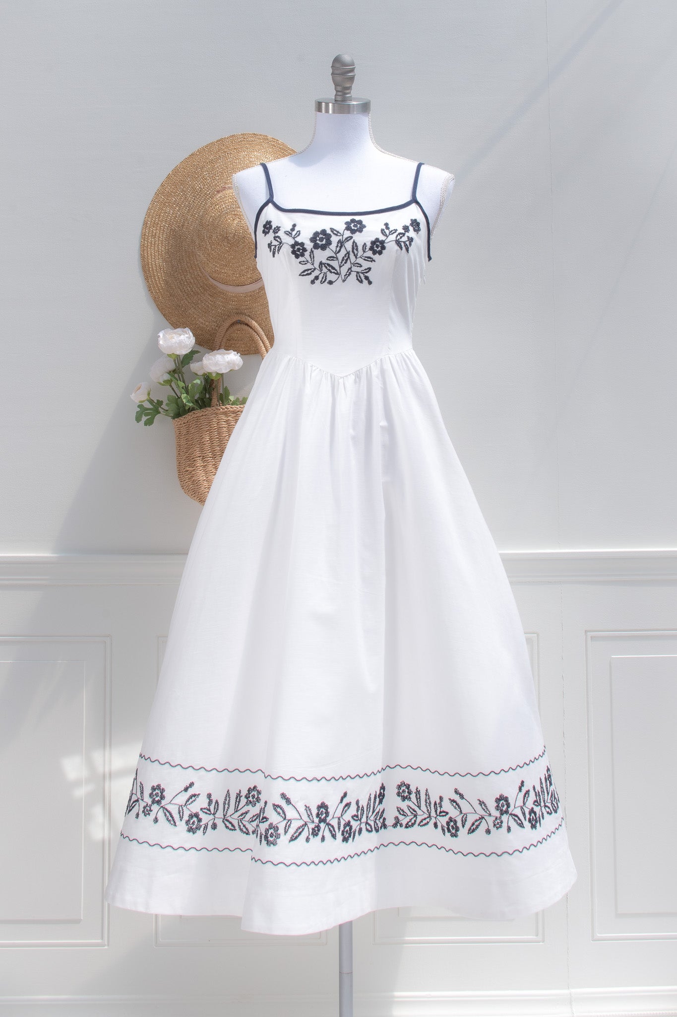 A delightful dress with stunning embroidered details, the Celeste midi is crafted from crisp white cotton and adored with navy blue trim. Reminiscent of the pretty summer sundresses popular in the 1950s, this dress features side-seam pockets, detailed floral embroidery, adjustable shoulder straps, and a key-hole back.