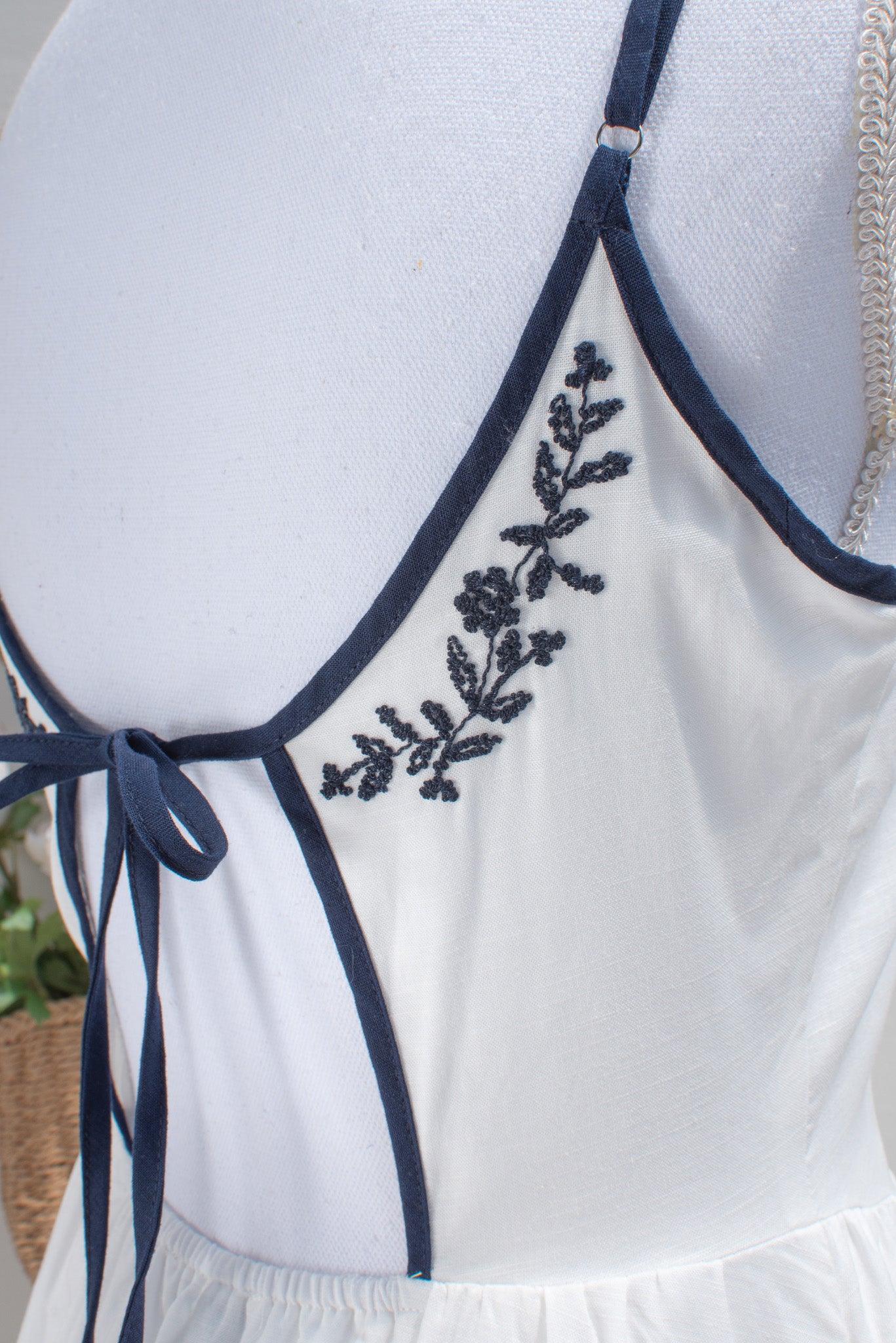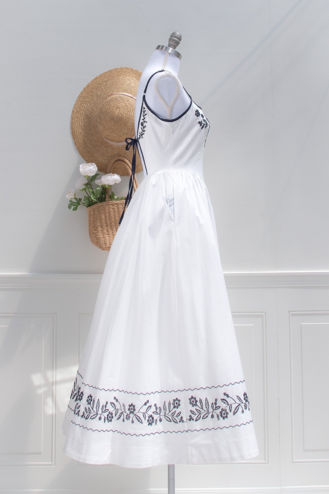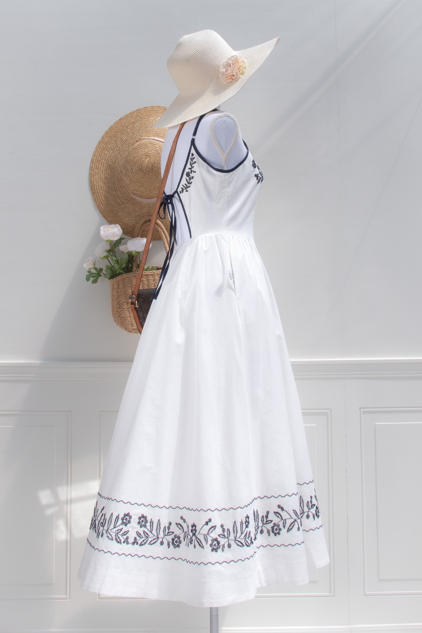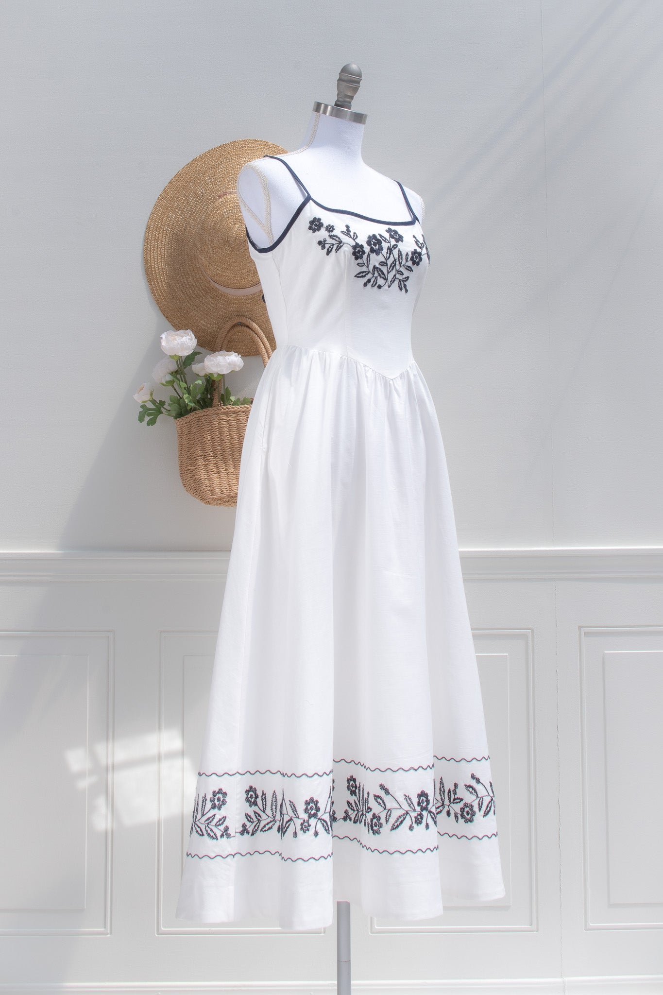 A delightful dress with stunning embroidered details, the Celeste midi is crafted from crisp white cotton and adored with navy blue trim. Reminiscent of the pretty summer sundresses popular in the 1950s, this dress features side-seam pockets, detailed floral embroidery, adjustable shoulder straps, and a key-hole back.