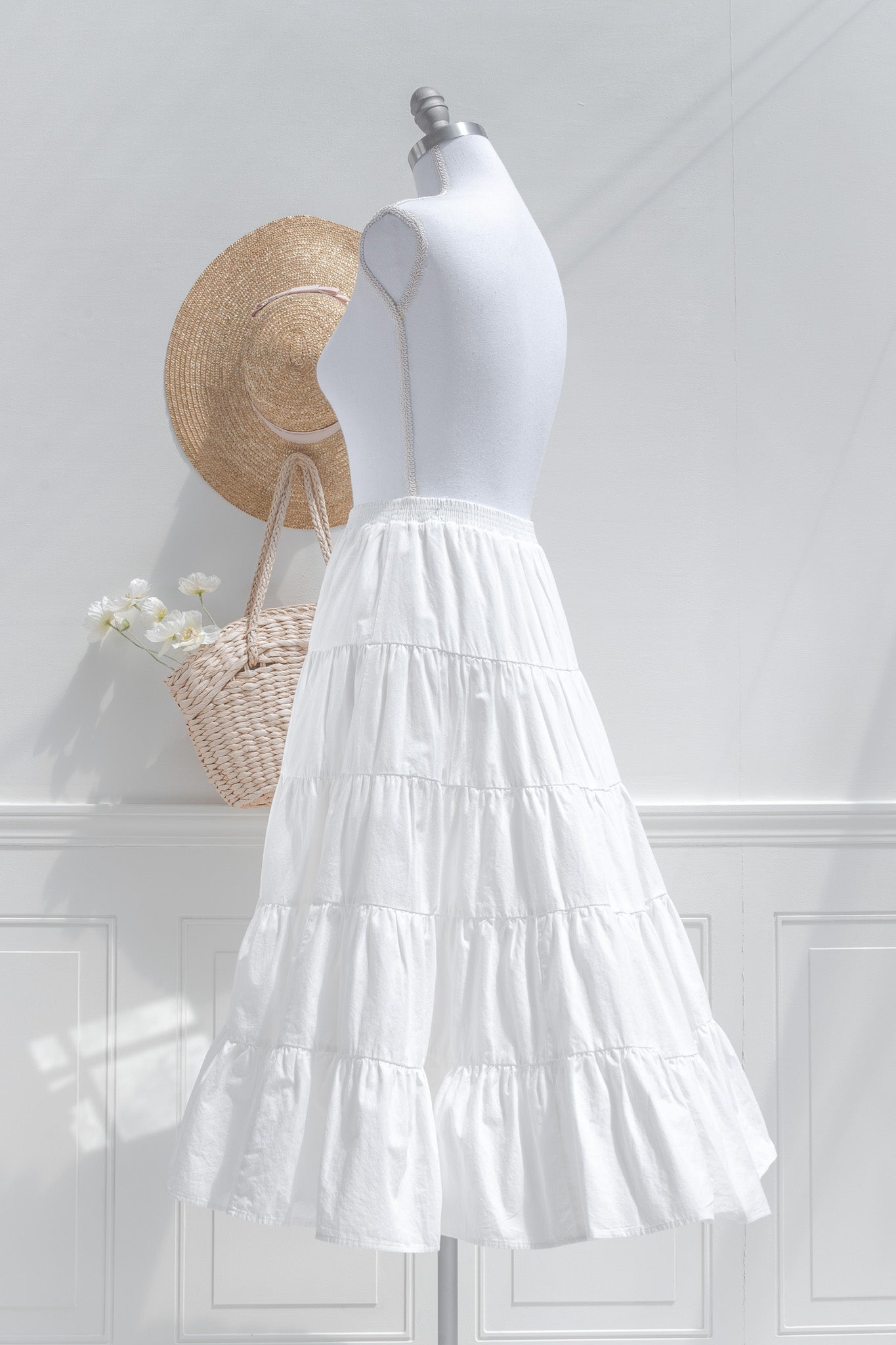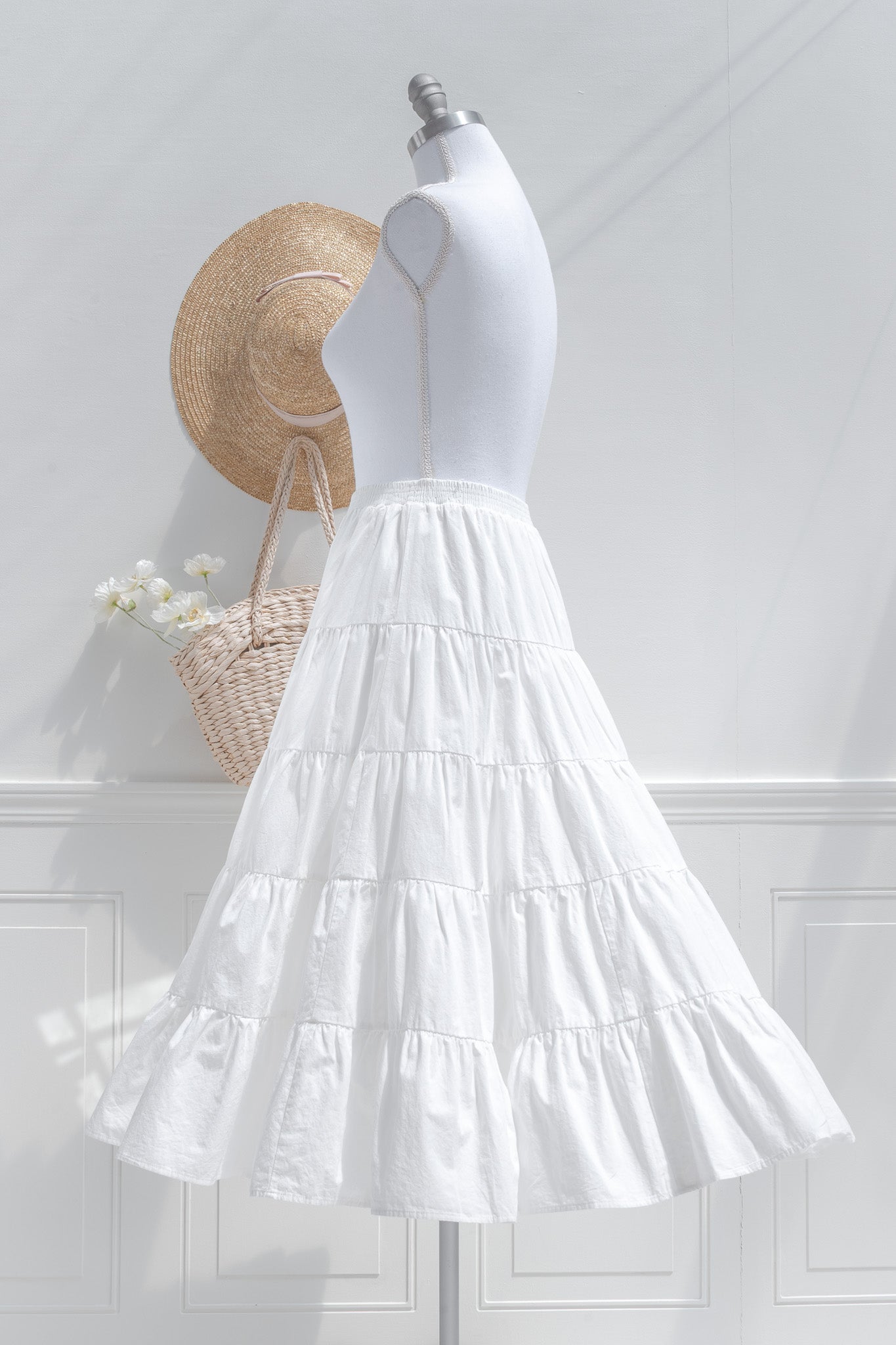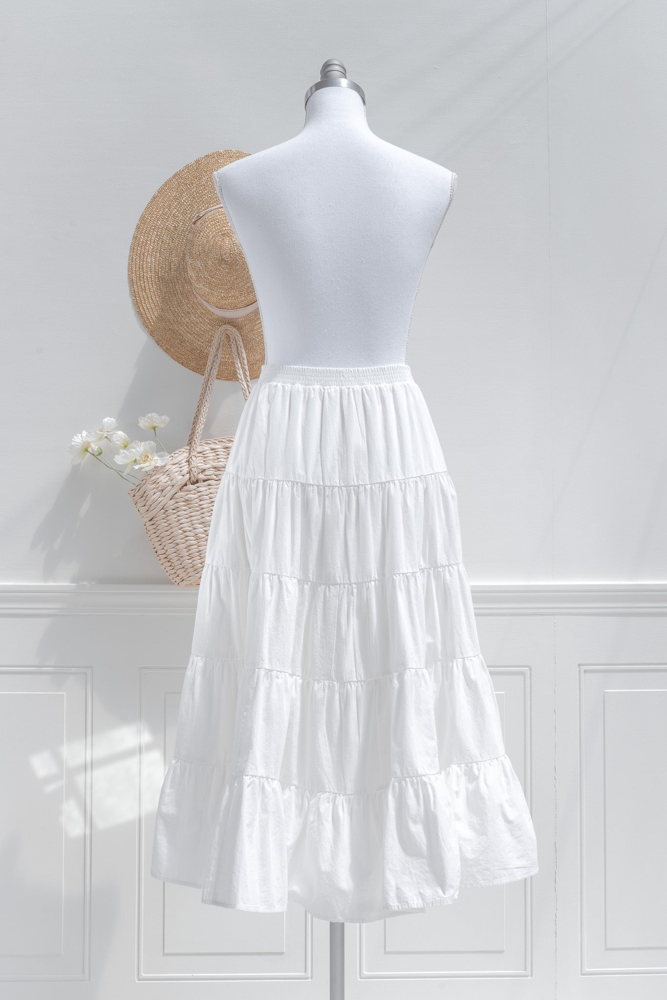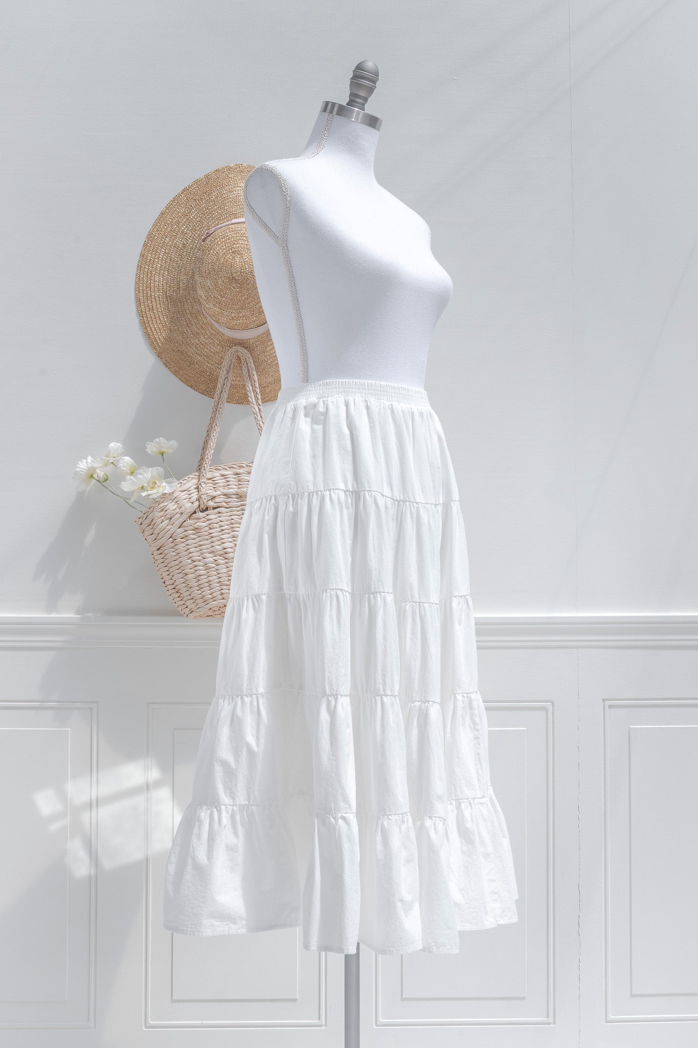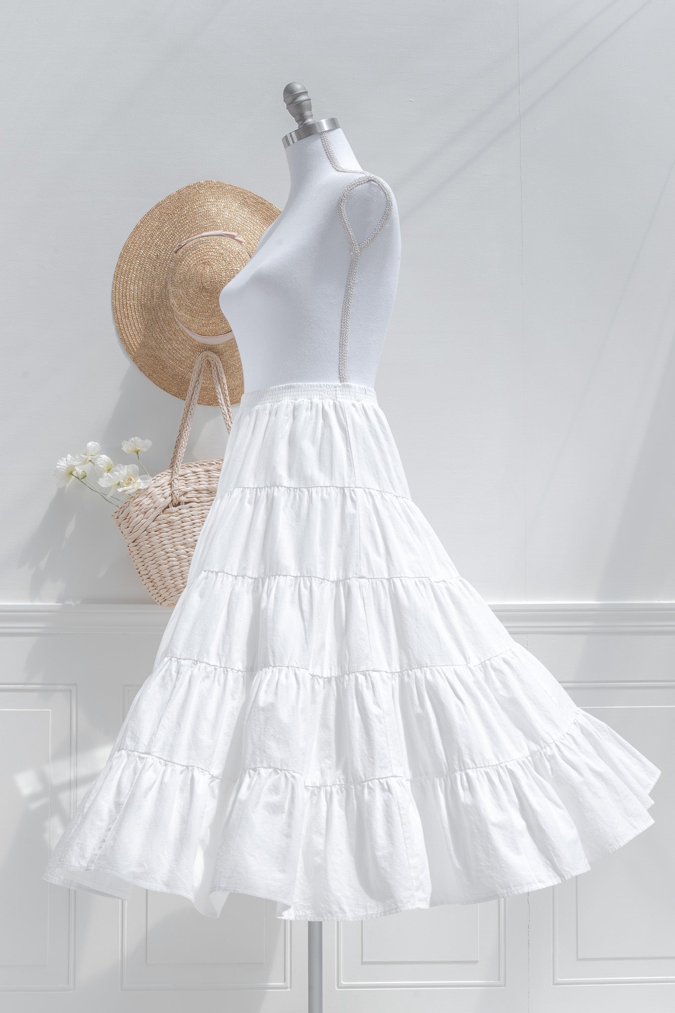 A summer wardrobe staple, the Lucy skirt falls in four generous tiered layers that build into a full, sweeping tea-length silhouette with just enough volume to catch the breeze. Made for twirling in the sun somewhere in the south of France.
