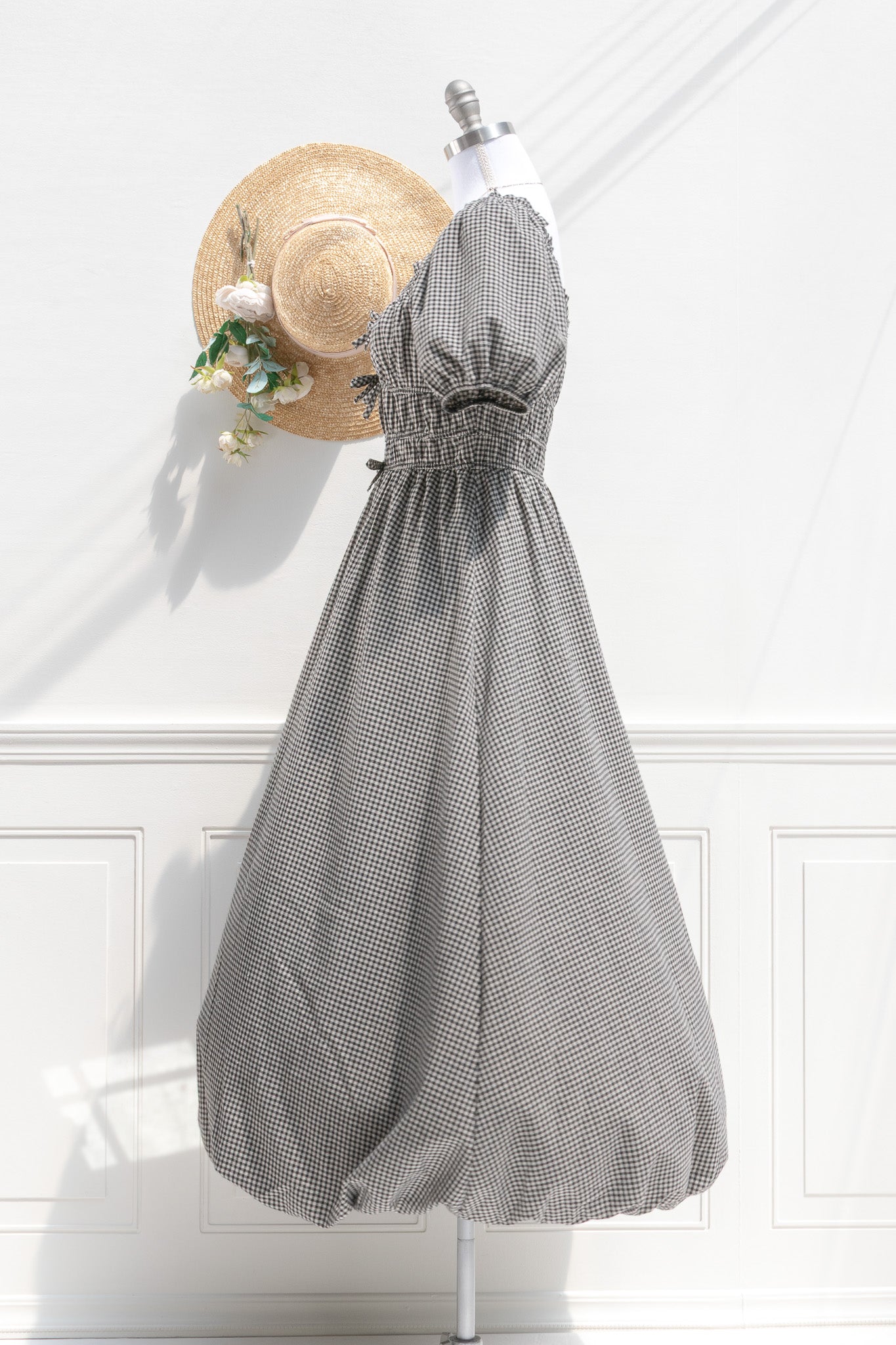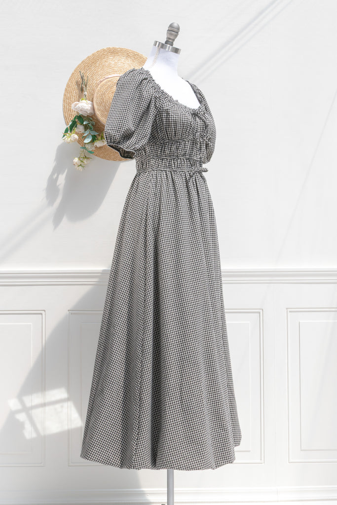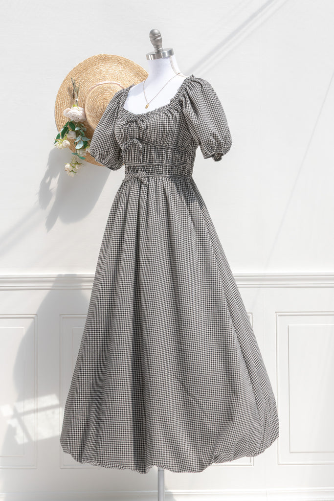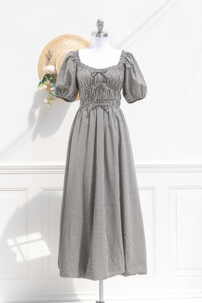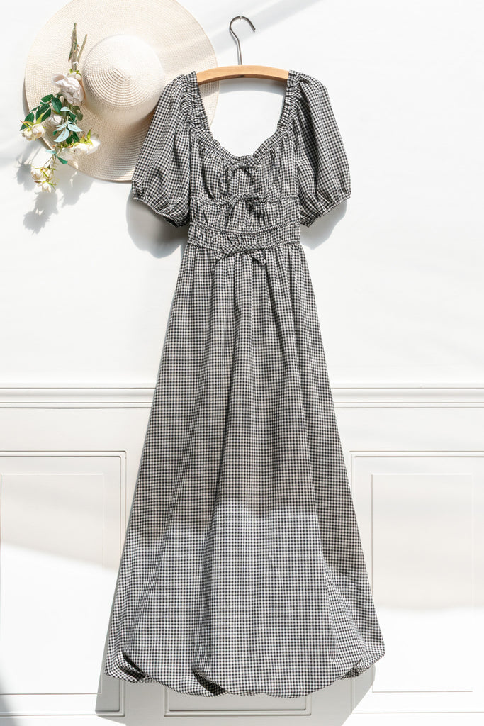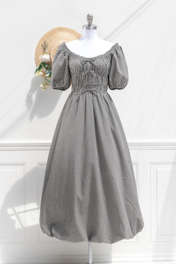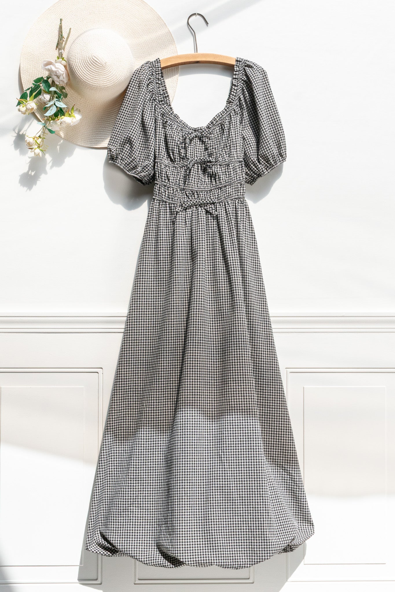 A romantic French-style gingham midi in black and ivory. Puff sleeves frame a sweetheart neckline with petit bows, while a double-shirred waist defines the figure.