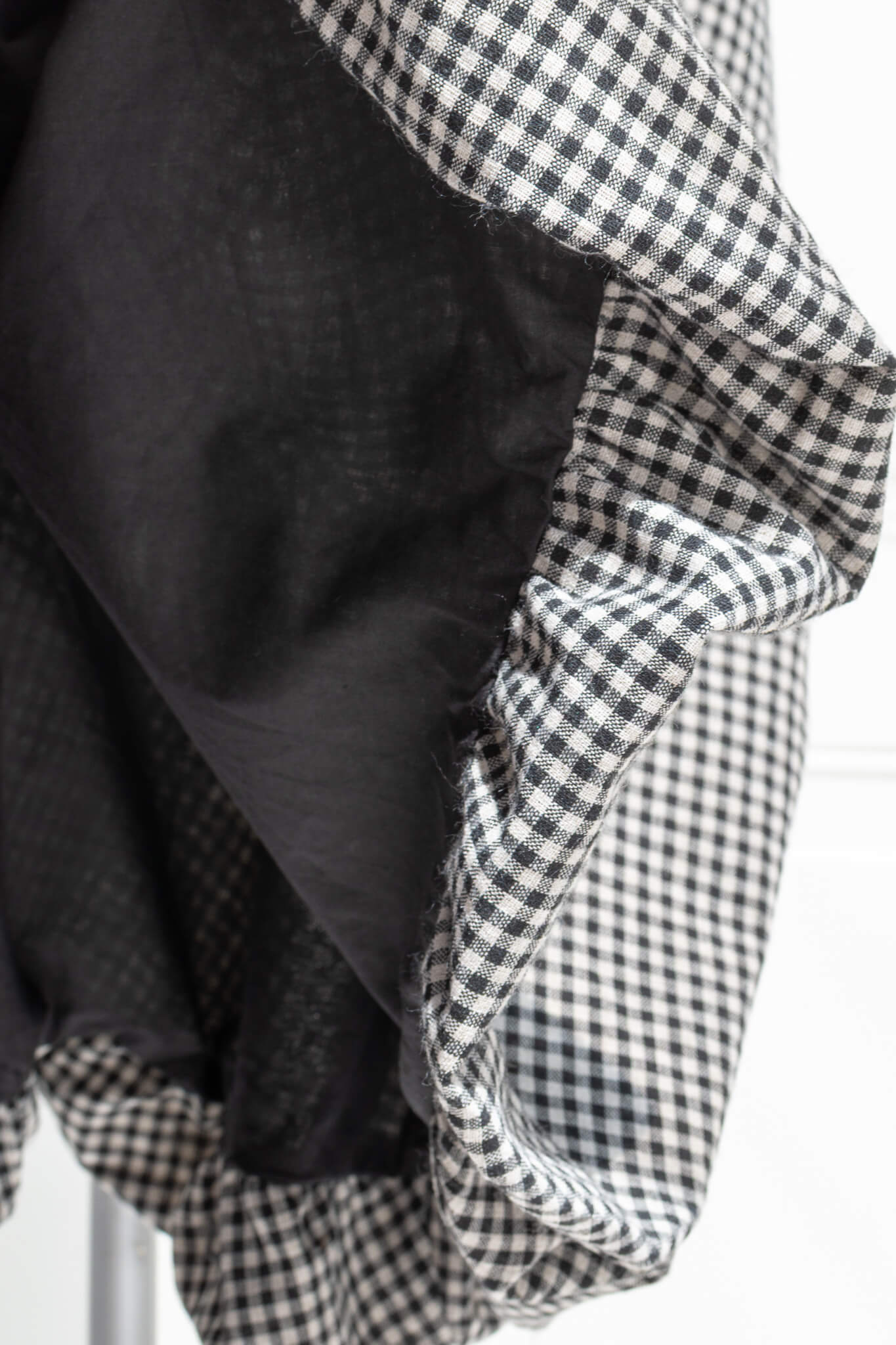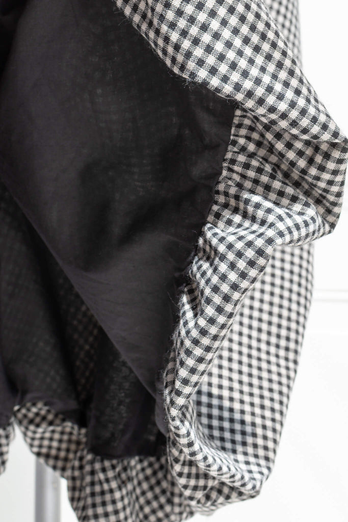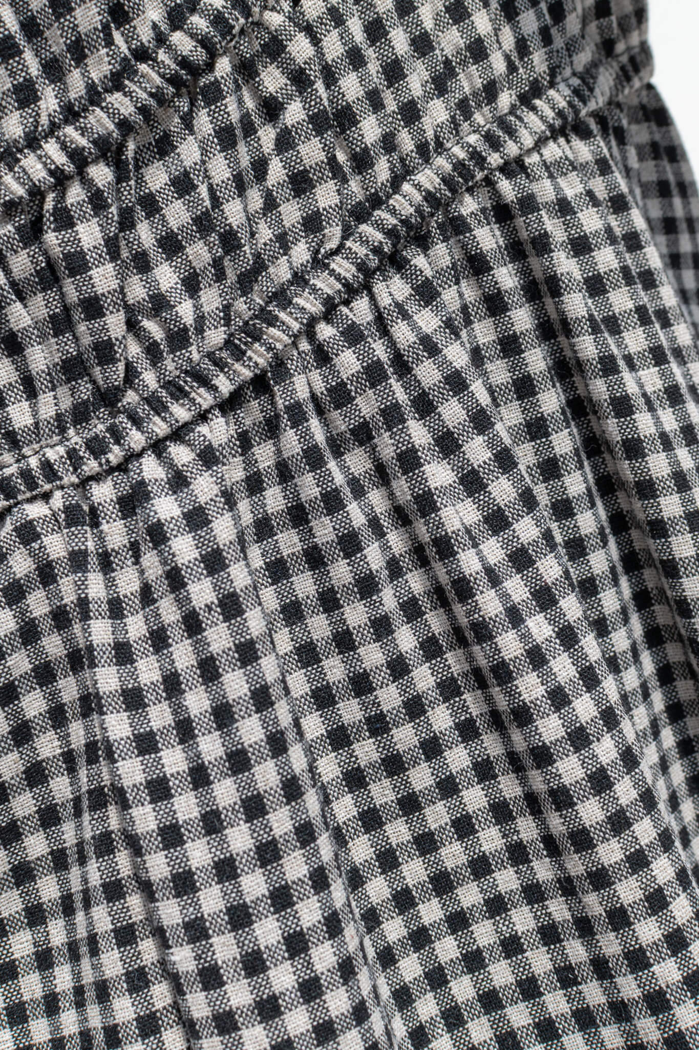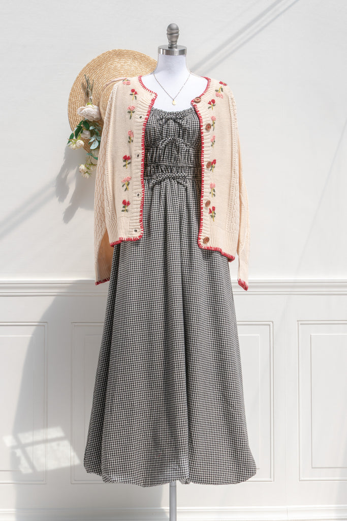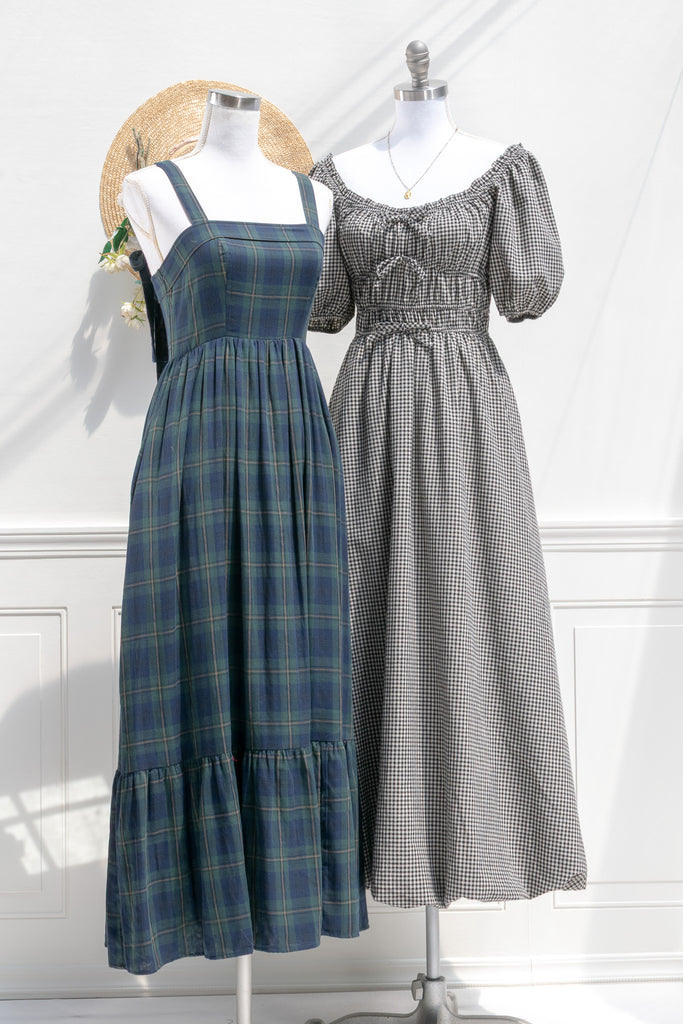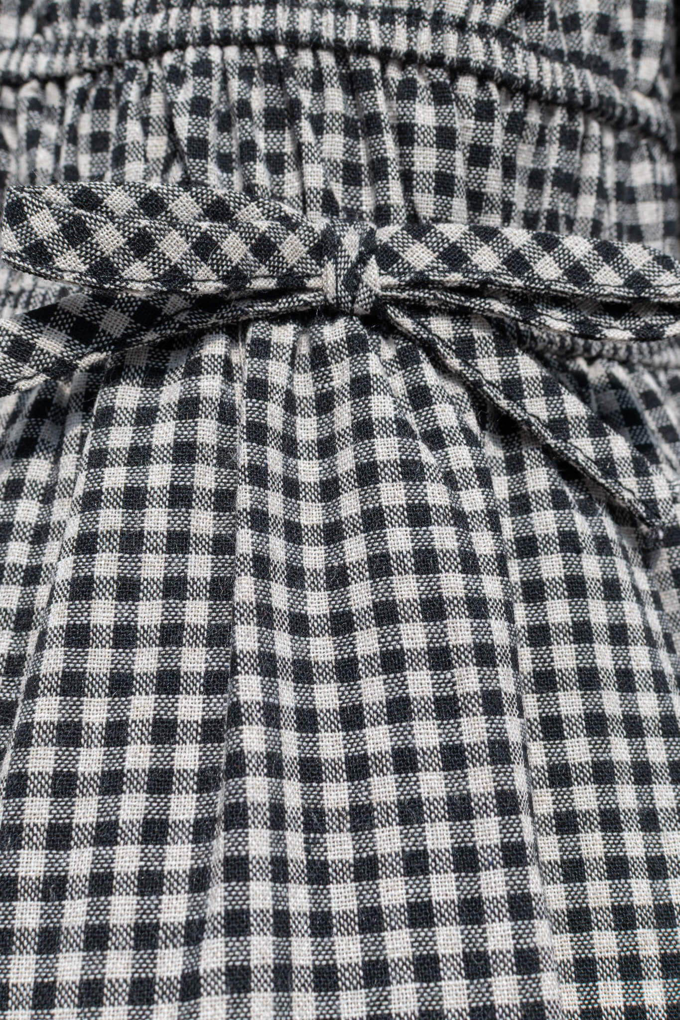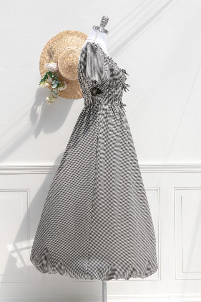 A romantic French-style gingham midi in black and ivory. Puff sleeves frame a sweetheart neckline with petit bows, while a double-shirred waist defines the figure.