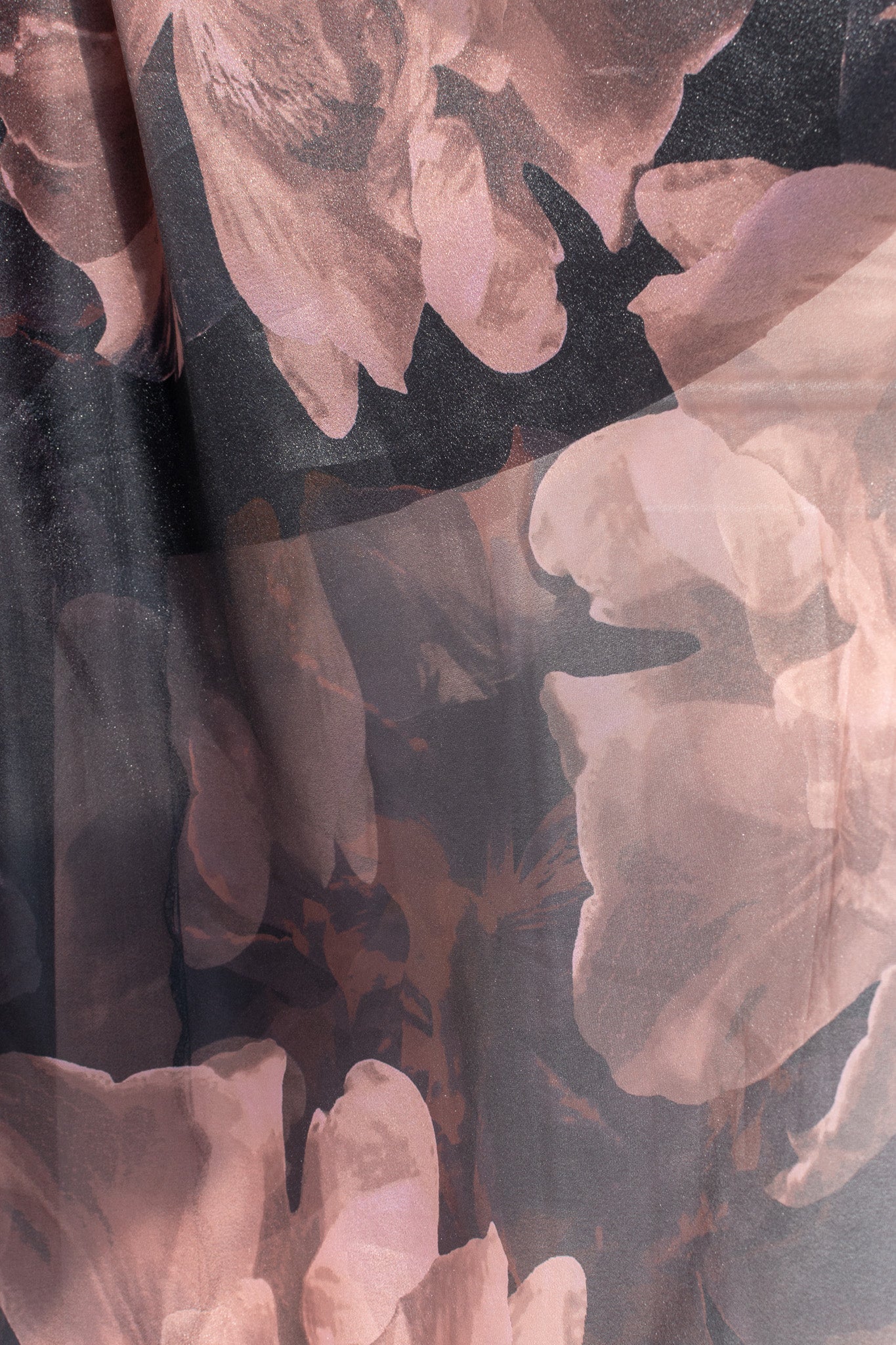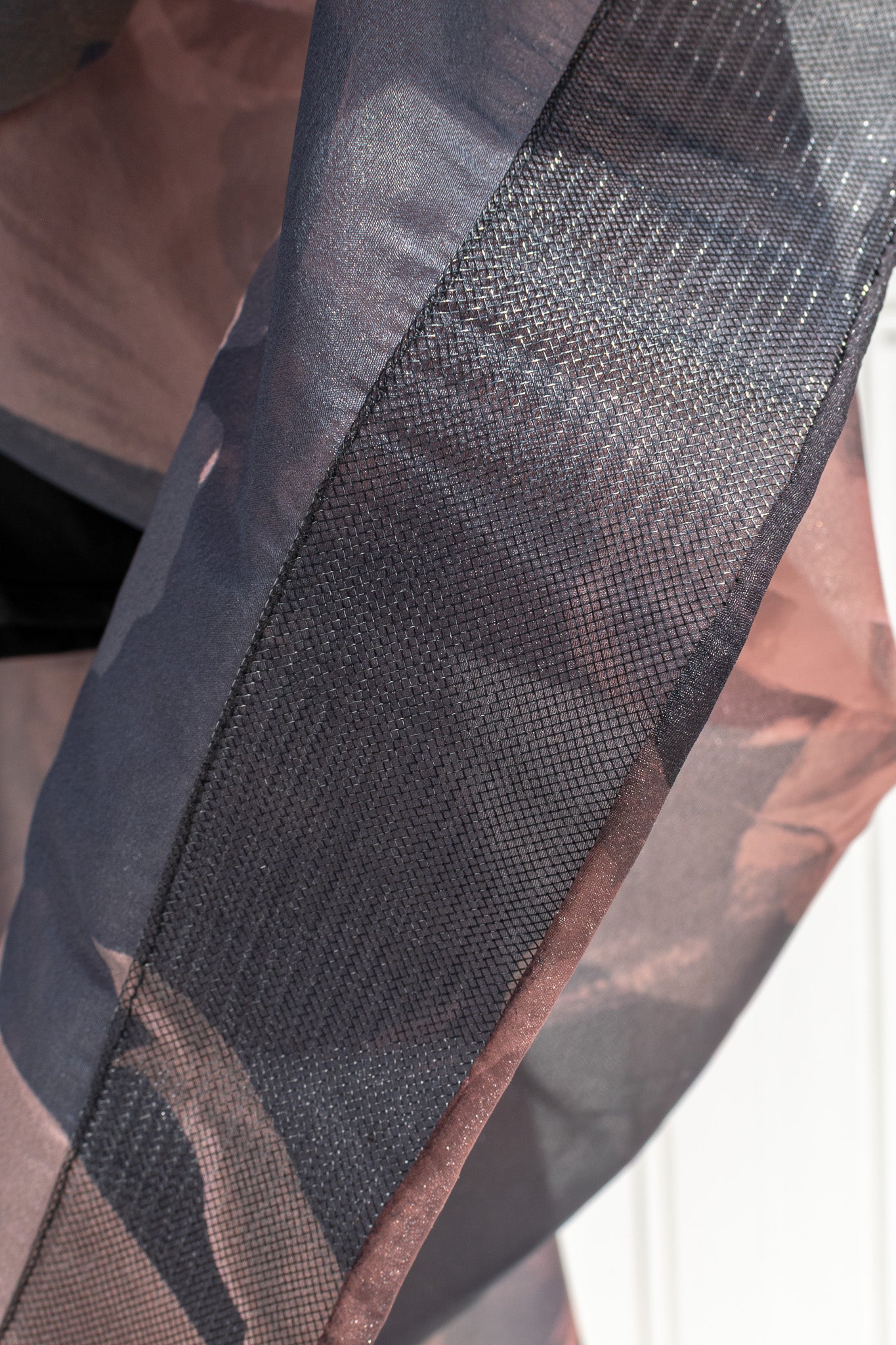 A little theatre for autumn nights. The Delaney drapes in abstract-floral organza that seems to float with every step. Velvet piping traces the neckline and bodice, while tie shoulders let you adjust the fit and add a bow-tied finish. A sheer skirt glides over a soft lining, and a hidden horsehair hem lends graceful structure so the silhouette keeps its sweep. From gallery openings to holiday fêtes, Delaney brings romance—and movement—to the room.