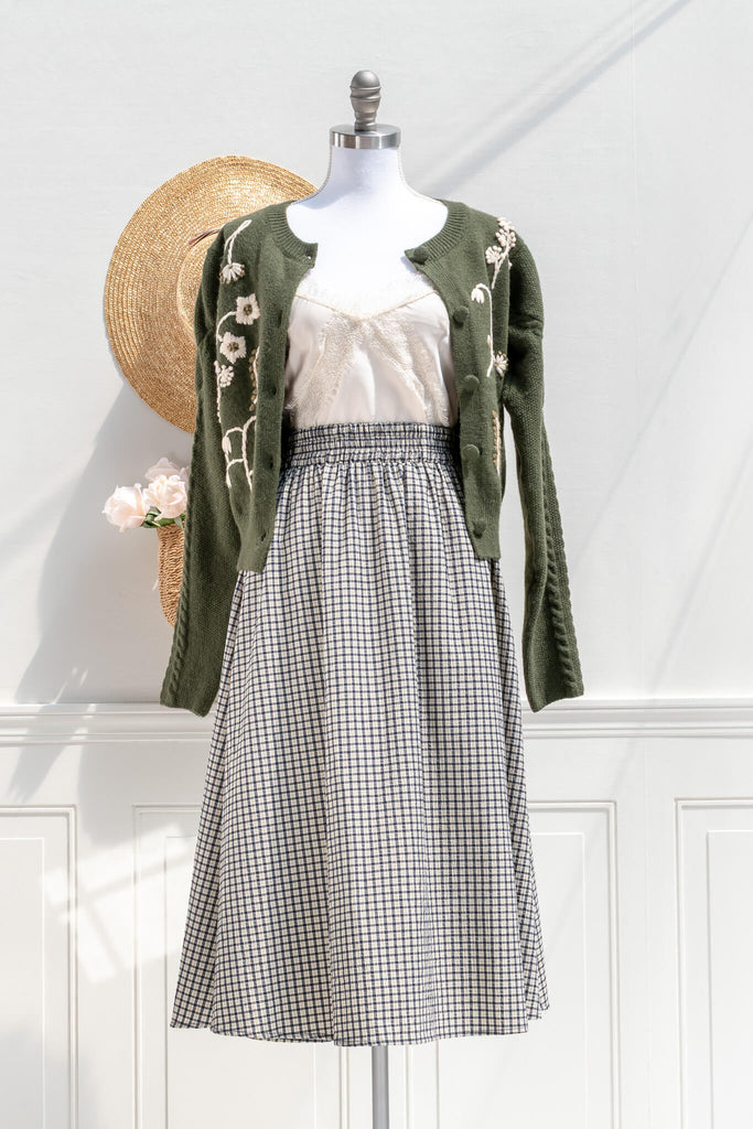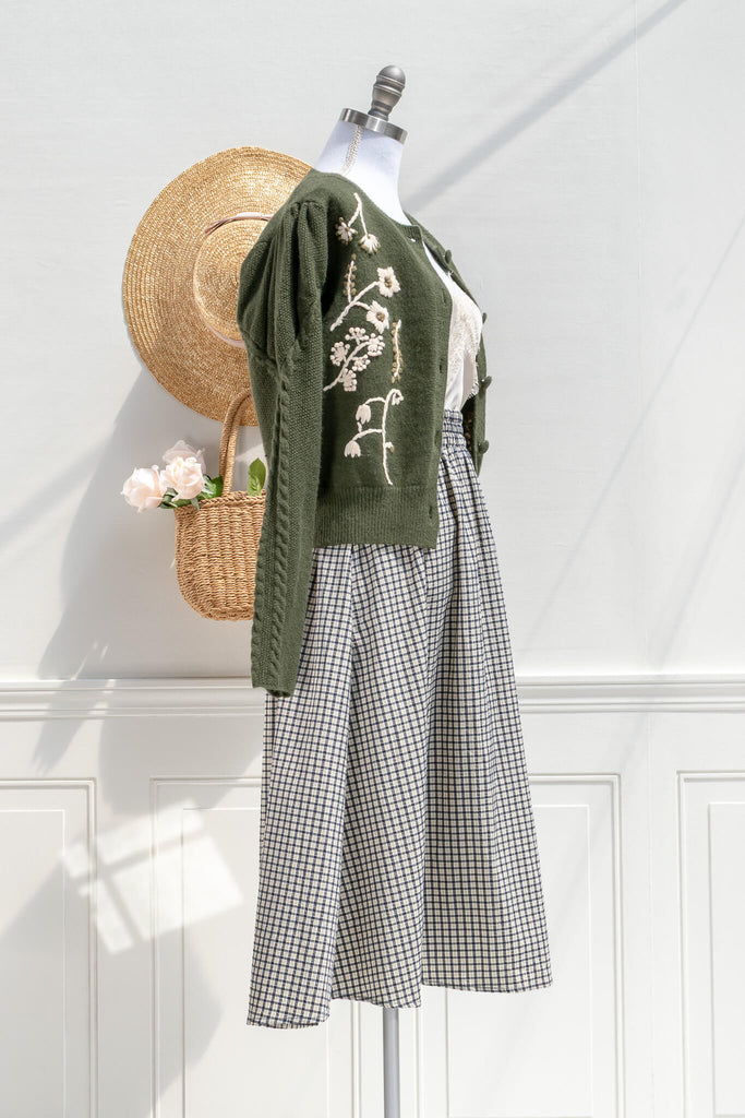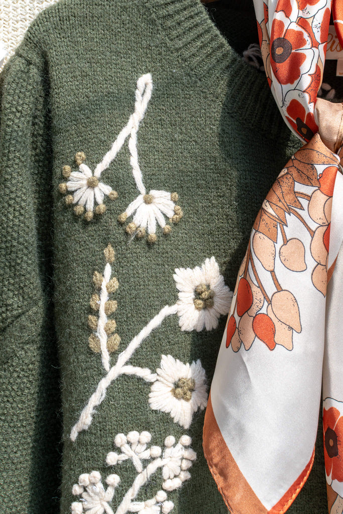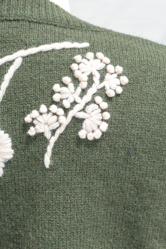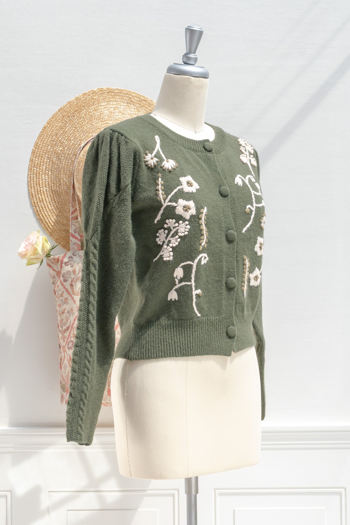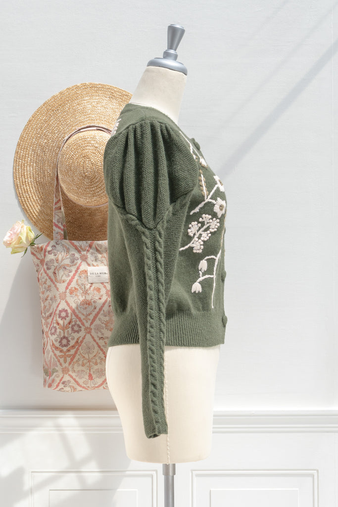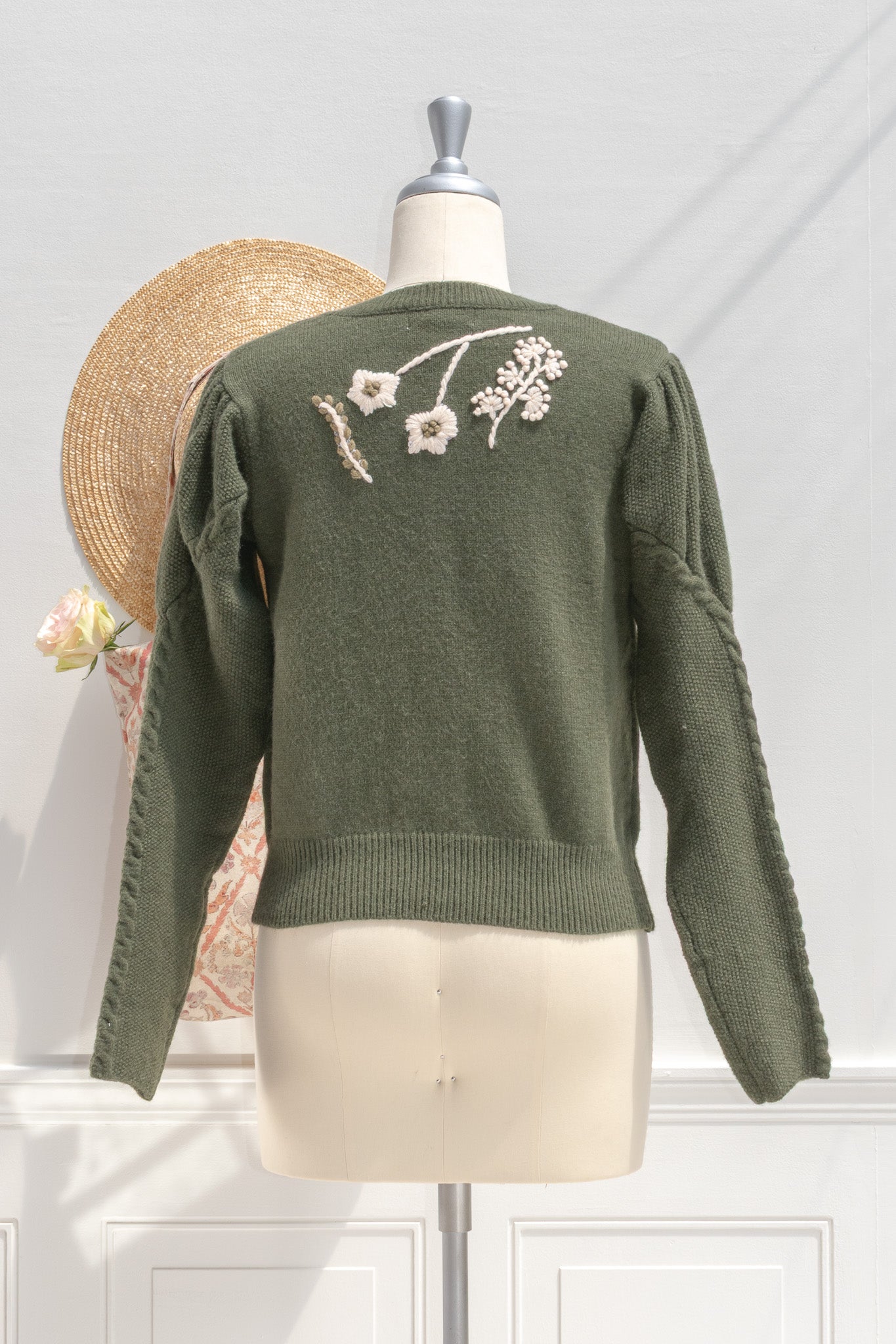 A romantic French-style cardigan in woodland green, adorned with cream floral embroidery and finished with covered buttons. The round neckline, subtle puff sleeves with cable detail, and cropped ribbed hem create a softly tailored silhouette that layers beautifully over dresses or denim from late summer into fall. Scarf not included.