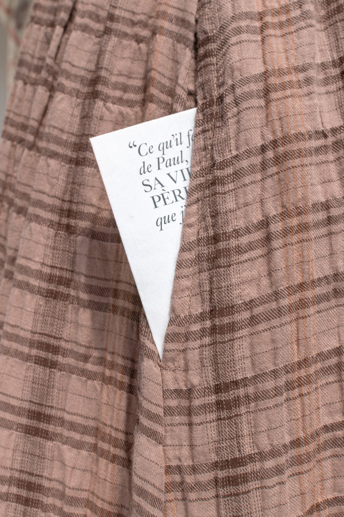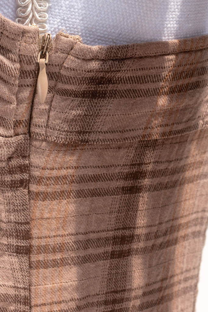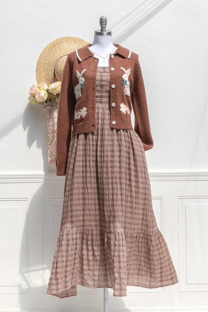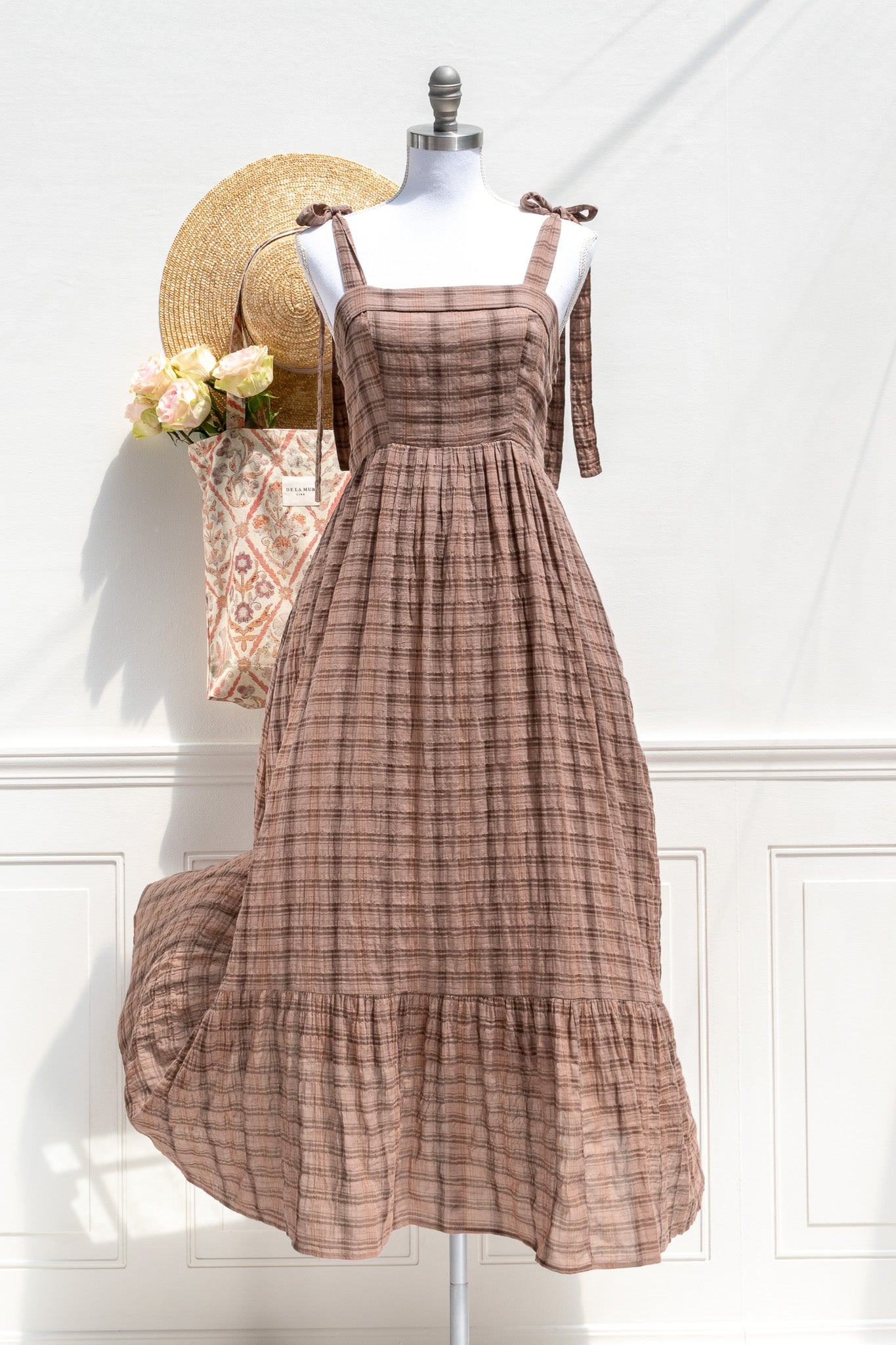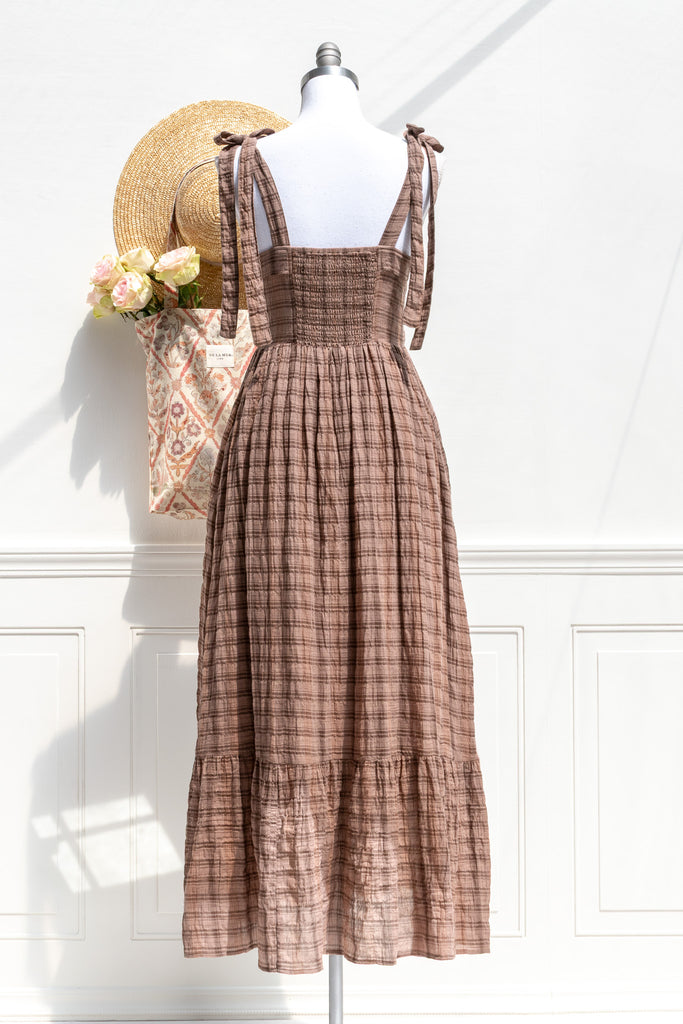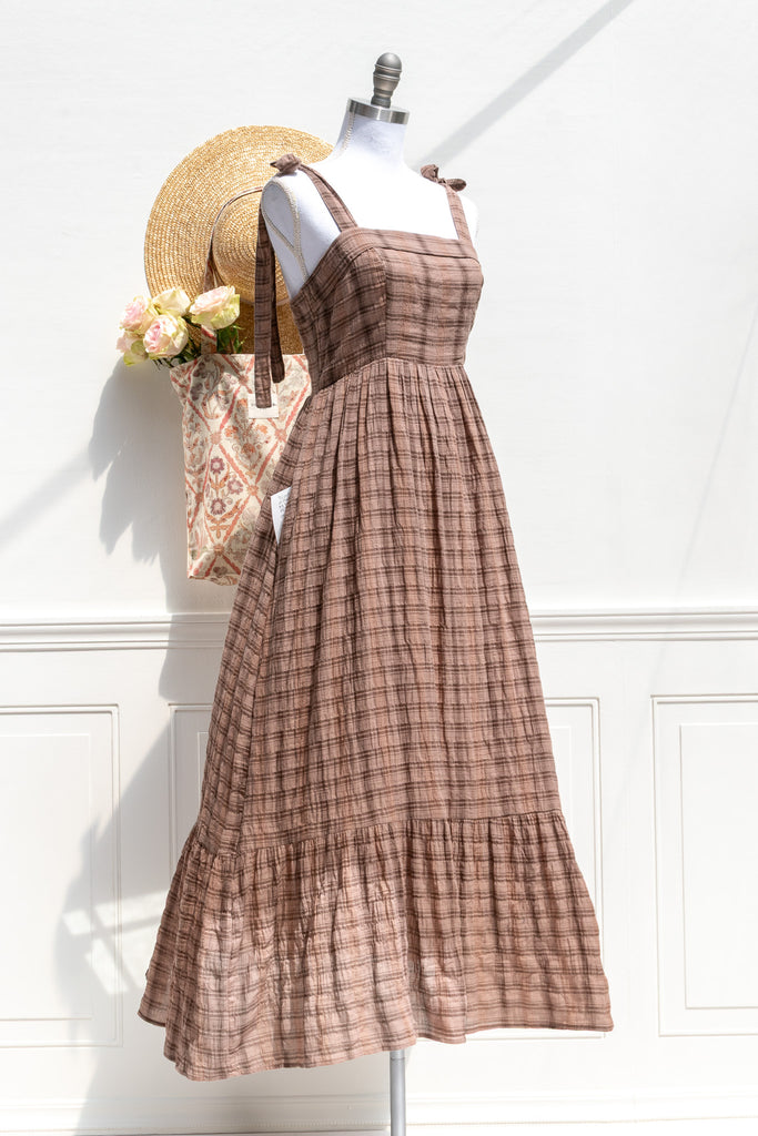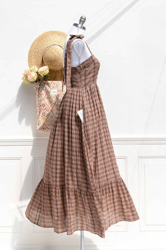 A favorite for this fall, this 100% cotton tie-strap midi in warm chestnut plaid features a square neckline, flowy A-line skirt with ruffled hem, and side-seam pockets for everyday ease.