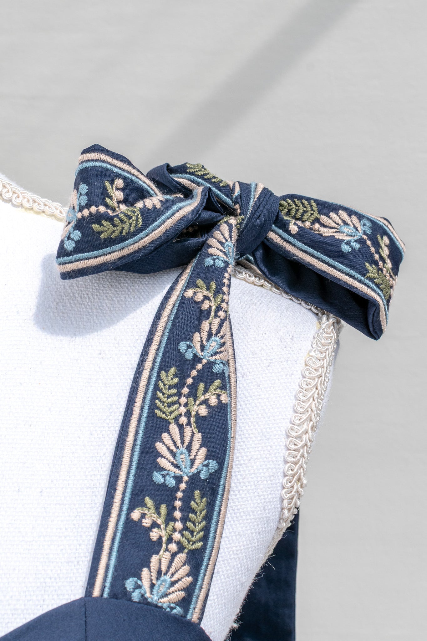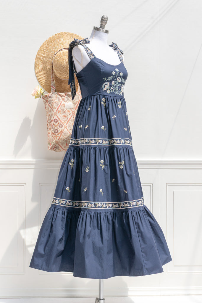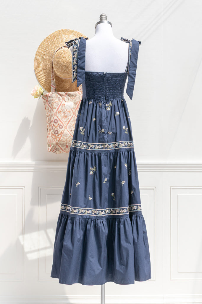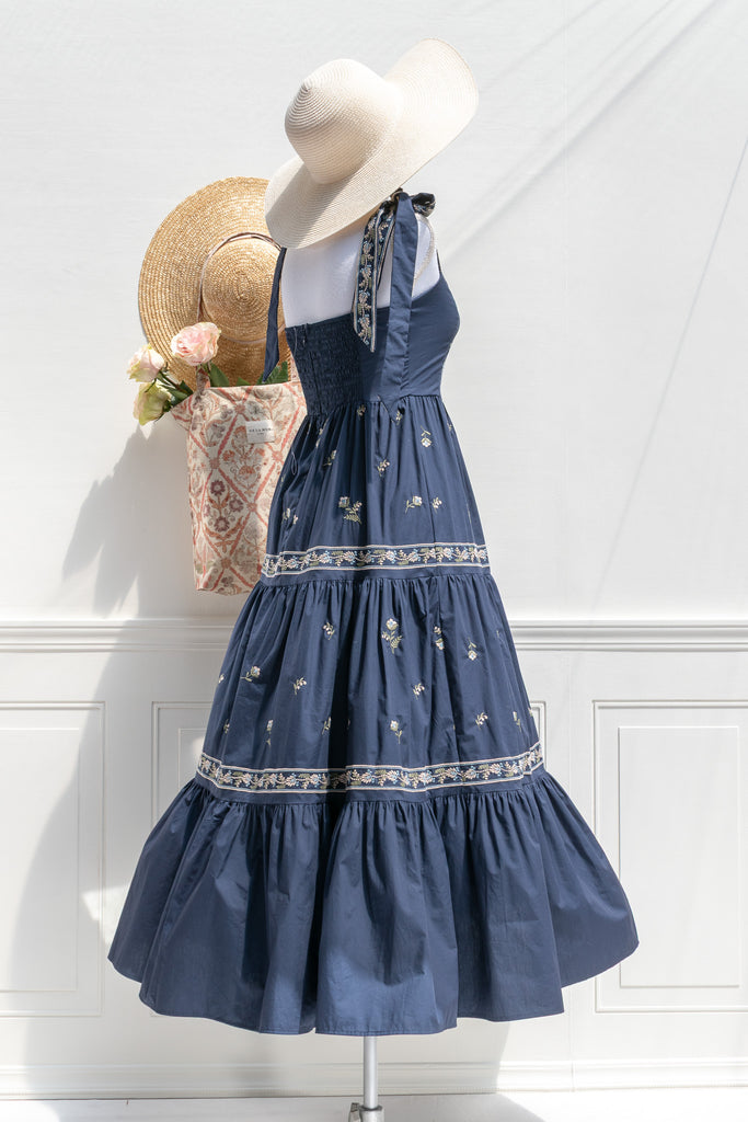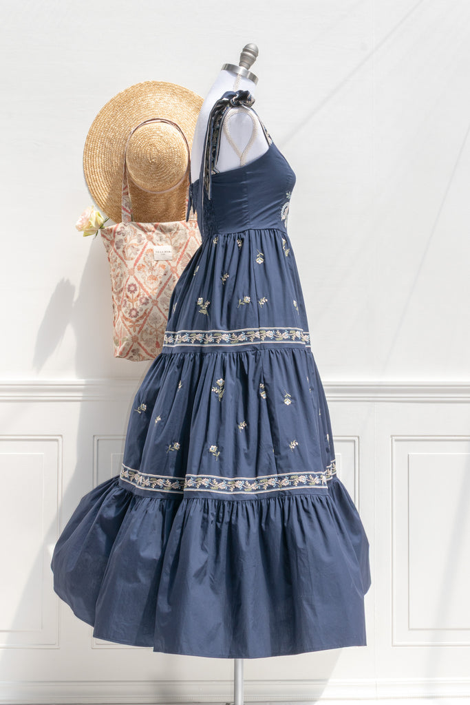 A romantic folk-inspired maxi, the Folkflower dress in navy cotton is designed for the shift from sunlit summer days to crisp autumn afternoons.