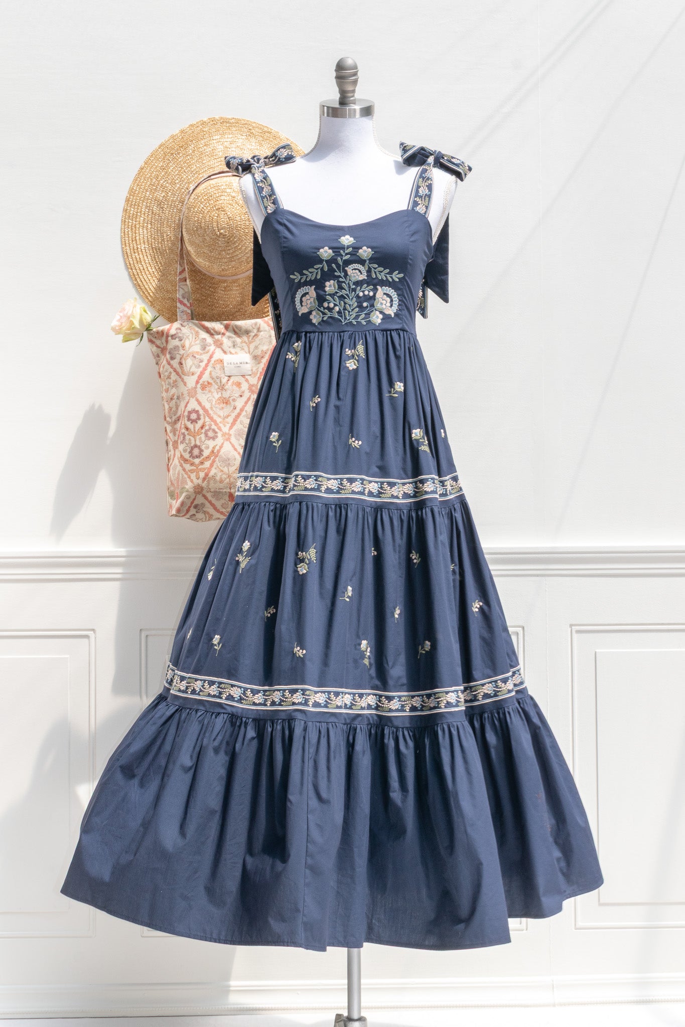 Featuring delicate floral embroidery, bow-tied straps, and a tiered skirt that layers beautifully with a cardigan, this dress captures effortless whimsy and charm.