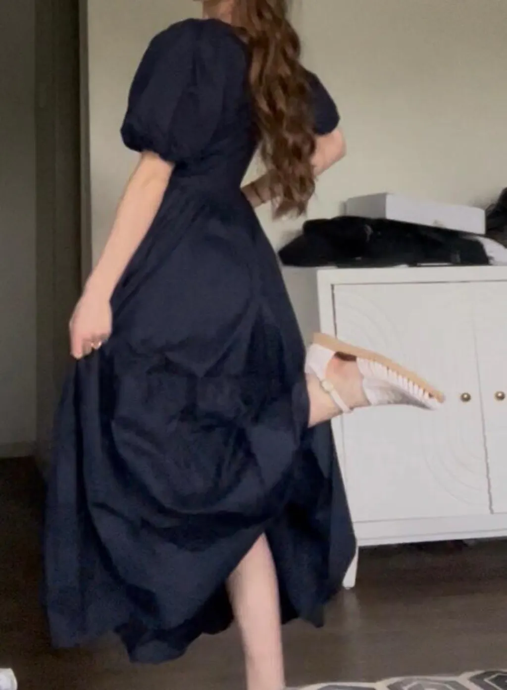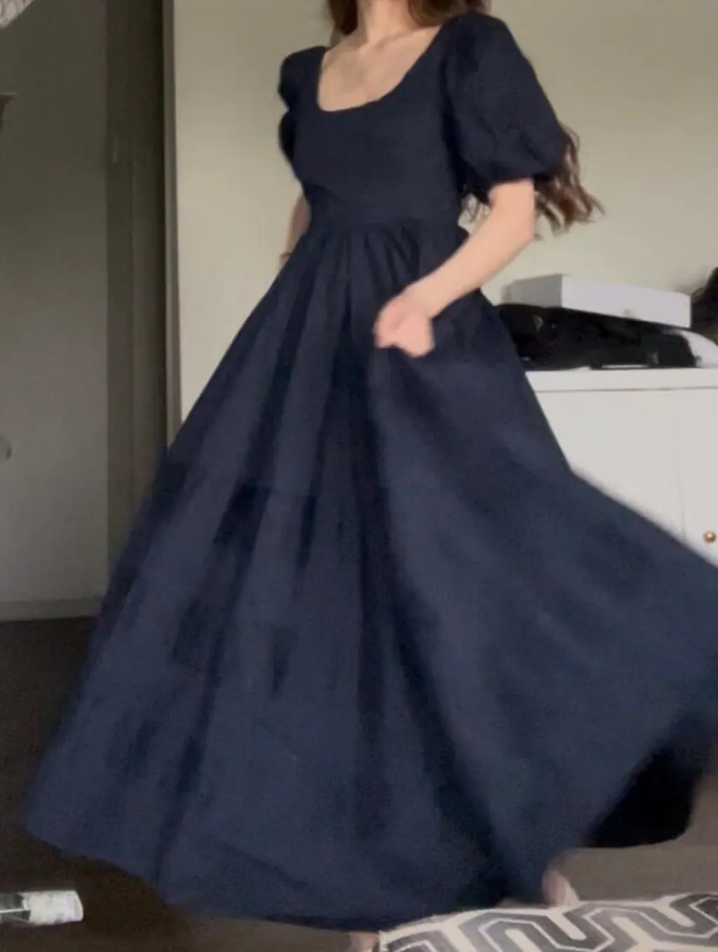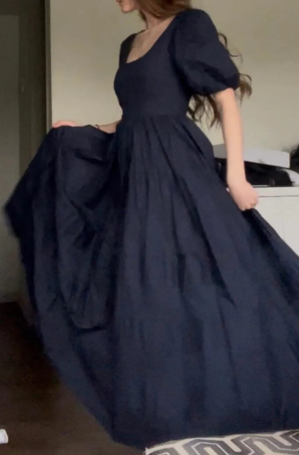 The navy tone feels timeless and polished, balanced by the airy lightness of cotton. Side-seam pockets bring practicality without interrupting the silhouette. Elegant yet playful, it’s a dress made for long afternoons, travel, and twirling in warm light. Runs small and has no stretch — please check measurements before selecting your size.