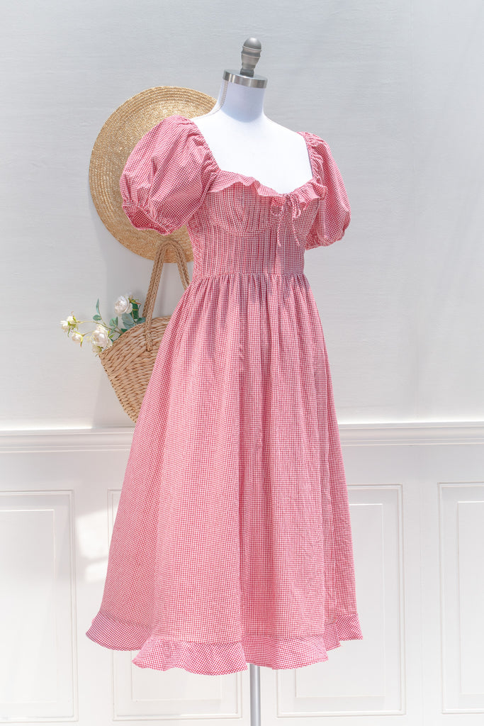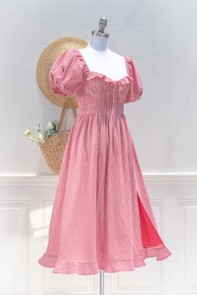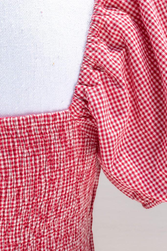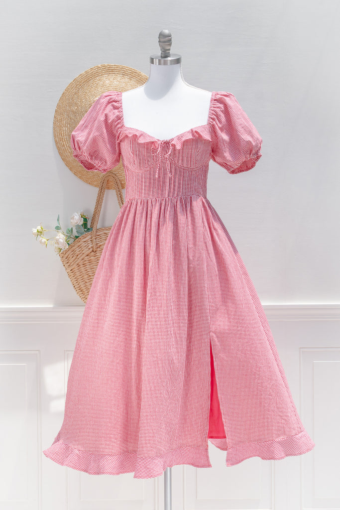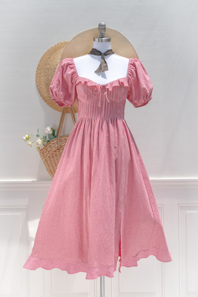 Our most darling dress of the season, the Betsy is picnic-perfect! Features 100% red-and-white cotton gingham, pin-tuck details, puffed sleeves, a side slit, and flattering sweetheart neckline.