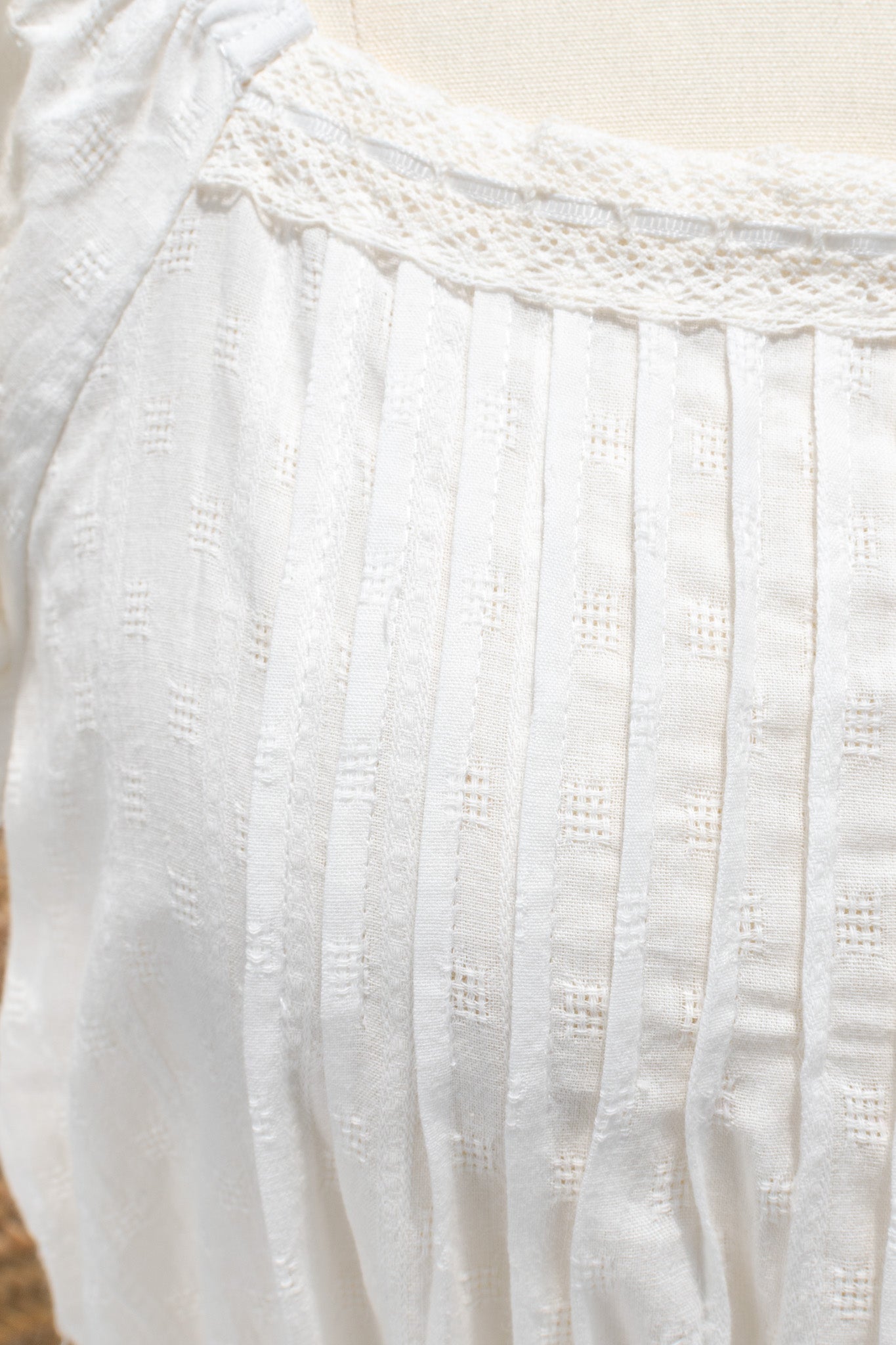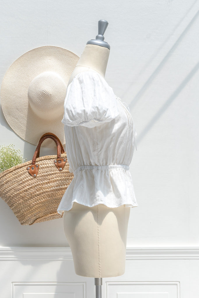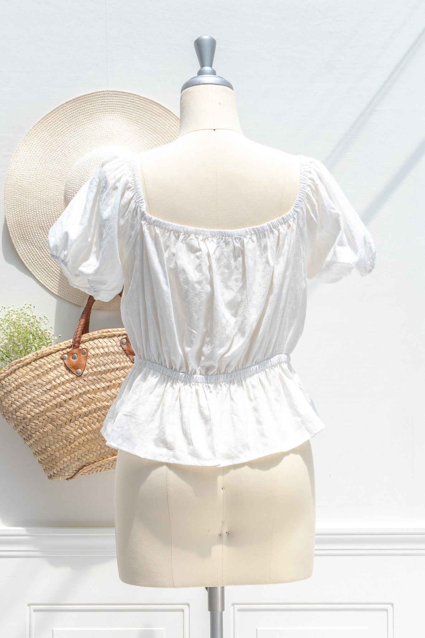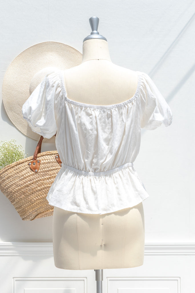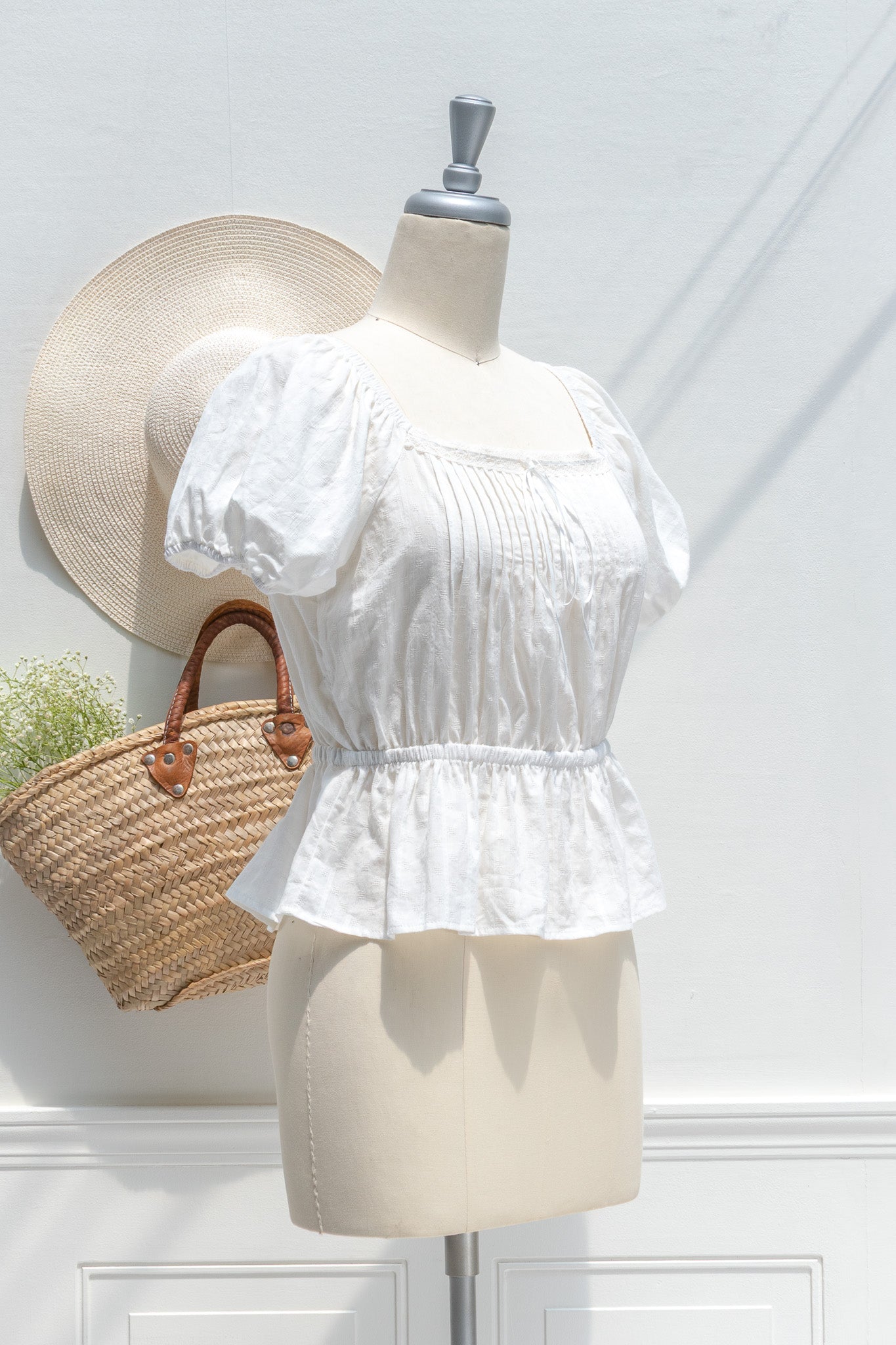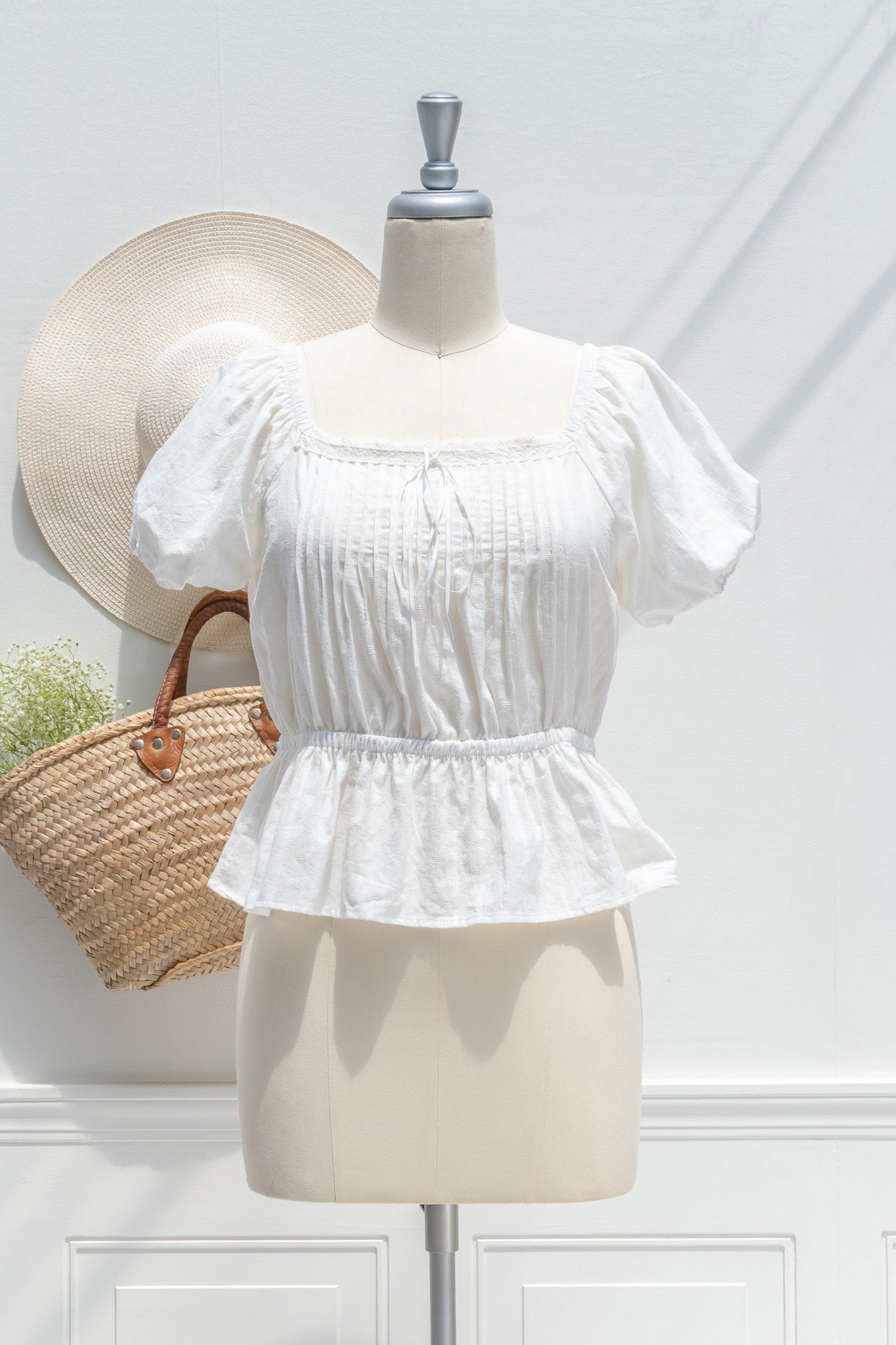 Simple and sweet, the Esmé blouse in 100% cotton is sure to be a capsule wardrobe staple. Features a square neckline, short sleeves, peplum hem, and pintuck details.