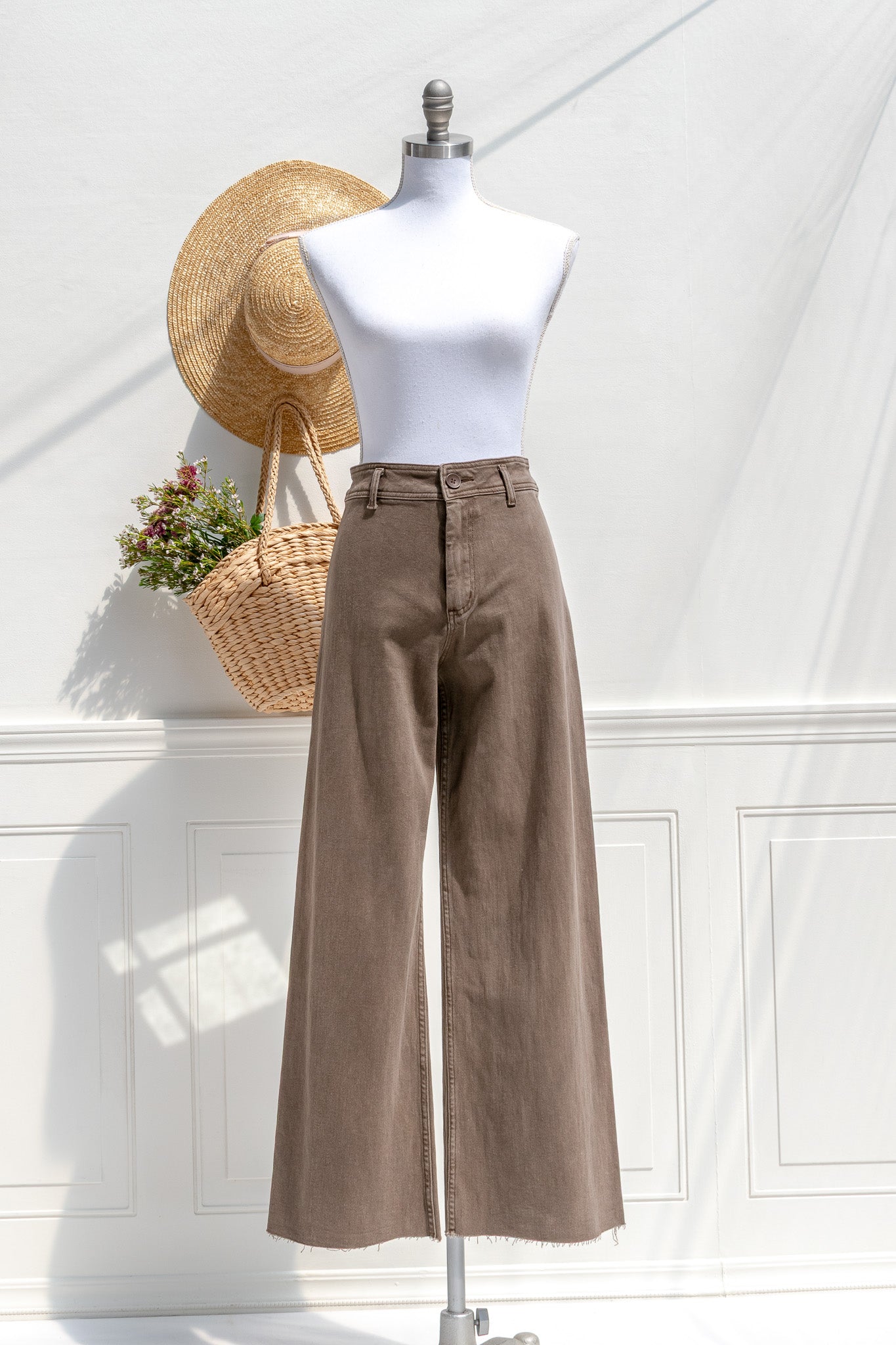 City-easy, French-chic. The Willow wide-leg jeans in soft cocoa brown brings a refined take on denim with a high-rise waist, straight cut through the hip, and a full wide leg that skims rather than clings. A hint of stretch keeps them comfortable from desk to dinner, while pockets and a raw hem add nonchalant edge. Pair with cardigans, blouses, or a tucked-in tee for effortless fall outfitting.